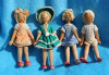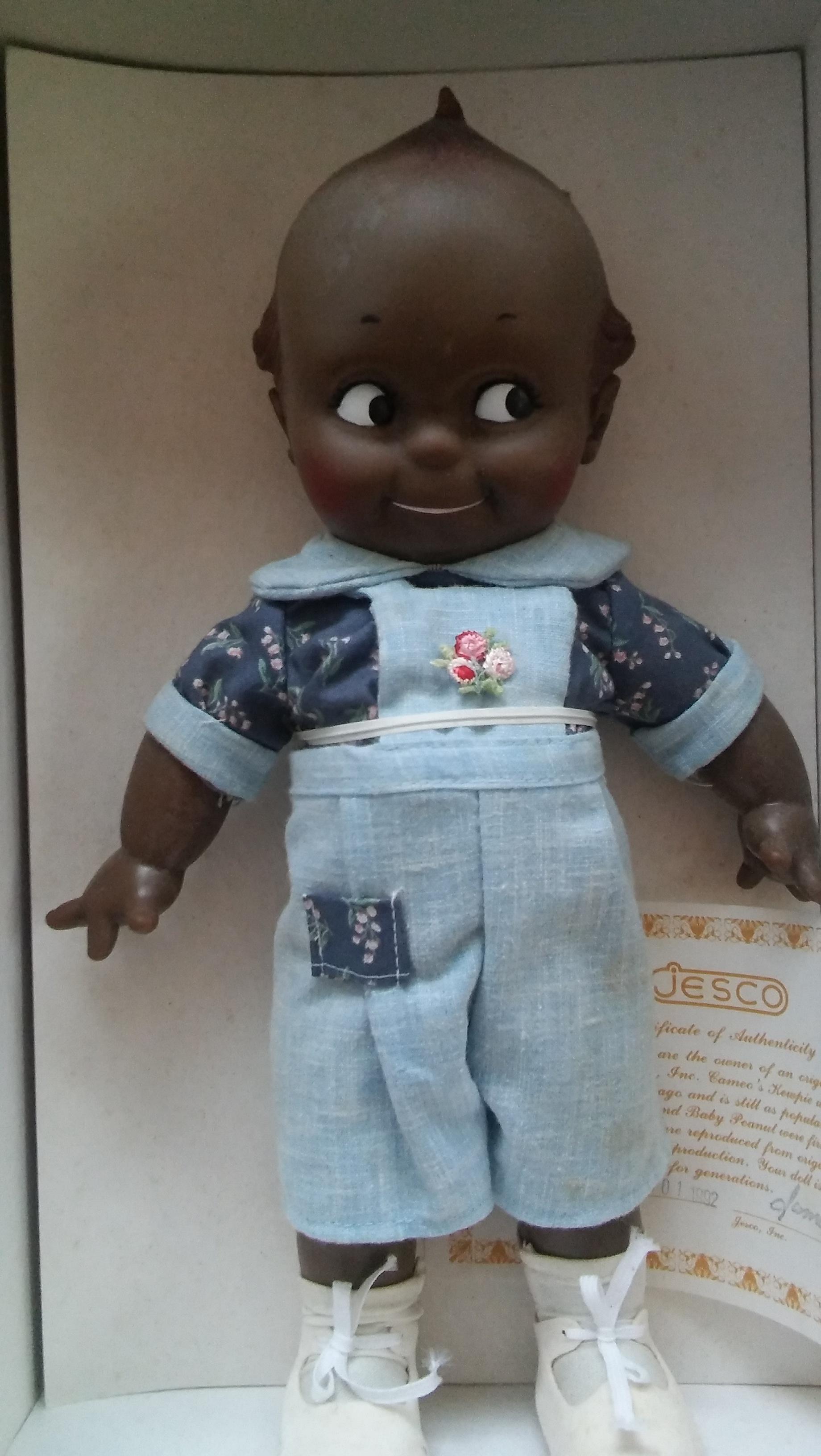 A matching set of boy and girl Black Kewpie dolls. They stand 12 inches tall. The girl has a lazy or wacky eye. Both are made of plastic or rubber. The girl is wearing a dark blue dress with pink flowers and has a light denim apron over it. She has white tights and white velvet shoes. The boy is wearing light denim overalls with the shirt made from same dark blue flowered material at the girls. Both come with a certificate of authenticity dated January 1st 1992. Both are in their original boxes