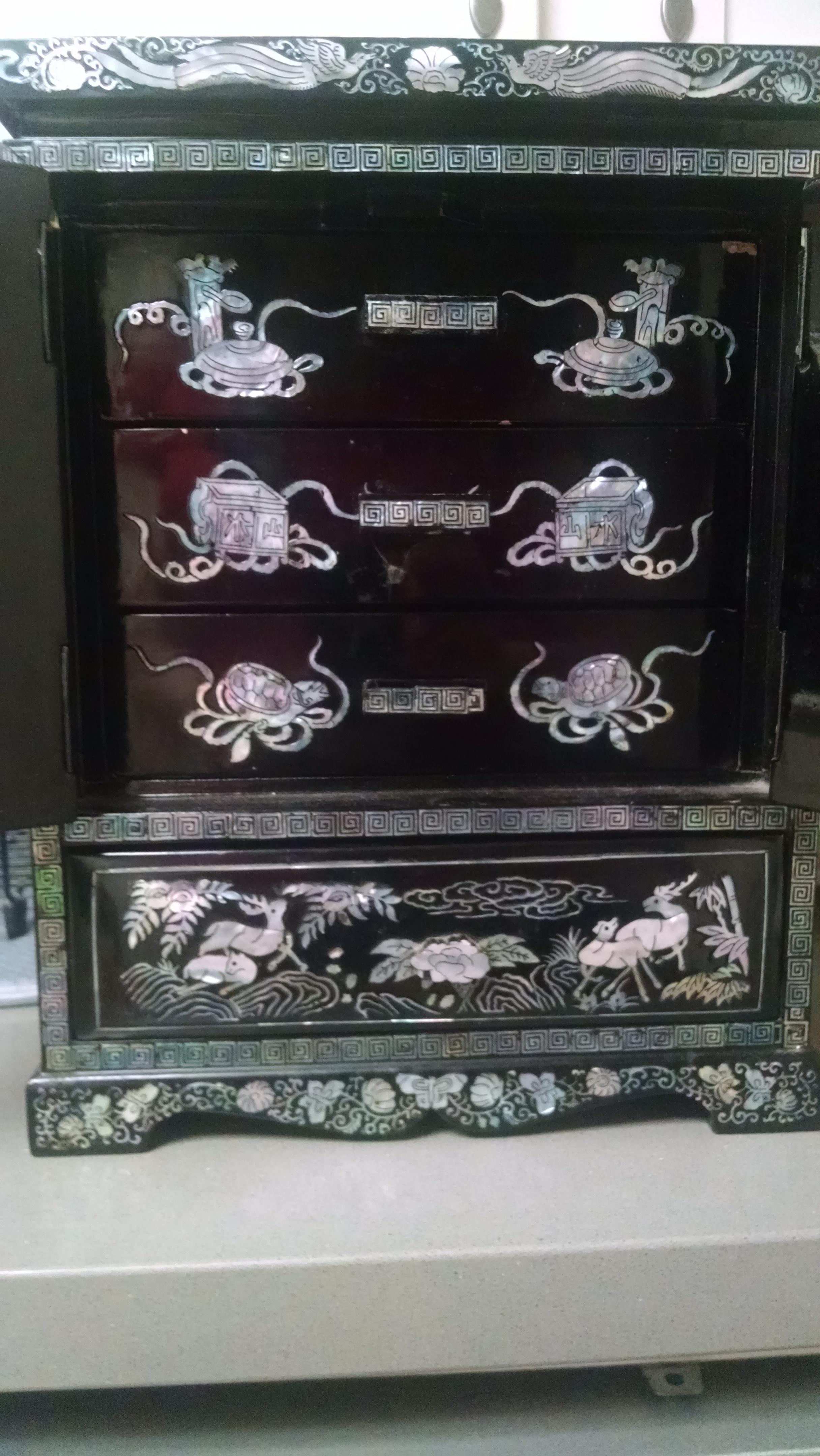 I've tried googling to gather more information.  It's similar to some 1950s black lacquer boxes I've seen online.  The descriptions are mixed--some claim to be Chinese or Korean, but they seem to feature cranes rather than the peacocks seen here.