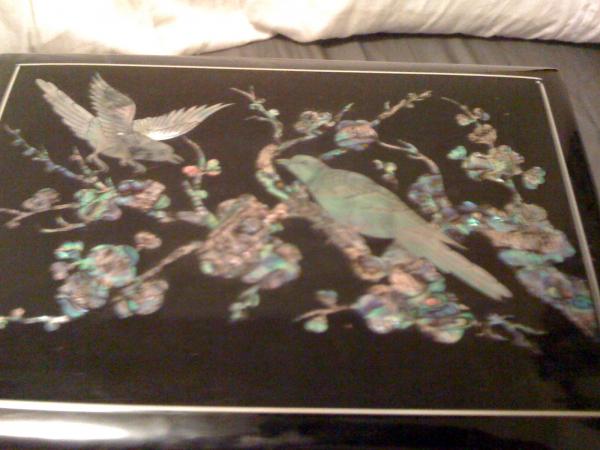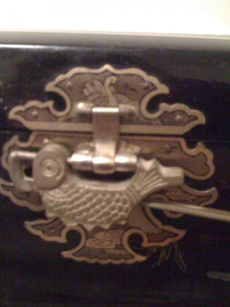 Black lacquer jewelry box. I believe it was purchased in Korea. Has a mother of pearl inlay design on top and on front of box with goldish looking accents. Some type of bird with flowers on top. Cranes on the front. The lock is removable and looks like a coy fish. Mirror inside and a wind up piece that plays music. Made out of wood. No dealer or maker stamp that I can see.