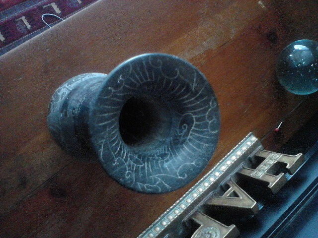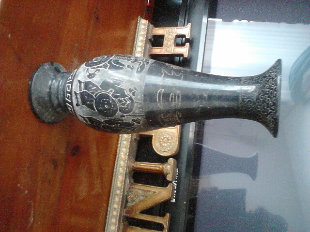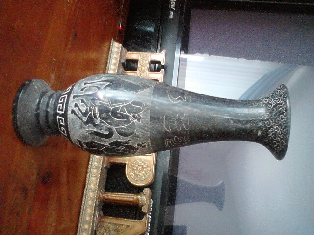 I have a black oriental in appearance vase which I purchased in around 1993 from an estate sale when I was a youth from a woman who did not know it's origin as it was her late mothers. There is what appears to be symbols of a language wrapped around the vase on top of the pictures which are finely etched into the side of this beautifully detailed stone/marble vase. A charriot with a passener and driver as well as horses and what looks to be guards are etched below the symbols.
