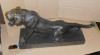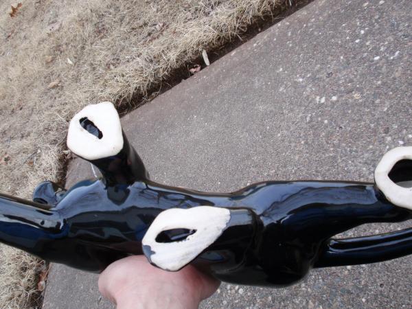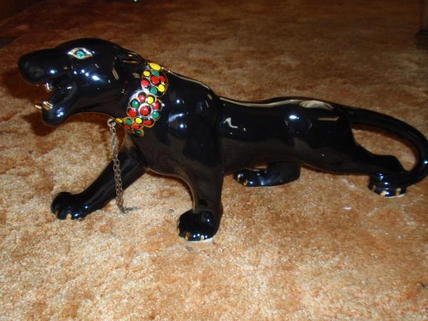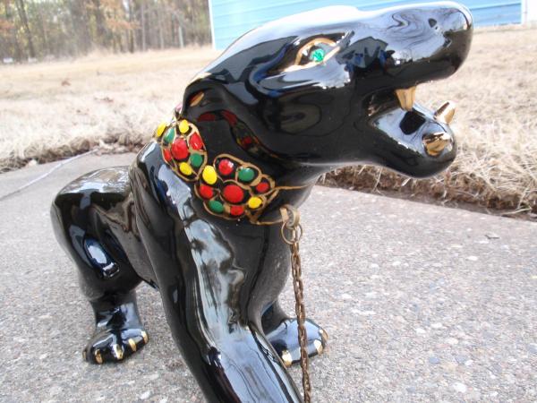 Ceramic panther with green jeweled eyes,gold teeth and claws, painted collar with chain. Bottom of feet are bare but, strangely enough they painted the inside of the foot area black. It's hard to measure but looks to be about 19" overall length.