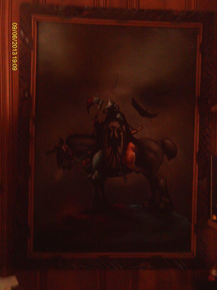 frank frazetta , death dealer. one sold for 150$ so 75$ - 200 depending on how well its painted. . a much better picture would let us know how well it is done .it is his most famous painting.