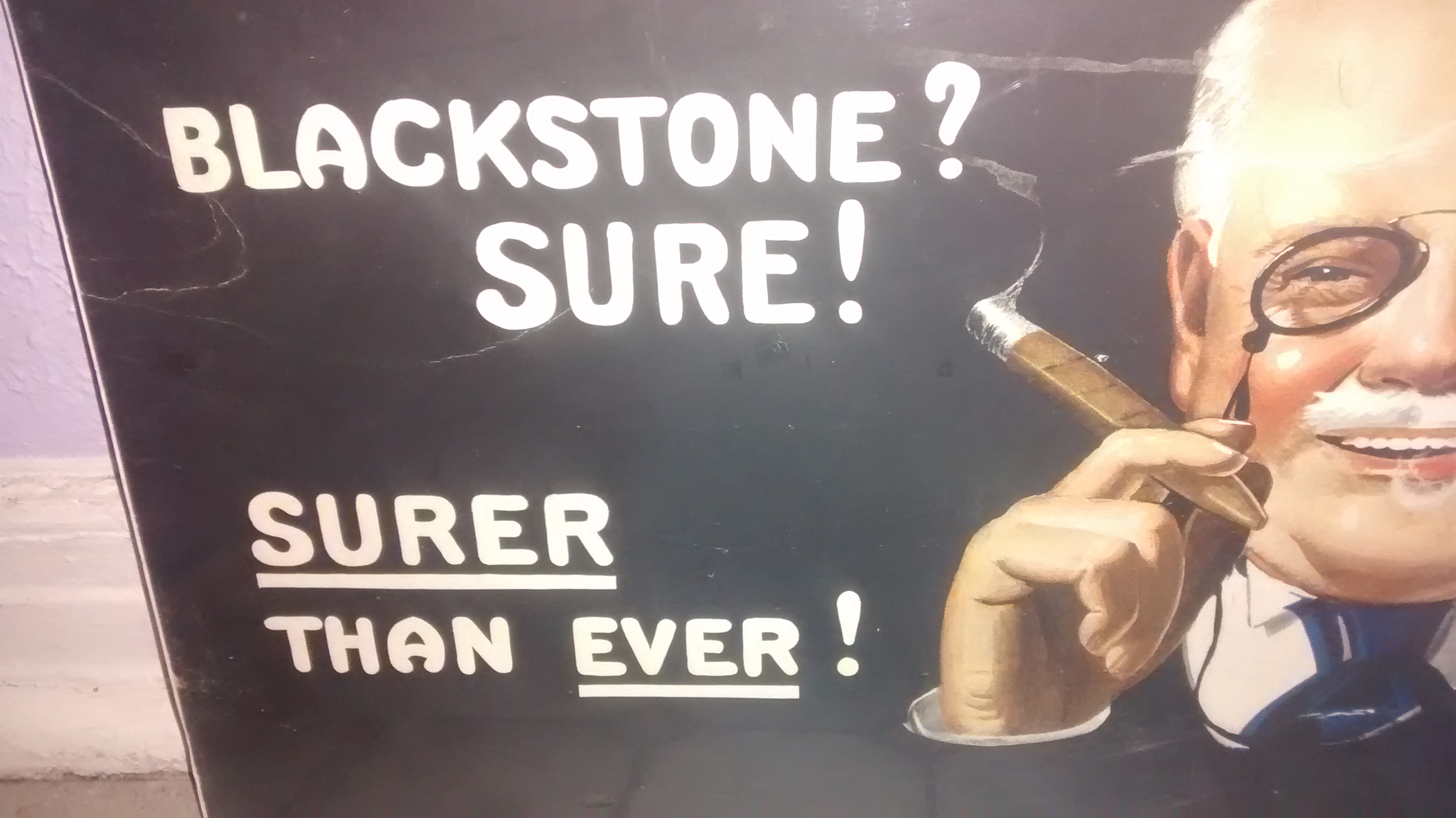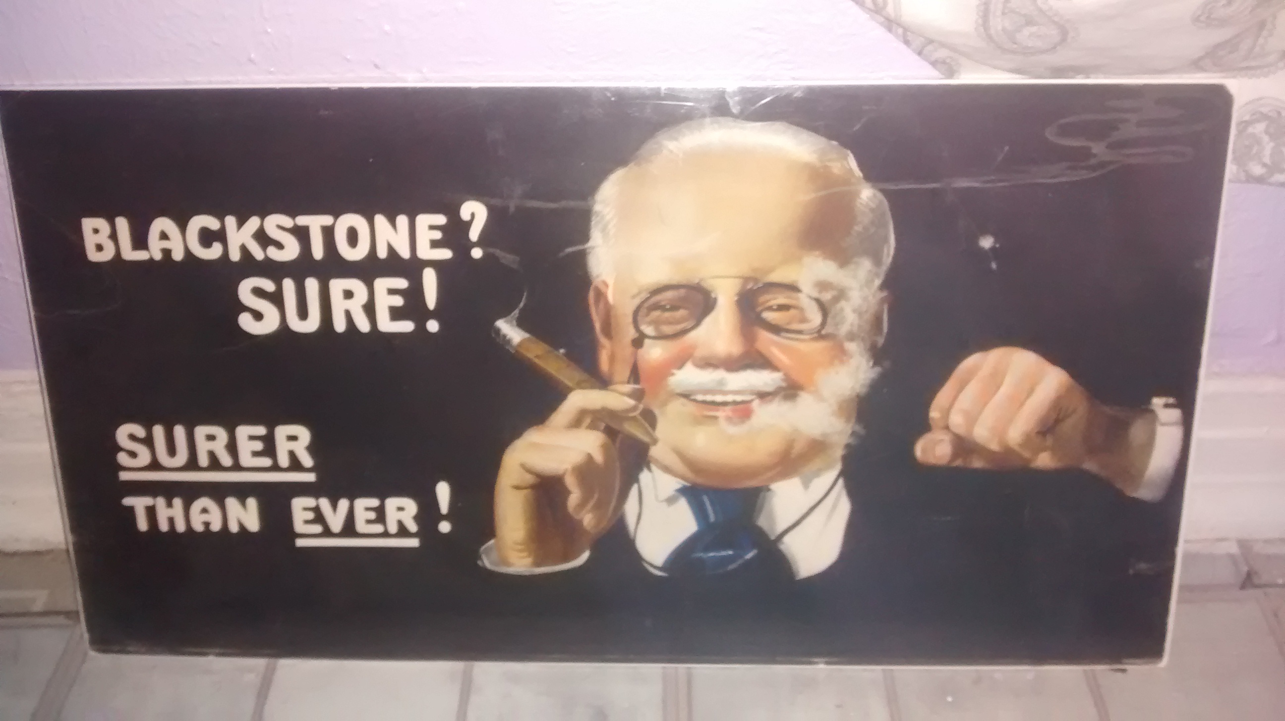 I bought this Blackstone cigar ad a week ago. I don't know too much about it, but the previous owner stated it was probably made circa 1915. It's in great condition for the time period. It's wrapped in plastic on cardboard. I cannot find any information about it. I would really like to know more about this piece and get an appraisal. Thanks!