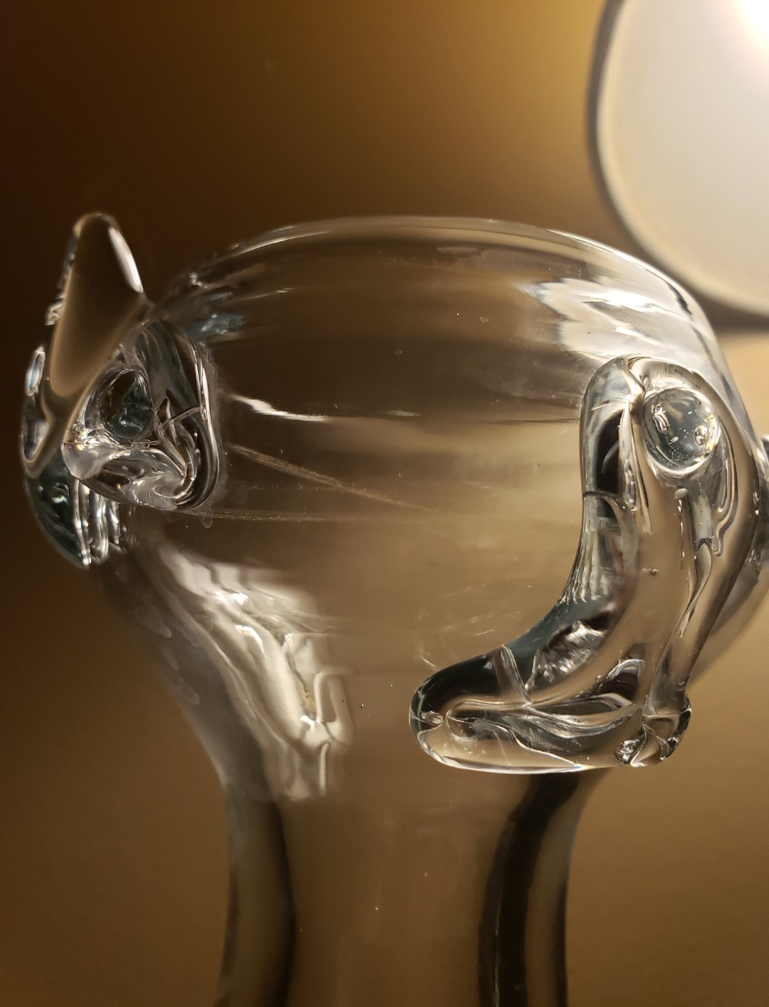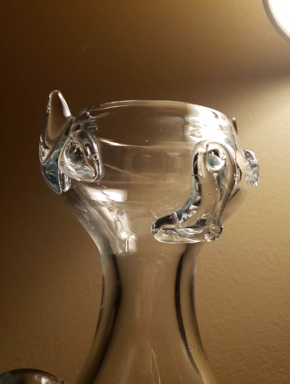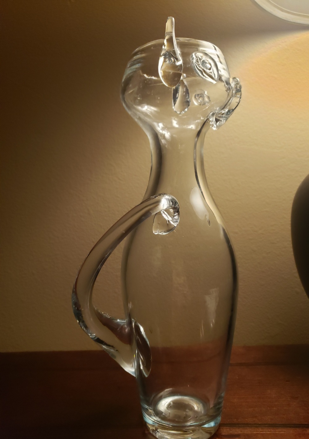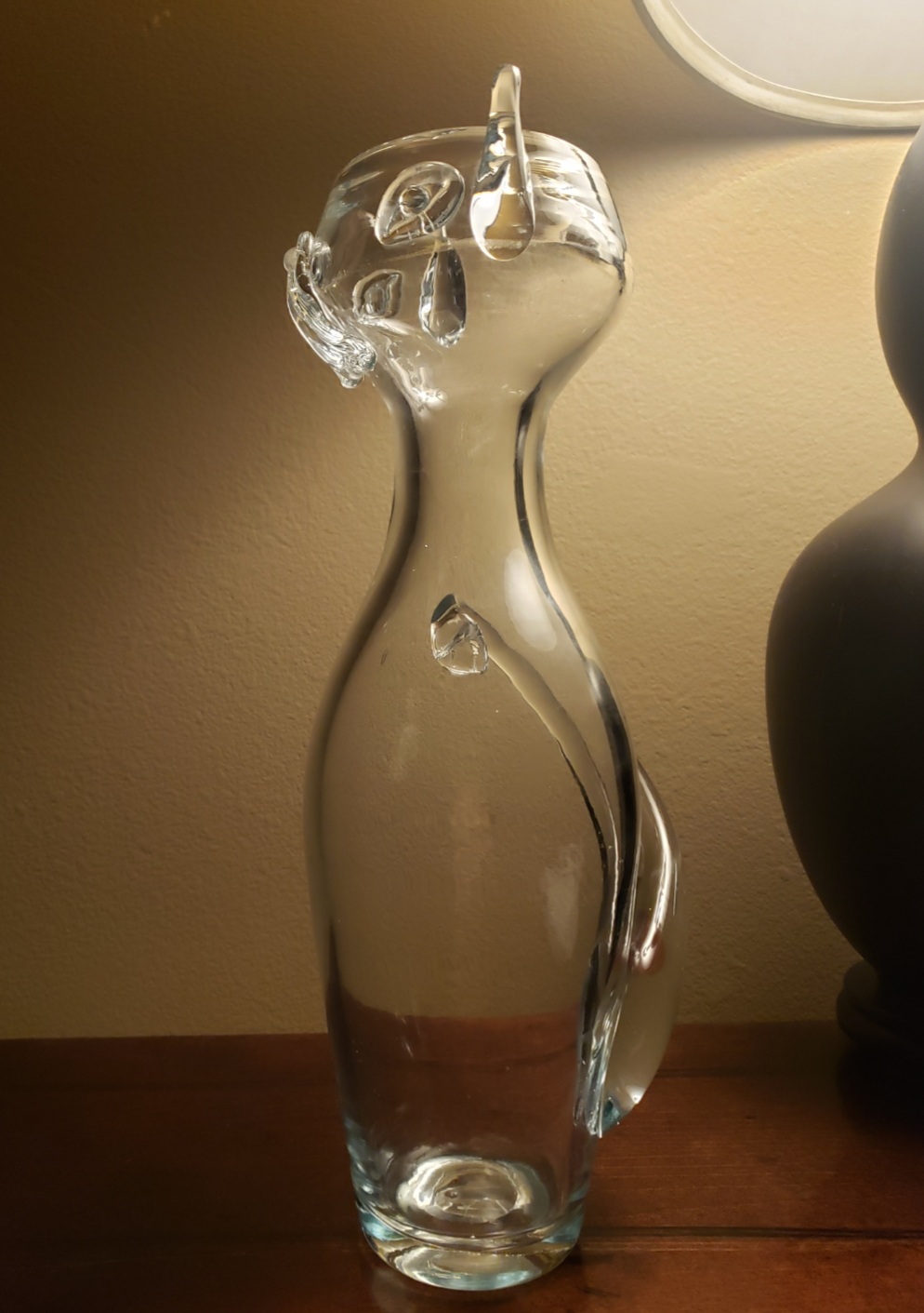 Found in a Goodwill in Southern Alabama, the pontil scar is what caught my eye. I have blown a few pieces and I know the work that goes into it. I never dreamed this cute little cat vase could be famous. From what I gather, she appears to be a rare piece from Wayne Husted formed in 1955 or 1956 for Blenko. I've seen a couple other colors online but none in crystal. It does list the clear color as an option though in the Blenko catalog, and the kitty itself has catalog entry #559. There is also a faint line of color, possibly tangerine, on the head. Just wondering if she is as rare as it seems and if my $3 was the best investment of my life.