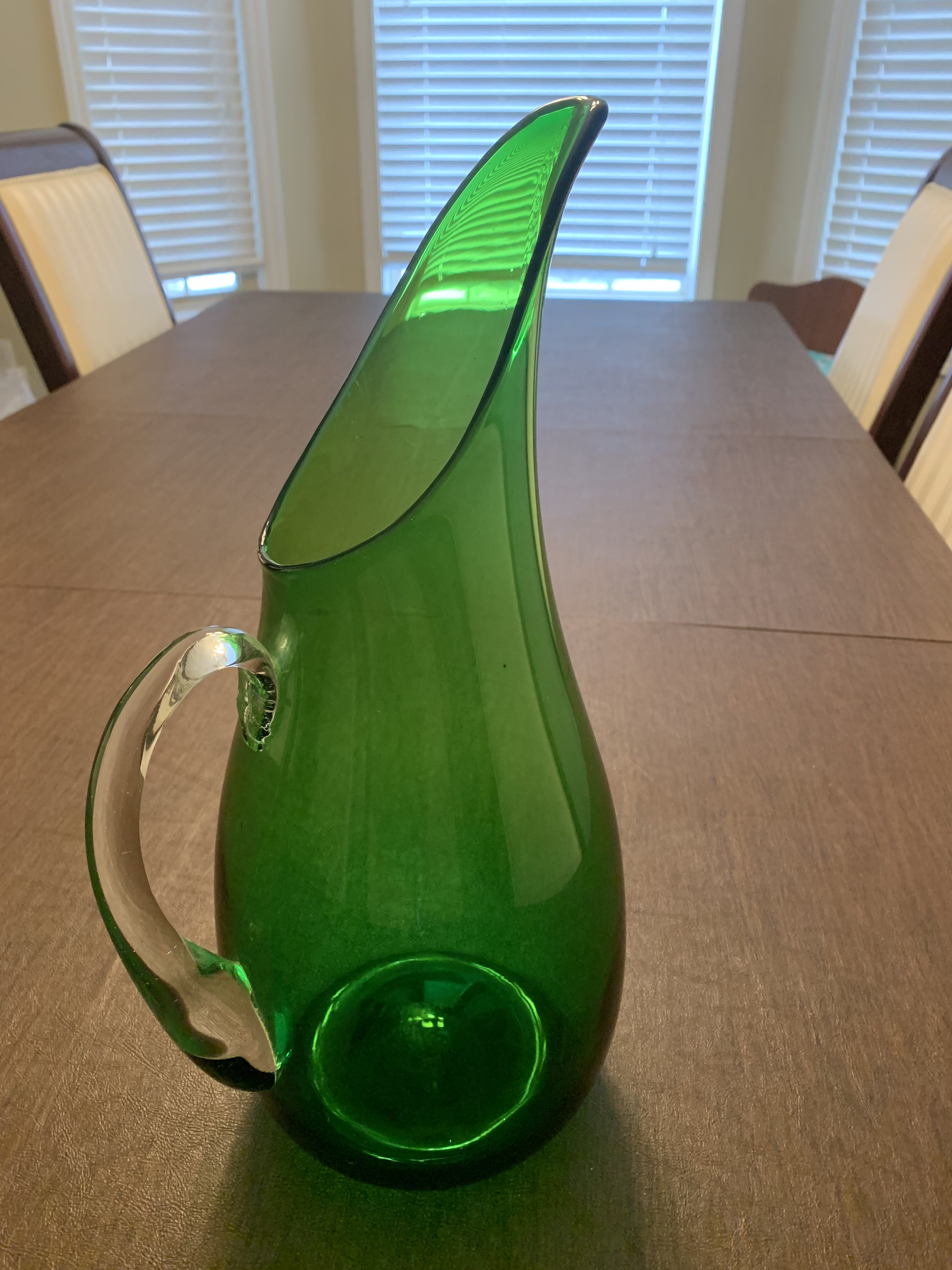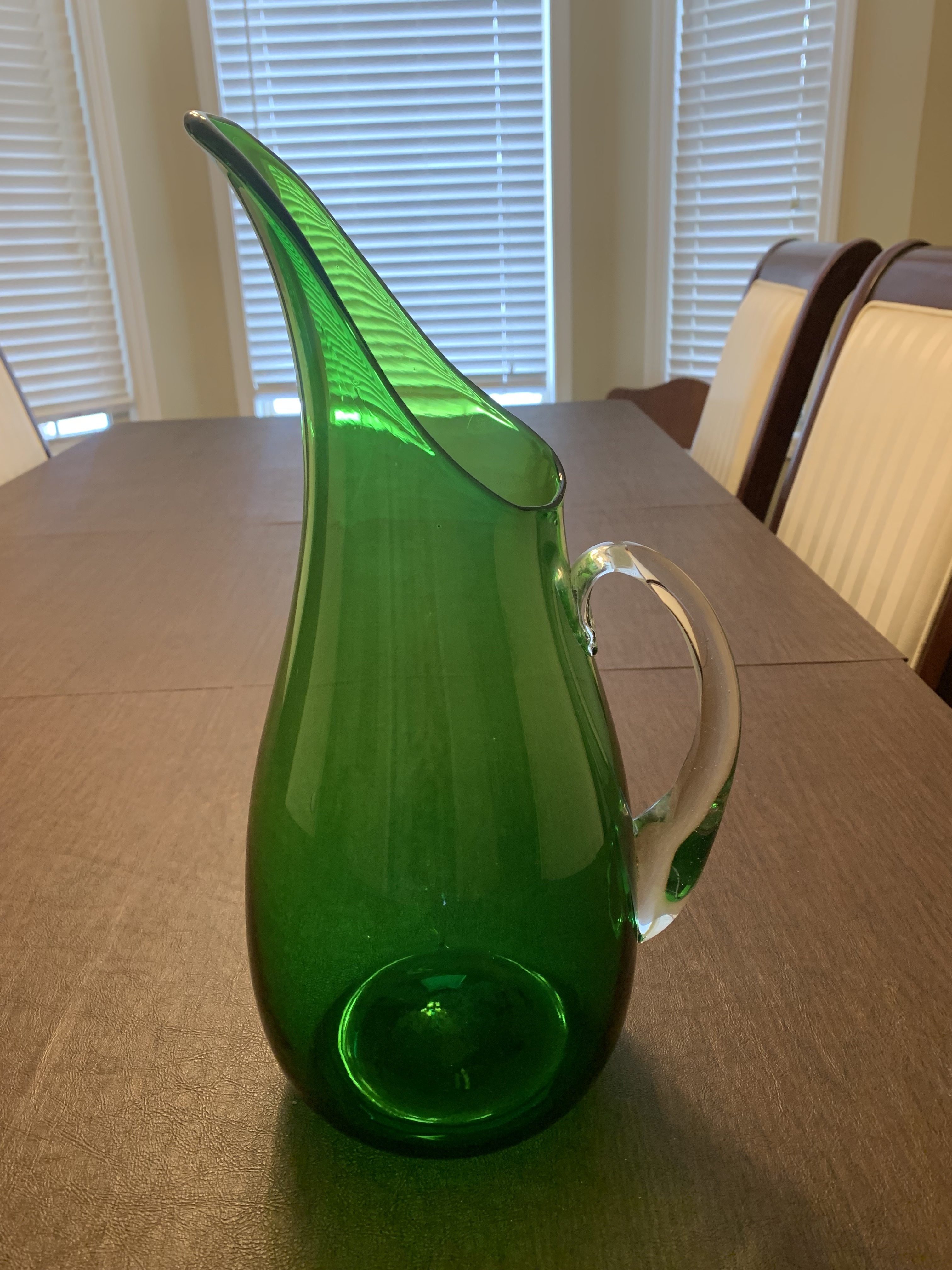 Description mid centry wayne husted blenko green glass tall pitcher, height roughly 15 inch, width of 5 inch, no crack or chip.