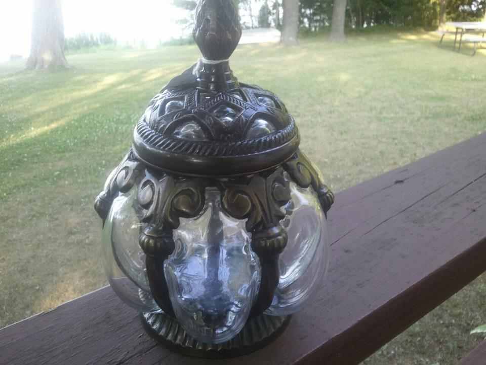 A 8 1/2" tall glass and brass container. It is very heavy and indian made.