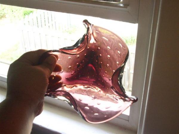 This is a 3 sided amethyst colored blown glass bowl. This object is 8" in the largest portion with each 3 sided portion approximately 4". The glass was purposly blown to have strategically placed air bubbles in the glass from top to bottom. The air bubbles begin small at the bottom and are larger until the reach the top.