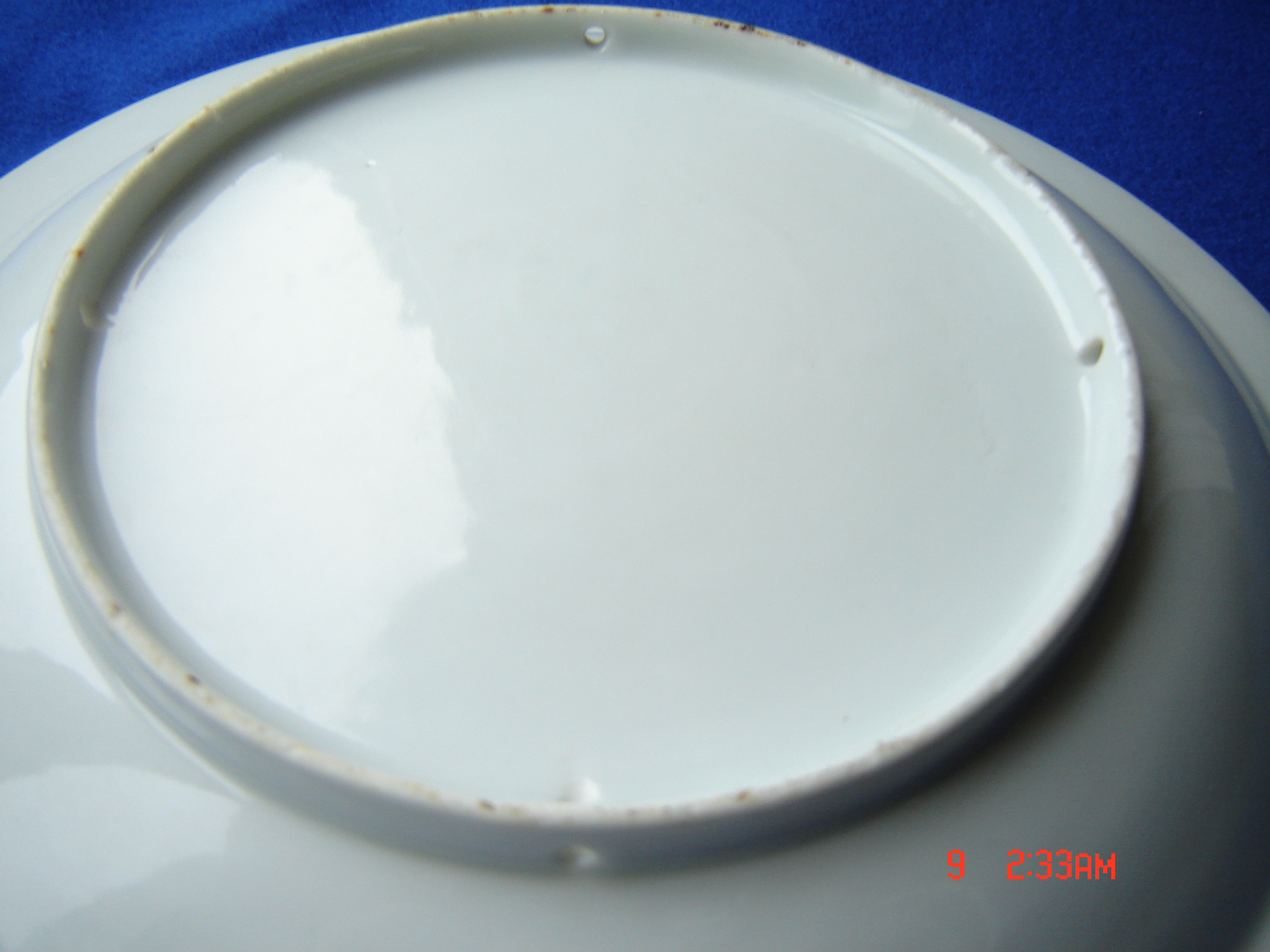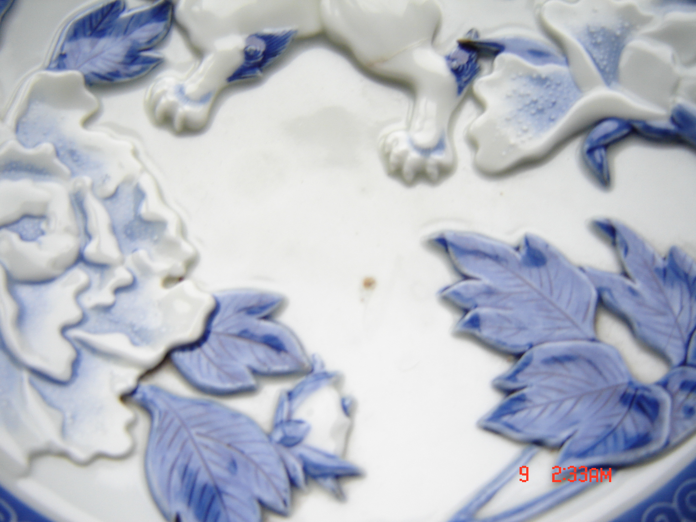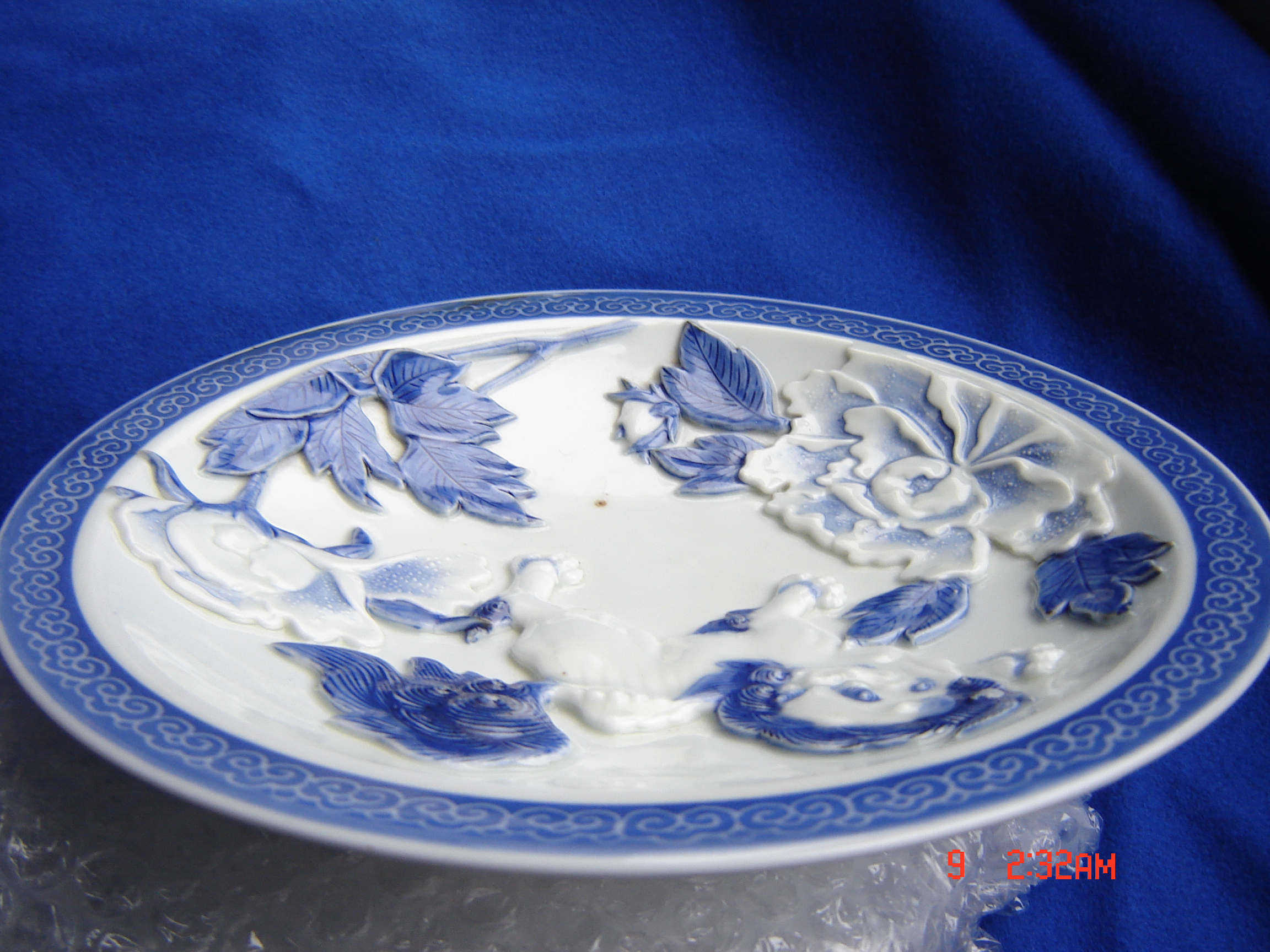 Antique Asian blue and white plate blue patterened rim and raised Foo Lion and Peonies in centre.Rust and firing marks but no other marks.Plate diameter 21.7 cm wide and 3.7 deep