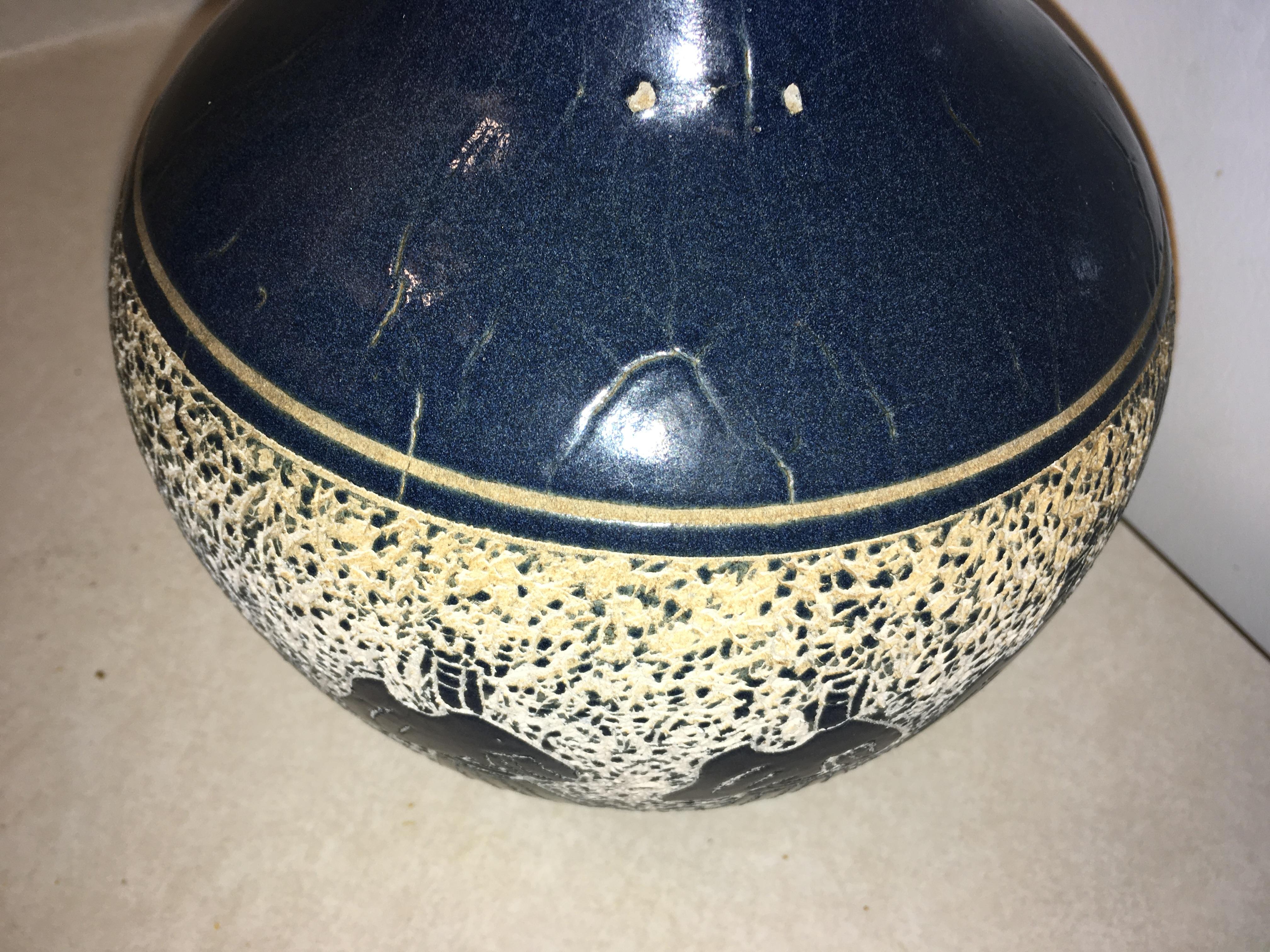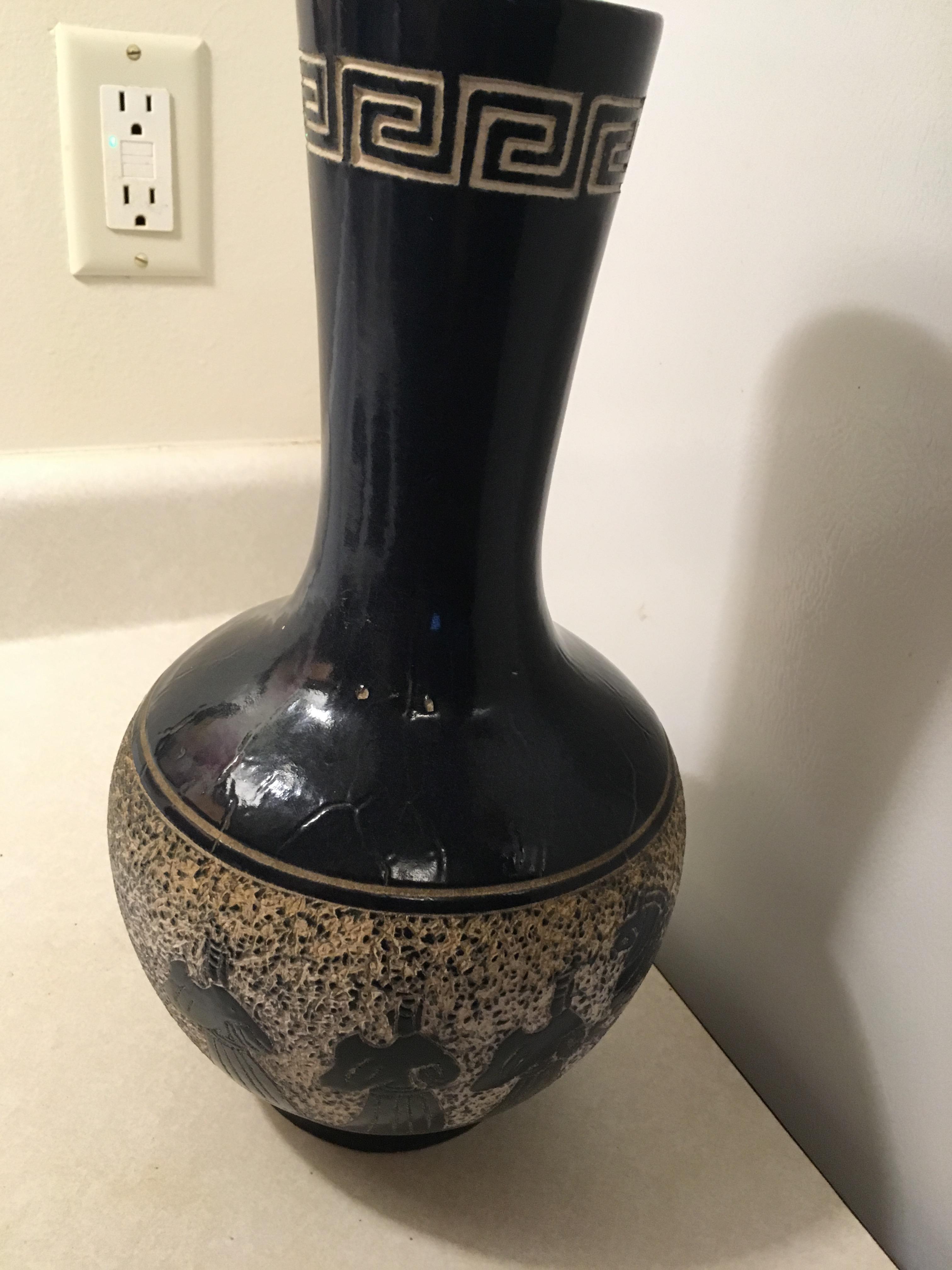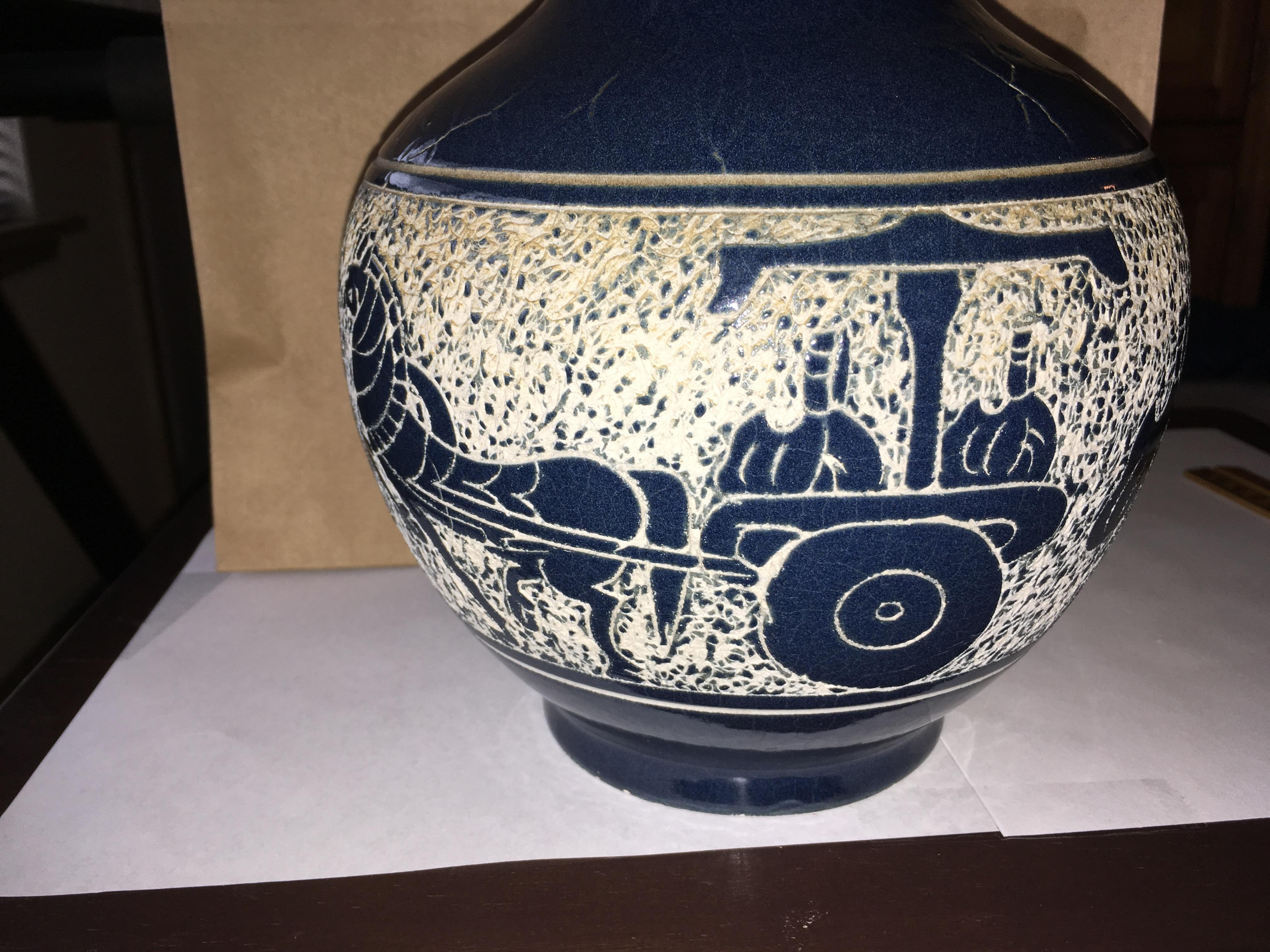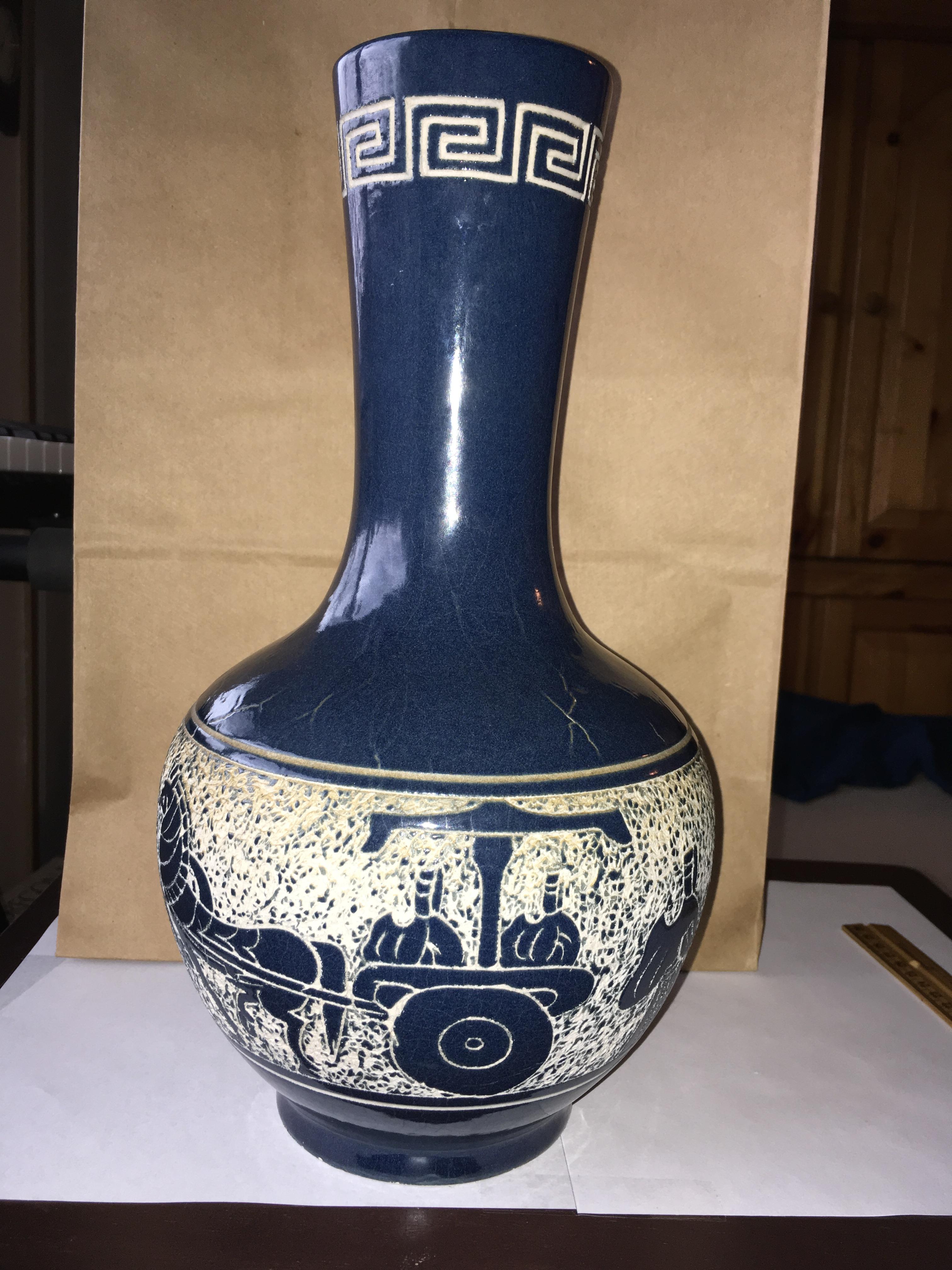 Trying to determine the age and maker and  how rare my vase is. Appear to be marks on inside of neck also a raised mark on bottom . Vase is about 13'' tall x 3 1/8th '' wide at rim x 4'' wide at base measurements are approximate. Weight is  3lbs 5.9ozs. Detail on outside is etched or chiseled in.