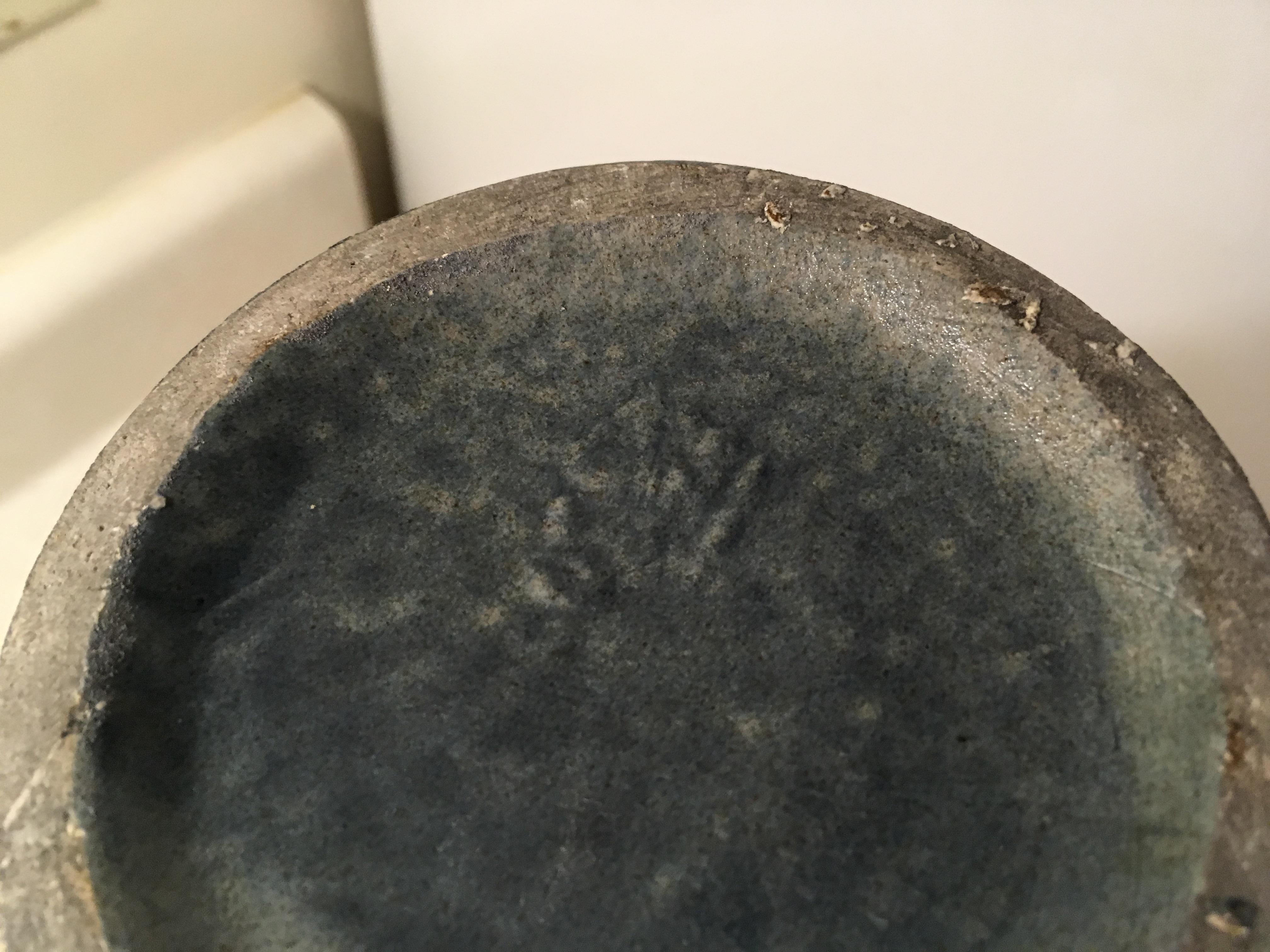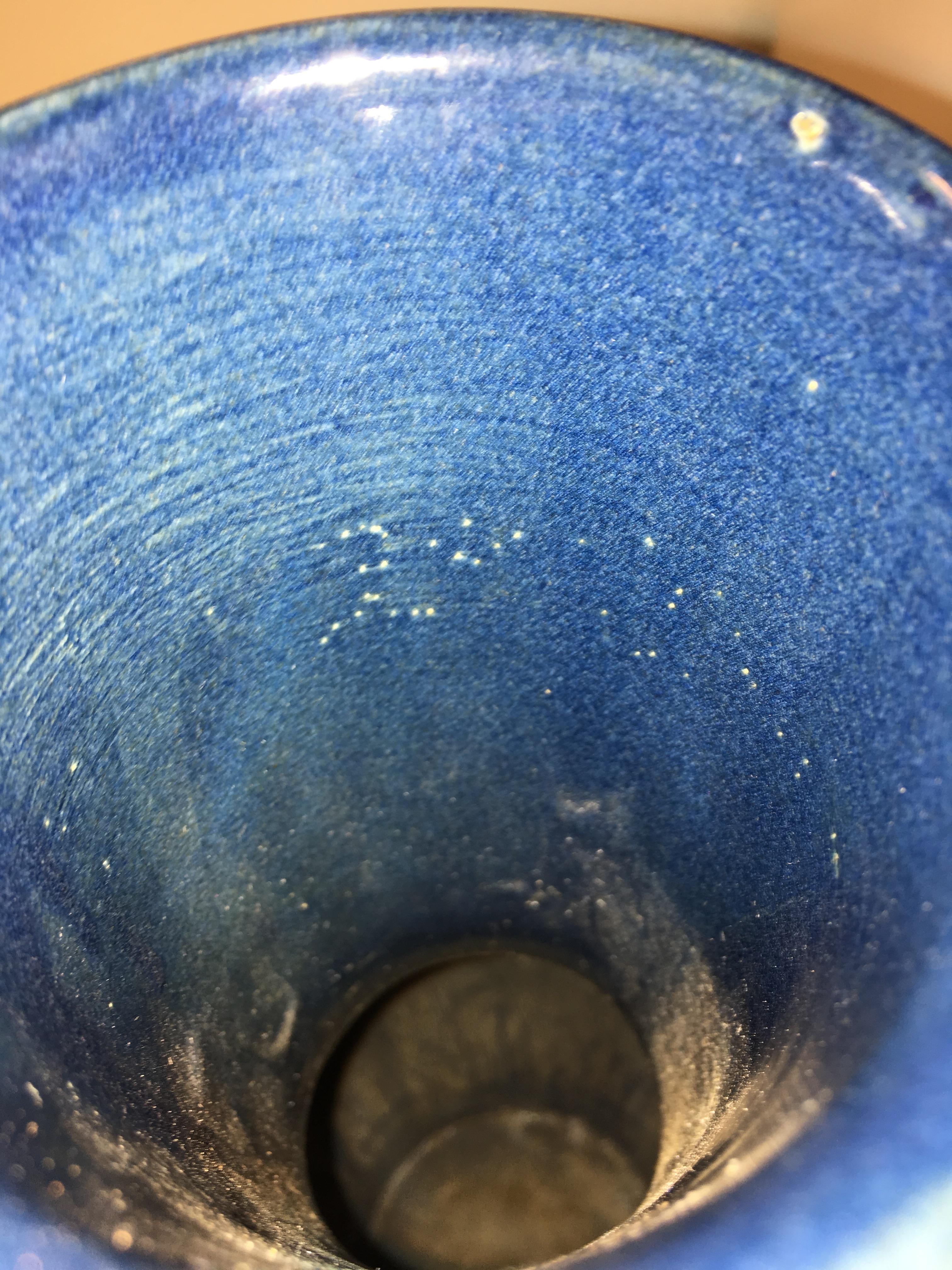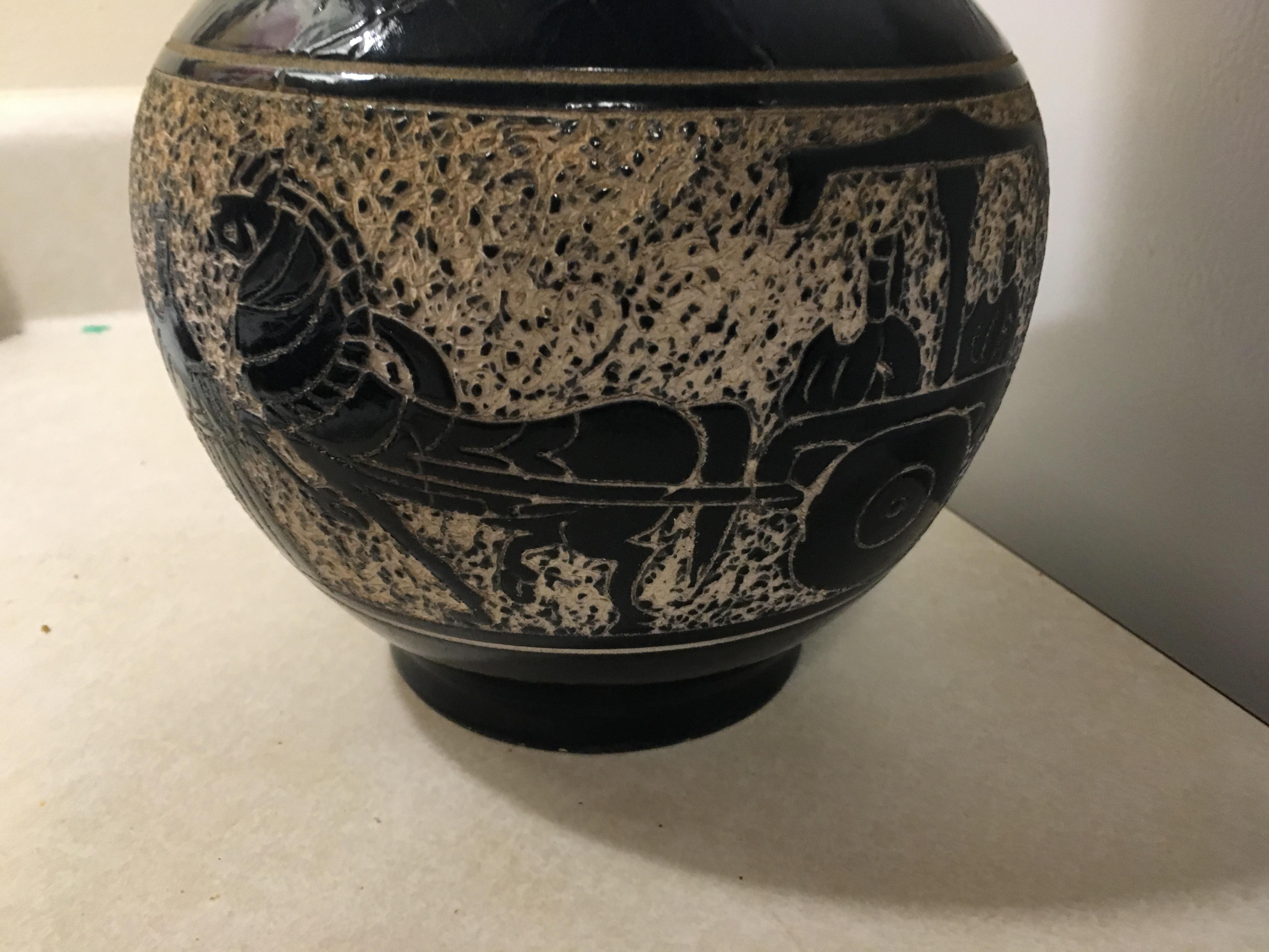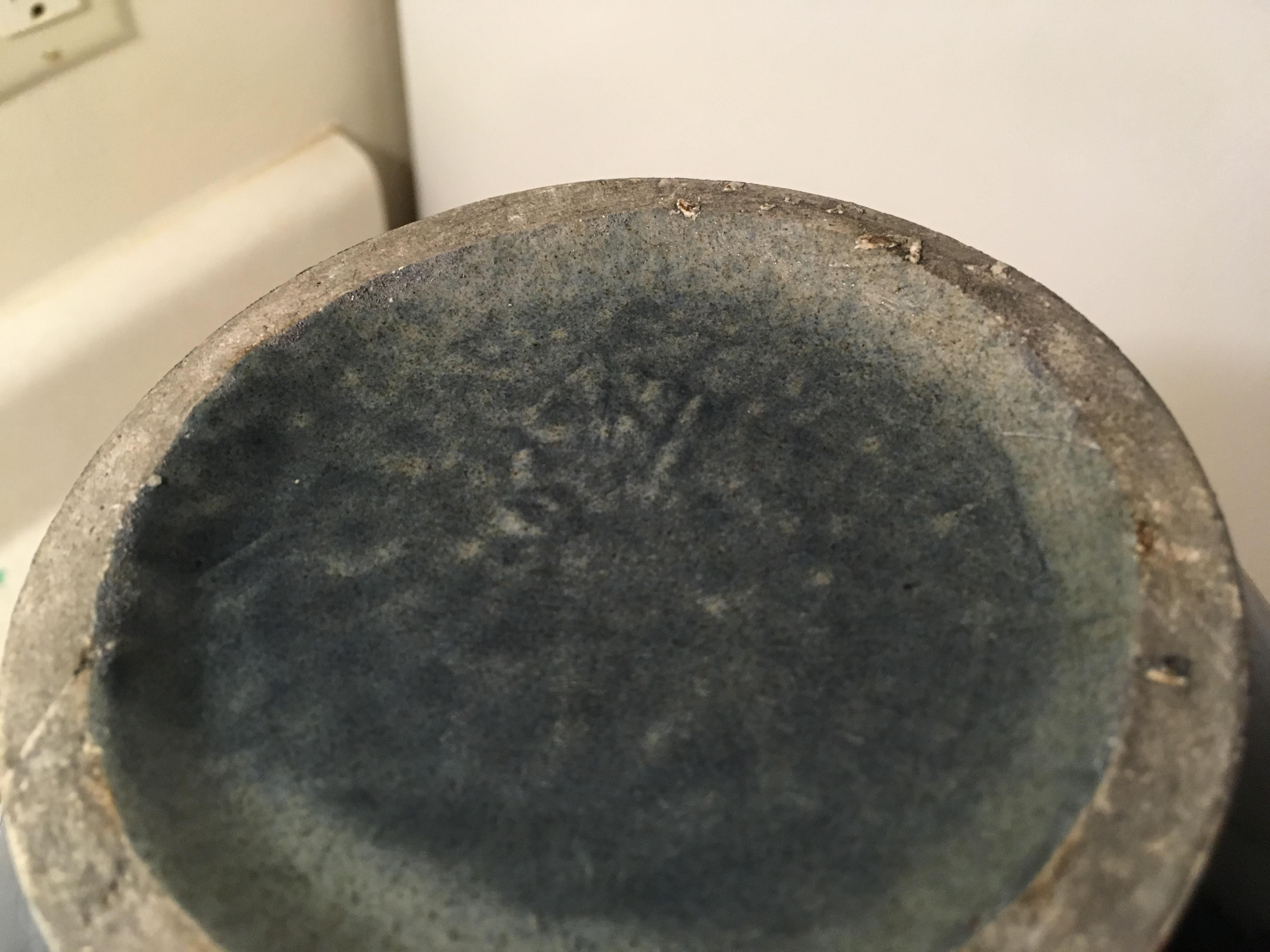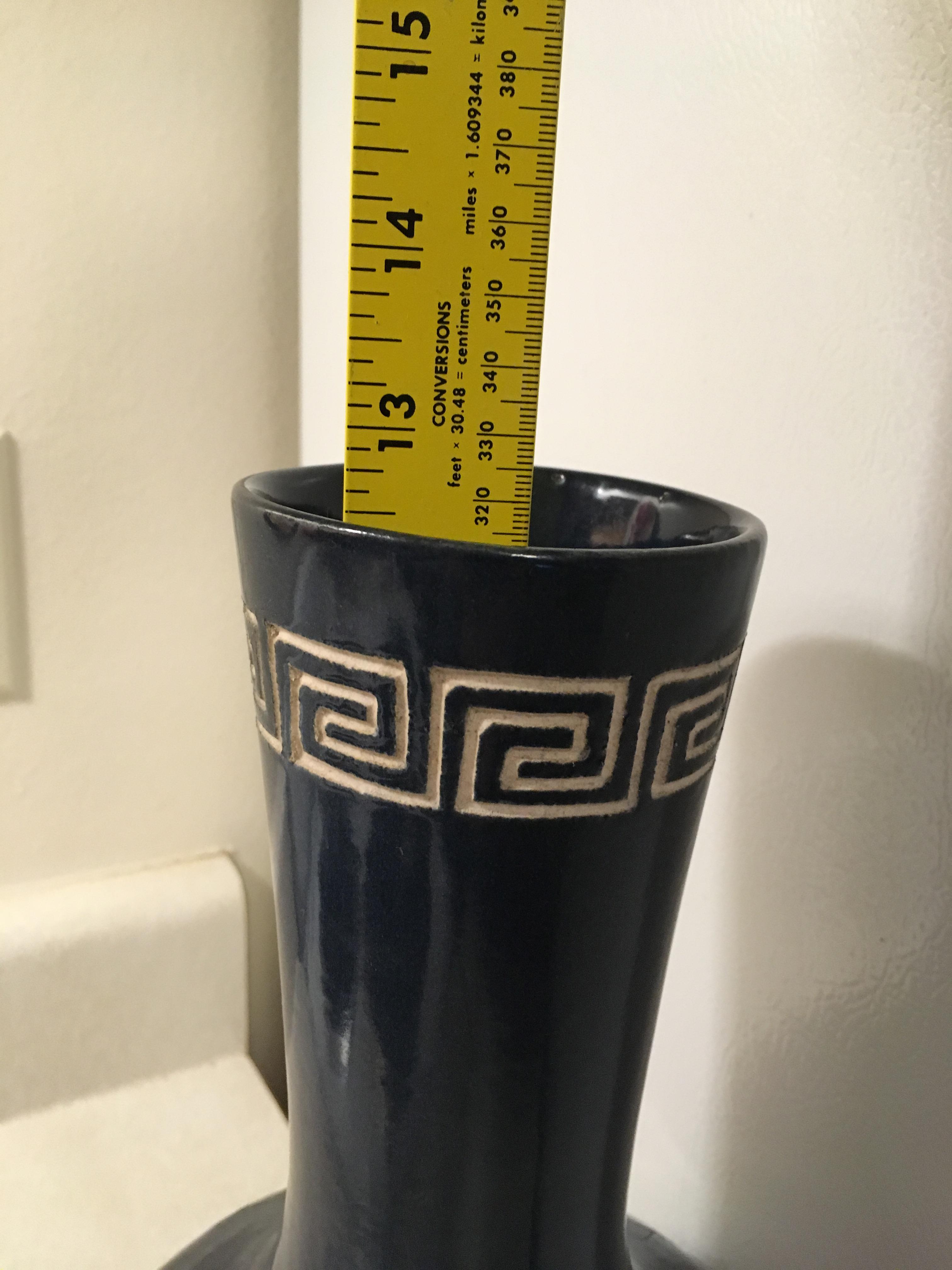 Trying to determine the age and maker and  how rare my vase is. Appear to be marks on inside of neck also a raised mark on bottom . Vase is about 13'' tall x 3 1/8th '' wide at rim x 4'' wide at base measurements are approximate. Weight is  3lbs 5.9ozs. Detail on outside is etched or chiseled in.