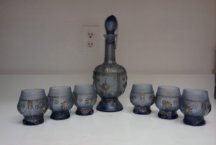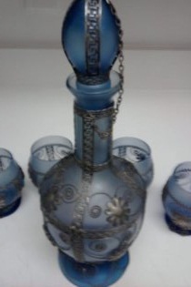 this is a blue glass decanter with 6 cups,  they all have some very detailed silver colored wire patterning wrapper arround them, I found it in my great grandmothers garage while cleaning it she has no idea where it came from. i can find m=no stamps or markings on the set at all, the bottom of the cups have several small circle rings in the glass. There are some small inperfections arround the rim of the cups.