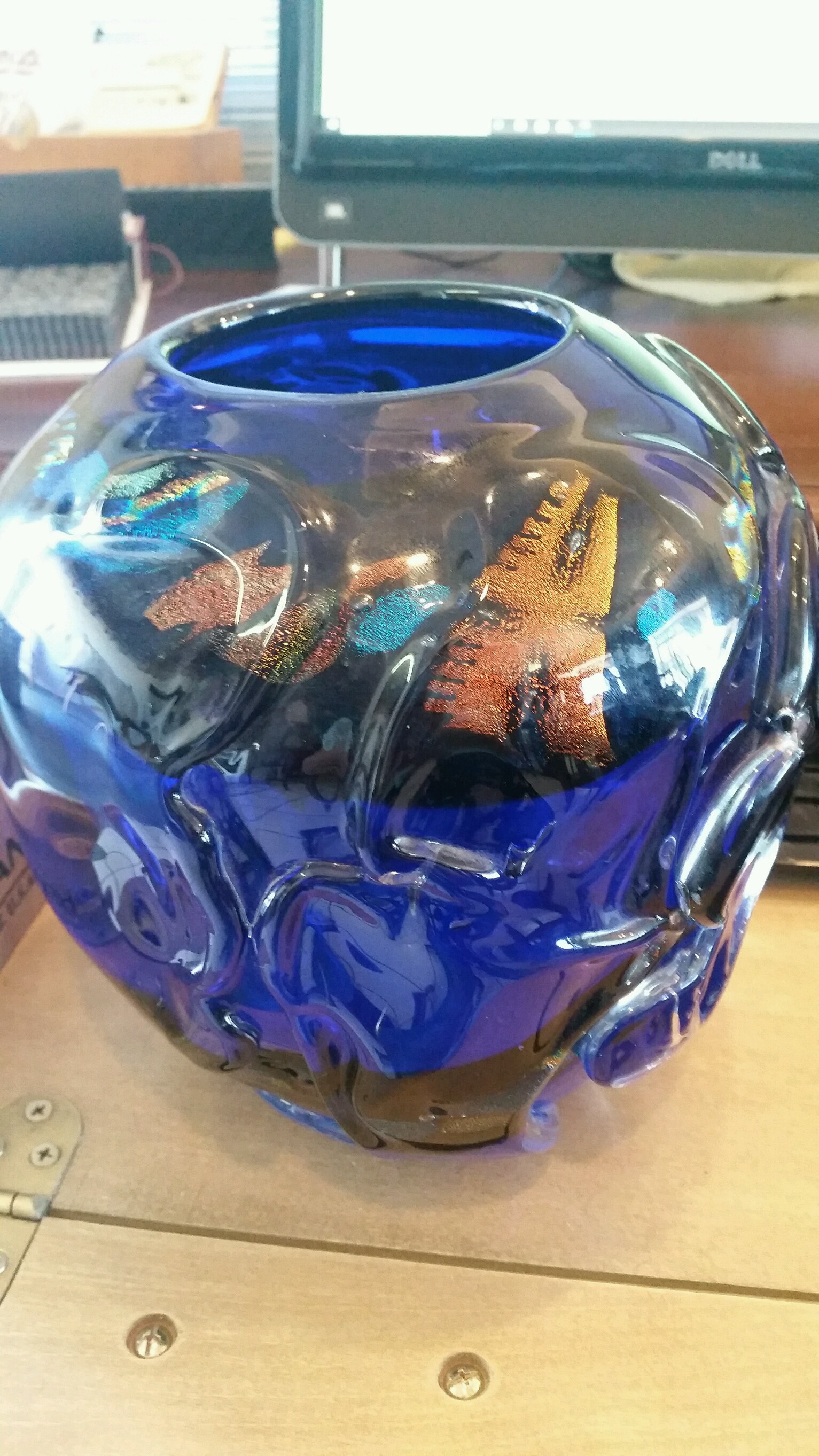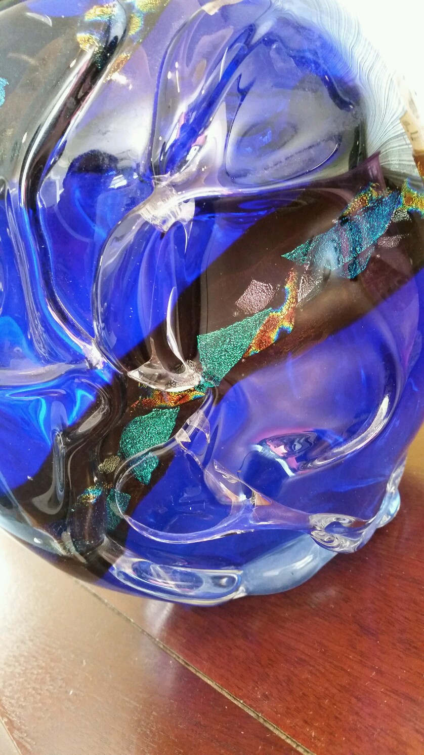 i dont know anything about this vase, and have not had any luck online looking for information. any answers would be appreciated!! It's thick heavy blue glass with metalic glittery kind of ribbon running through the glass in a spiral. I am including a photo of the signature on the bottom. It's about 9" tall and 8.5" wide.