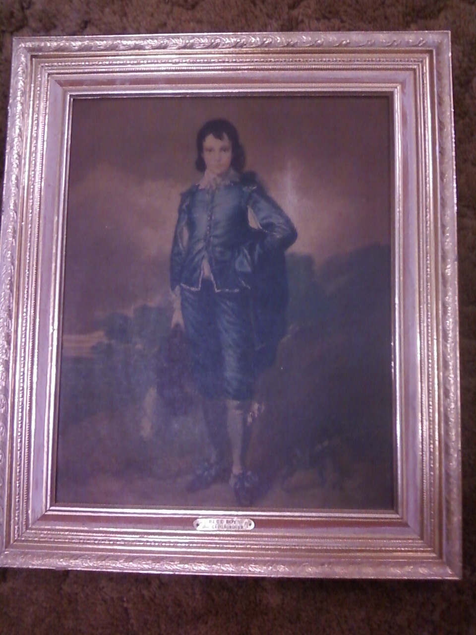 Reproduction of Gainsborough's "Blue Boy" with plaque stating "BLUE BOY after GAINSBOROUGH" weighs approximately 3lbs and has dimensions 21" x 25"
