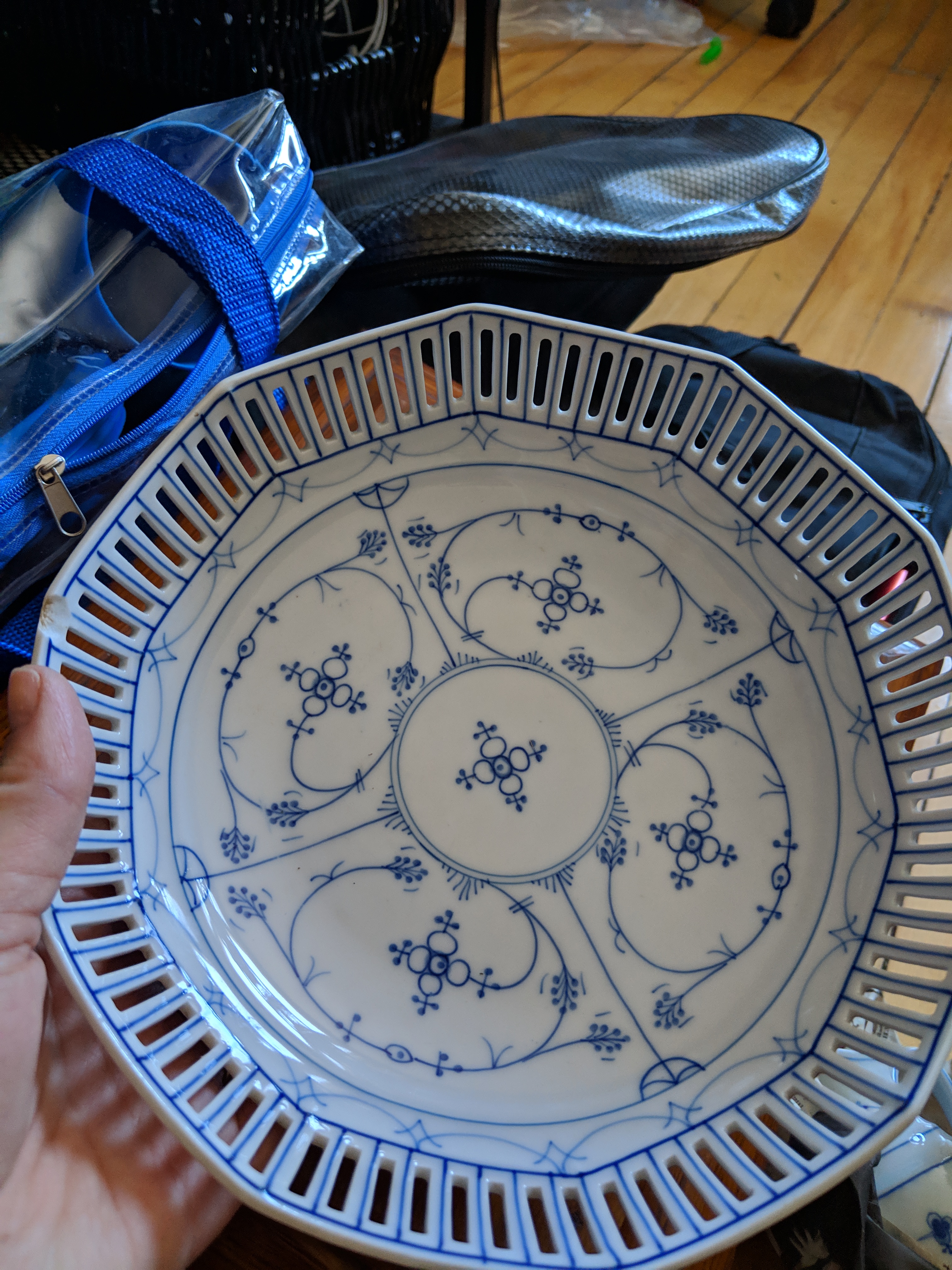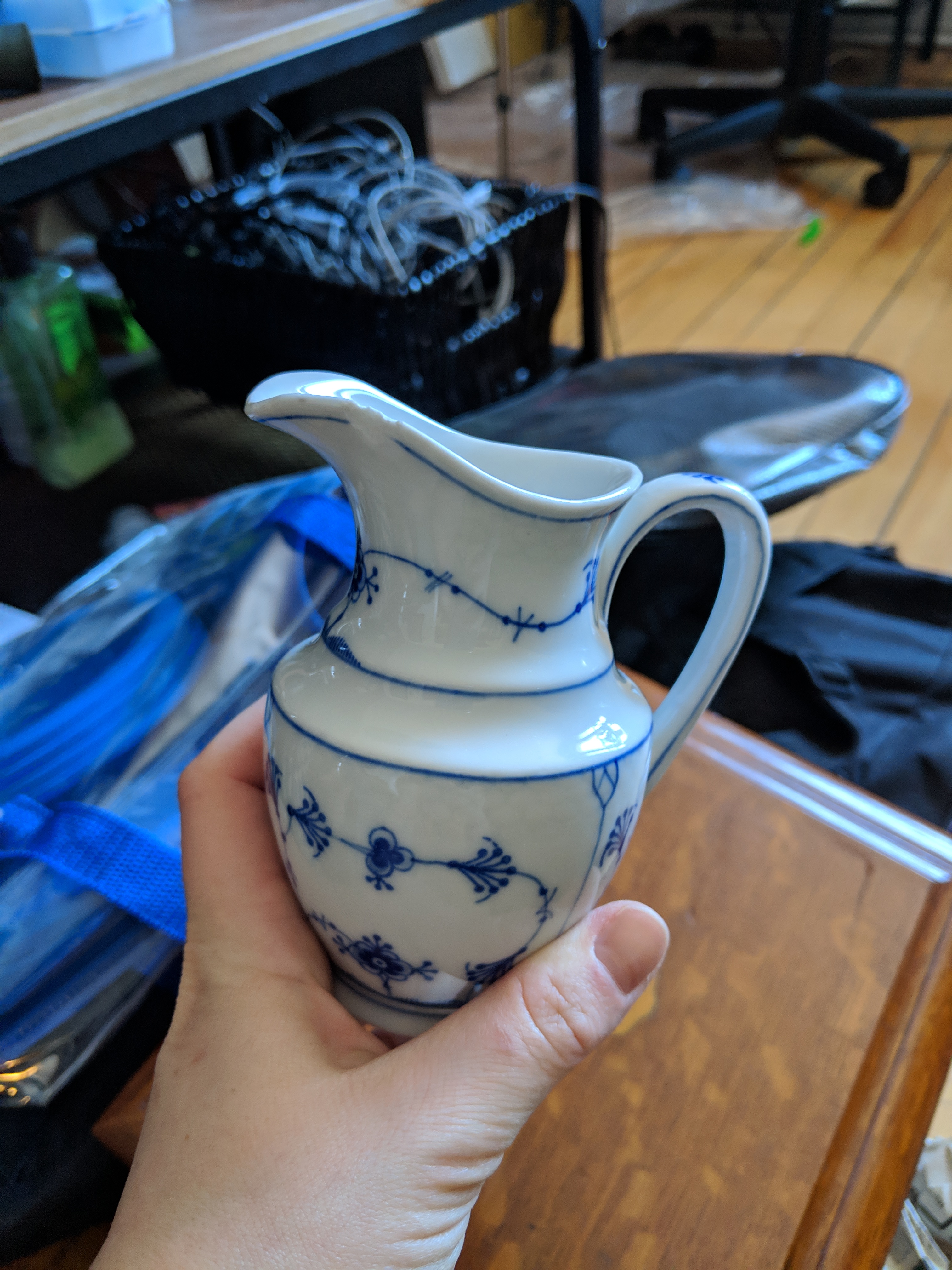 Full set with tea cups, saucers, milk and creamer, sugar dishes, and tea pot.