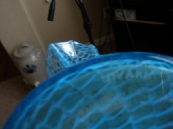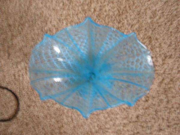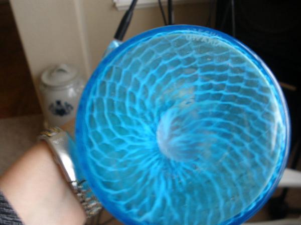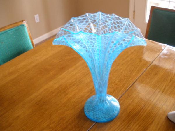 Mint condition vase sky blue color with fishnet pattern in white in glass. Marked CZECHOLOVAHIA on bottom, the S is missing or worn off(?). Tope fans out. Appears to be hand blown.