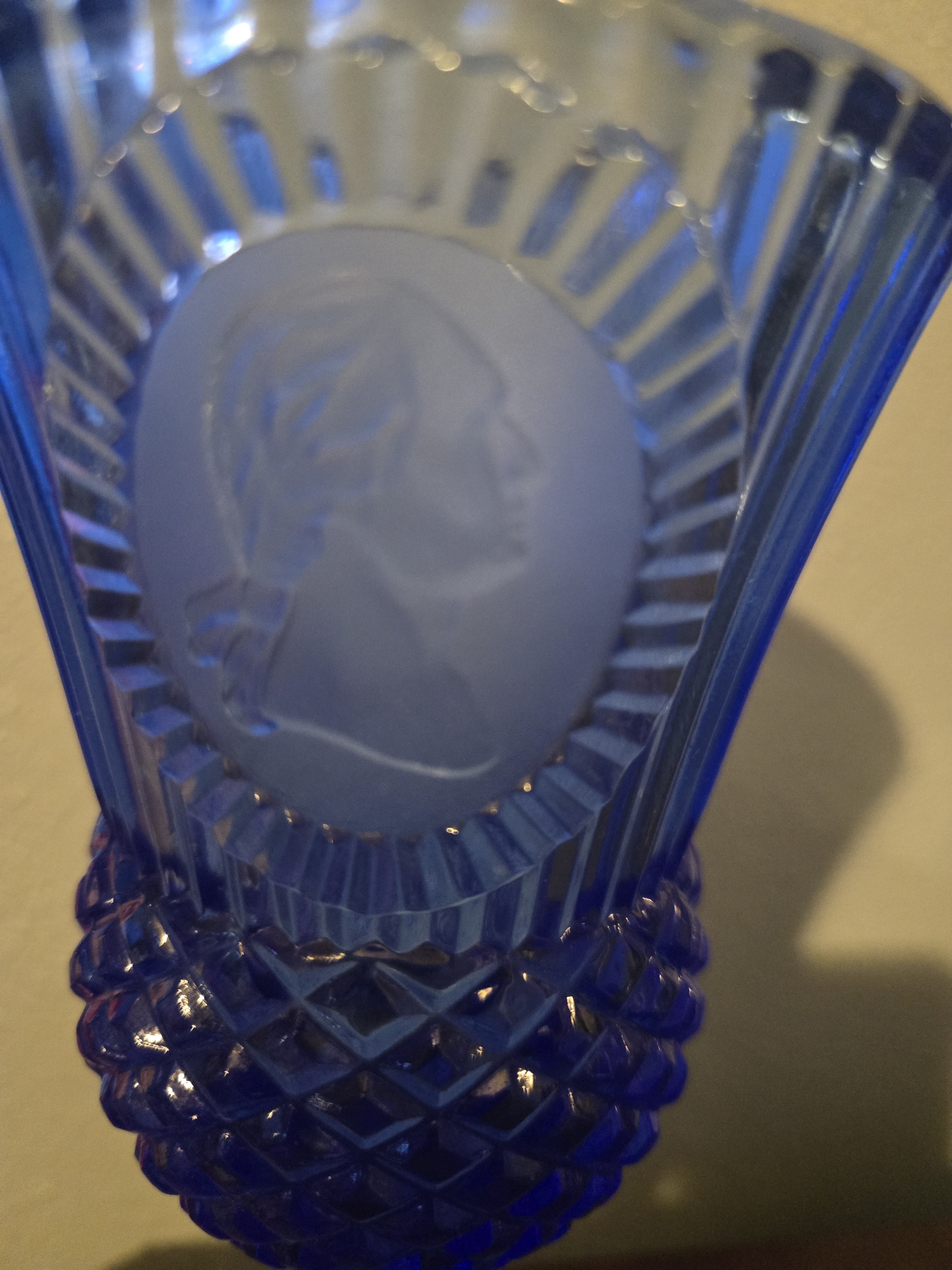 This stunning blue glass goblet showcases a profile of George Washington, making it both a decorative and historical piece. The goblet features a fluted rim and a diamond-patterned base, highlighting the craftsmanship of the era.