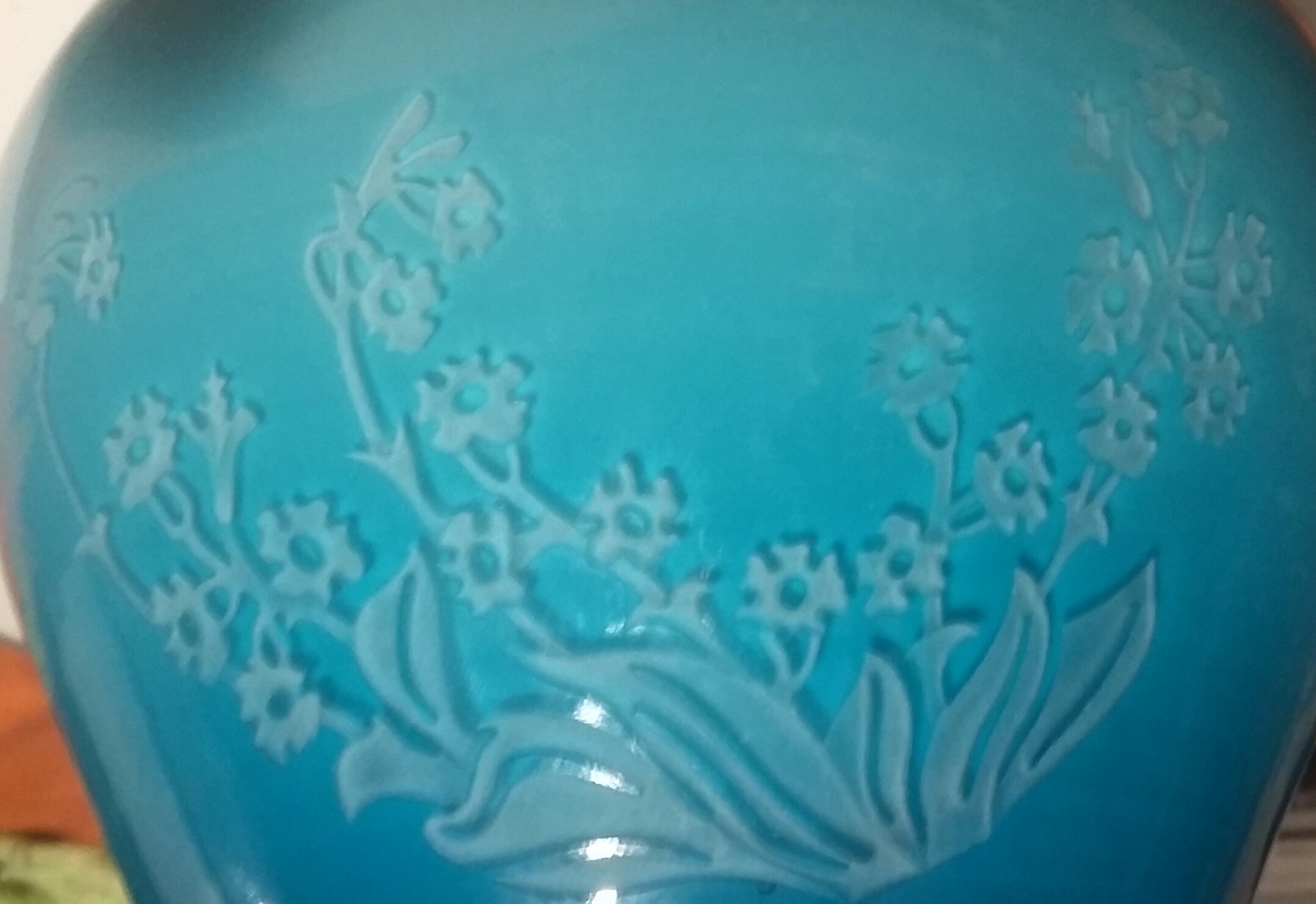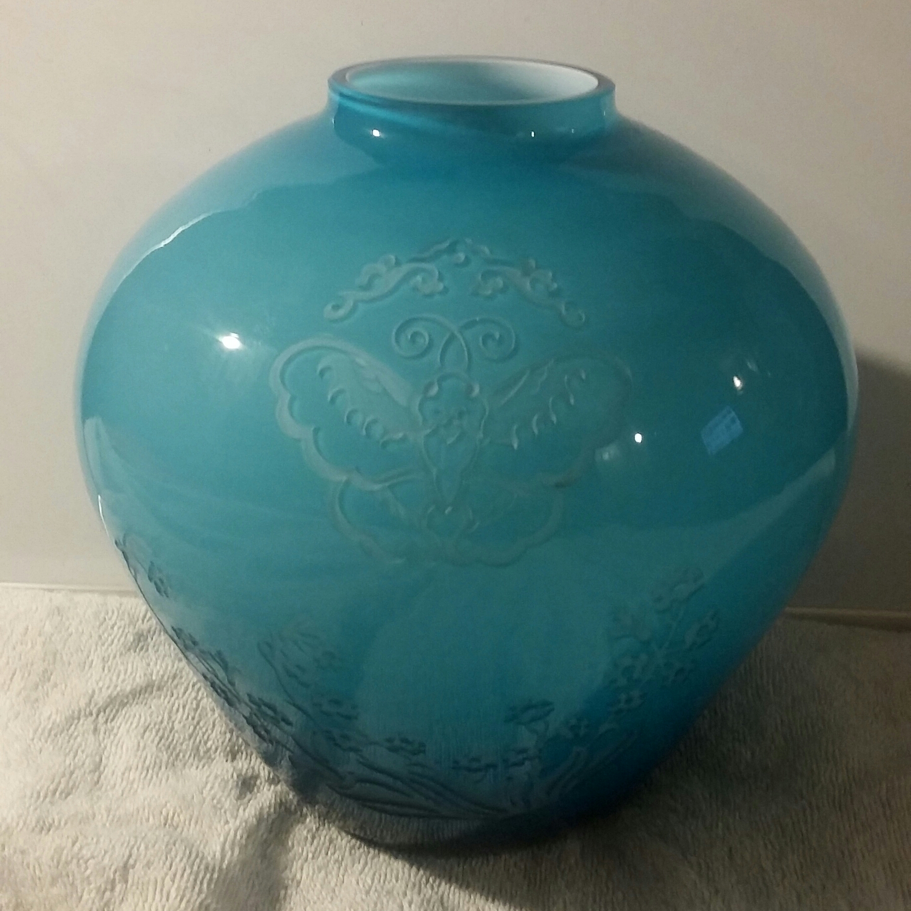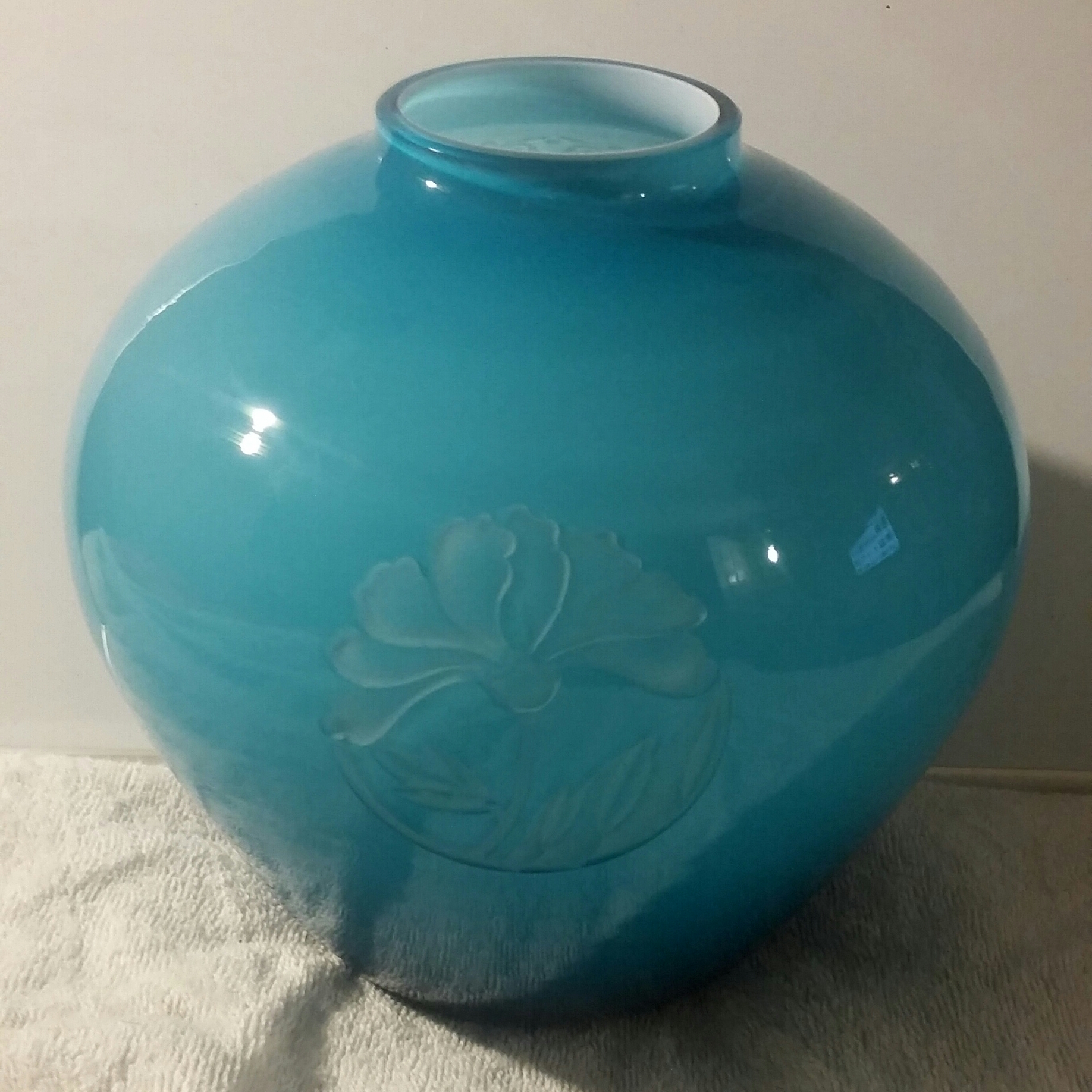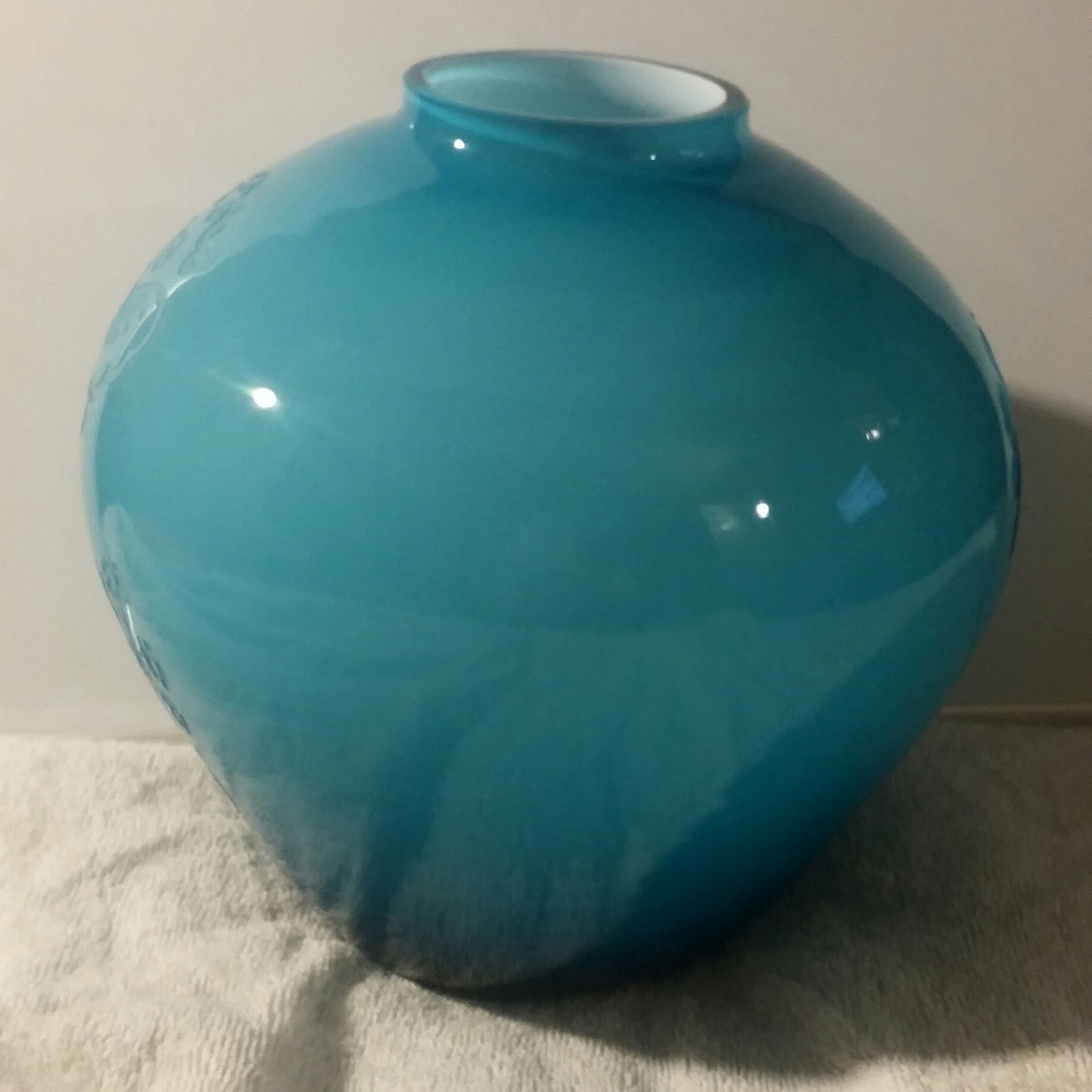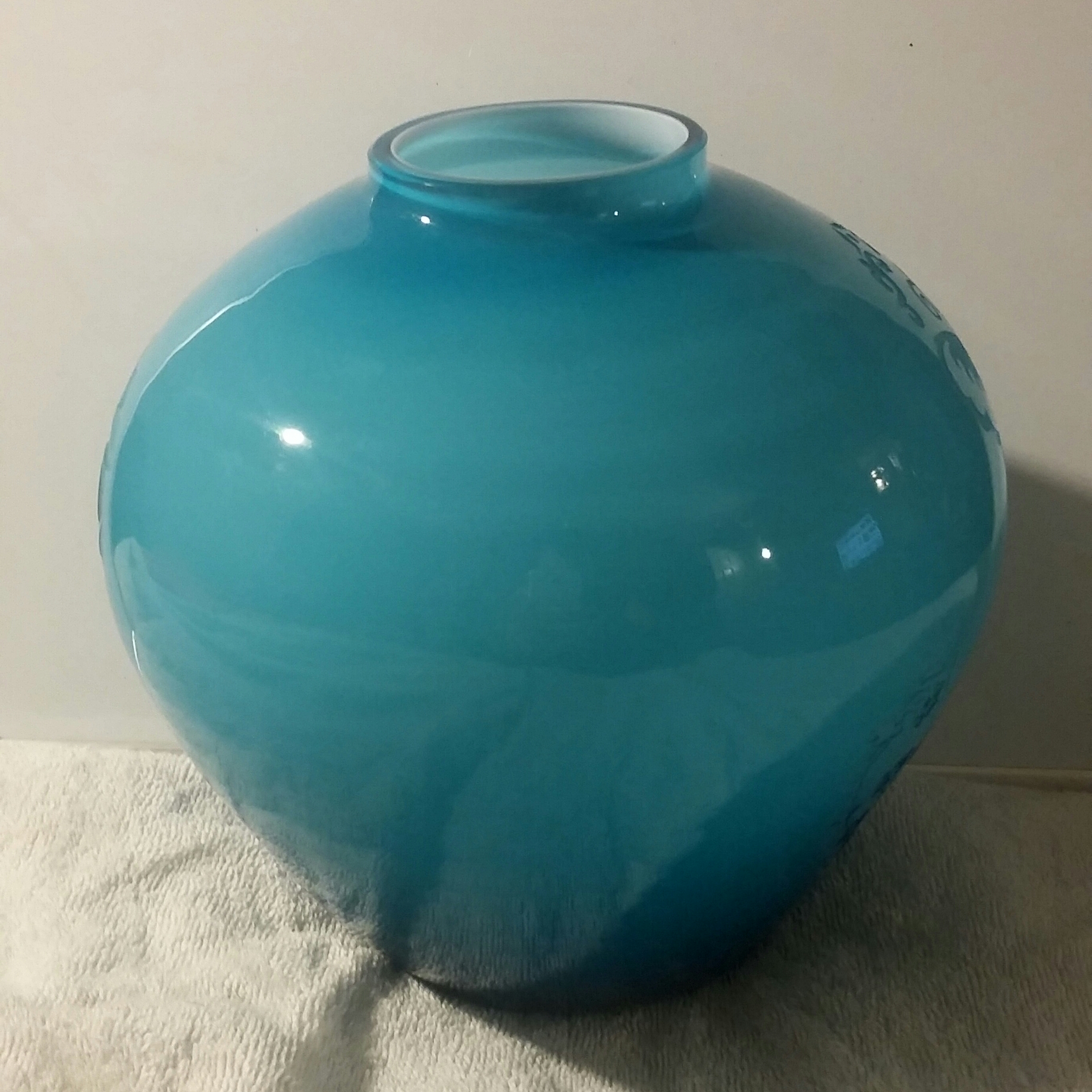 3 and 1/2 inch base* inch at bigges in middle and 2 inch opening on top. Glass is lite blue on top and turns into dark blue by the botton.solid white intior. the glass also has a butterfly etched into it, a rose bush, and a flower/rose.on the bottom it is ingraved "Special for nicolettegoulet inner light crystal 1985. vase is in excellent condition it was found in a 50+ year old hording messing in Las Vegas .