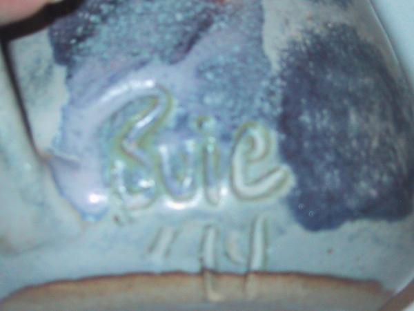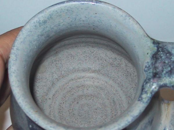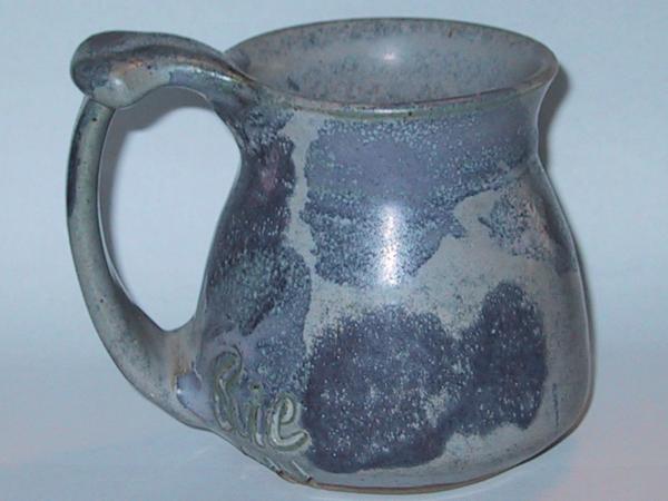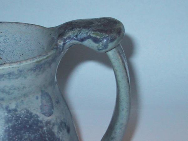 This is a handmade, coil pottery mug. It has a handle, on top of the handle is a lip. The glaze is a light blue with darker blue blotches all over the outside. It is marked Suie '14 near the handle at the bottom of the mug, not on the bottom. The shape reminds me of a pewter mug in shape.
