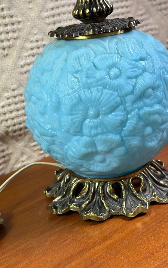 Poppy blue satin glass 'Gone With the Wind' style lamp. Lights upper, lower, and both together. Antique looking brass and hurricane style shade.