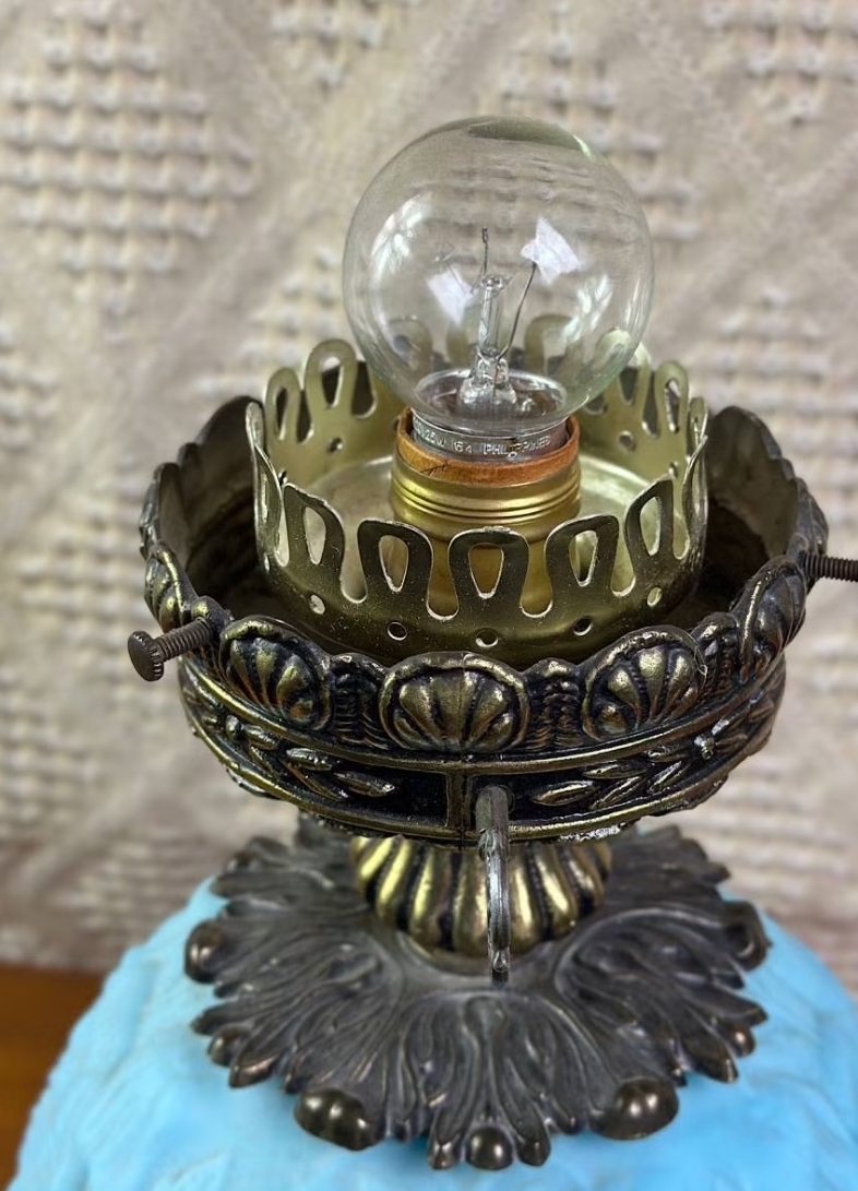 The 'Gone With the Wind' style lamp, popularized in the late 19th to early 20th century, is characterized by its dual-light design and elaborate glasswork. This lamp style was often produced by various companies, including the Fenton Art Glass Company and others, known for their intricate glass designs. The blue satin glass and floral motifs are reminiscent of the aesthetic movements of the time, which favored elaborate and decorative home furnishings.
