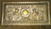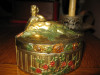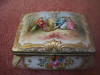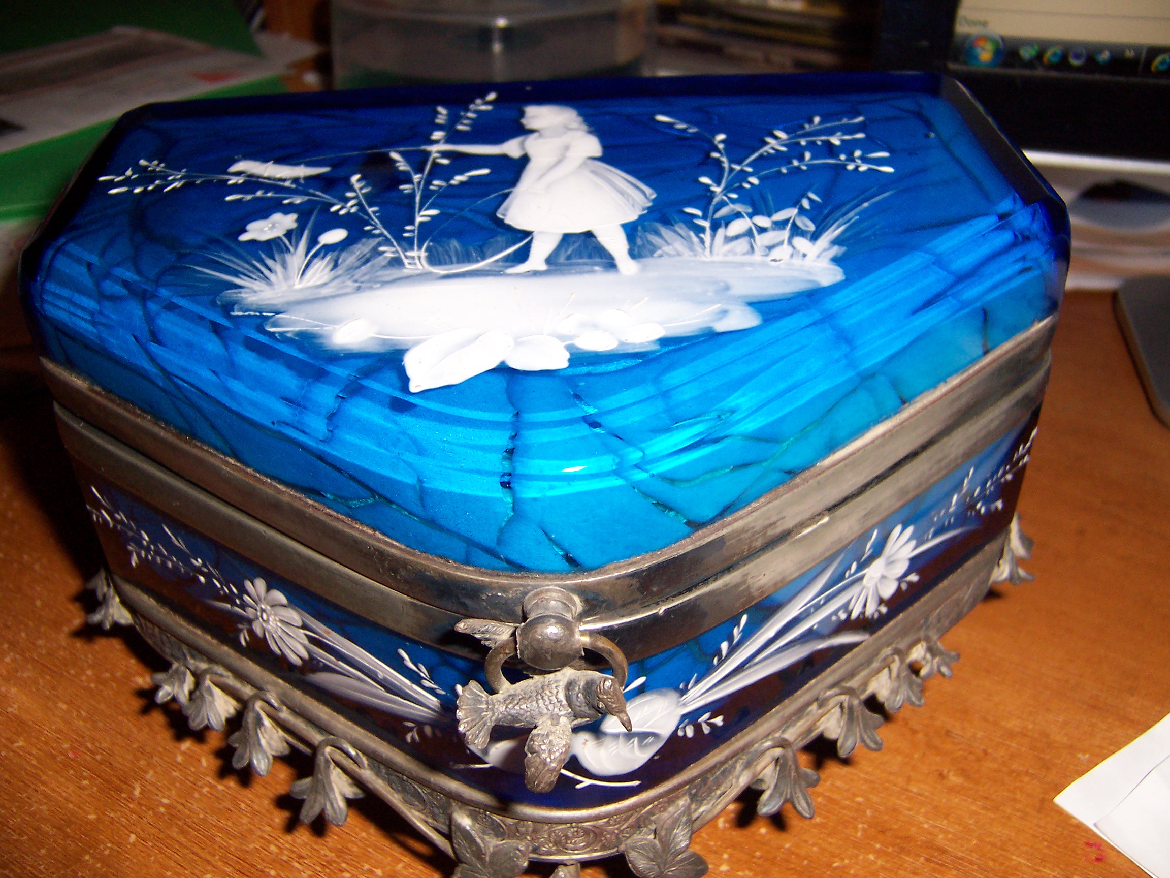 Blue "glass" jewelry casket. Not sure if it's glass or other see thru substance. Has raised white painting on top and sides. Top painting is a young girl with a hoop and stick toy next to pond, grasses, and grasshopper. Side is floral design. Bottom says Hard White Metal and a circle of writing that is illegible but I can get the word "plate" from it. Scales in center. Numbers 50 and 0 on it also. Latch is bird in circle. Inside is a satiny lining ... guessing it's glued or something similar because through the "glass" you can see "cracking" in the adhesive (see picture).