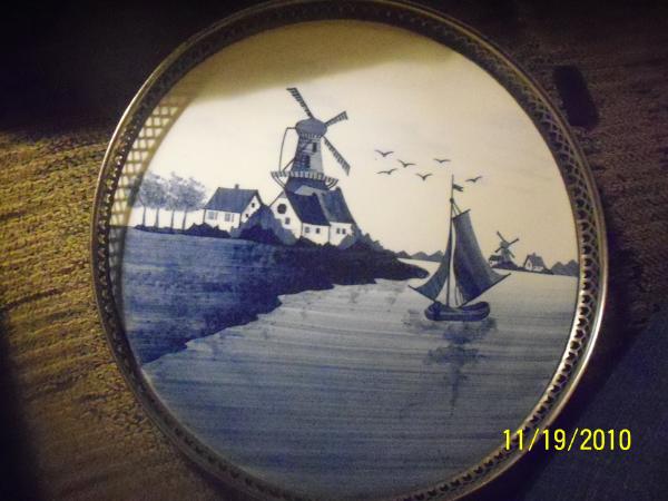 blue painted serving tray, German made, 1913, tray rim says