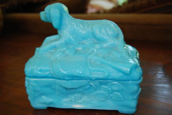 Opaque Blue Milk Glass dog sitting on leaves with a sachel and gun lying beside him. Round sticker with P.V. France on it.