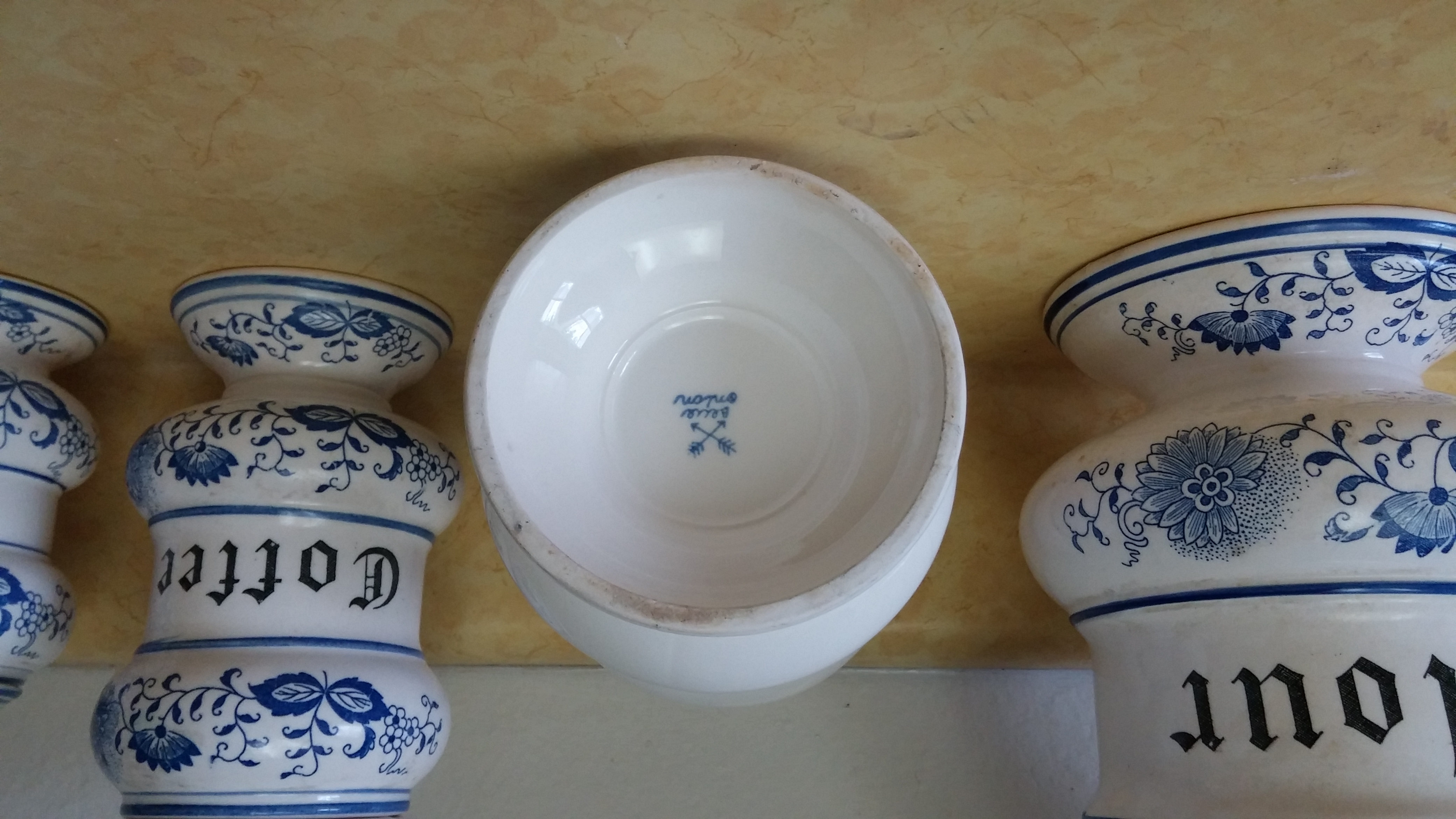 4 pieces, 2 small chips on the "tea" canister. I purchased all 4 pieces for $12 at a yard sale, I'm not exactly sure what I have. I've looked online to estimate value, but value on Blue Onion pieces seems to be all over the place. Do you have any idea what they are worth? Thank you so much!