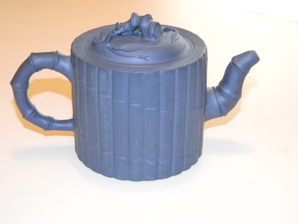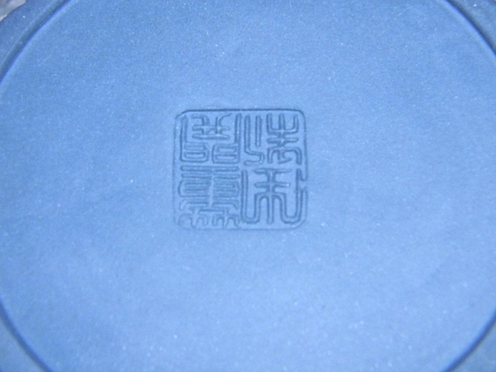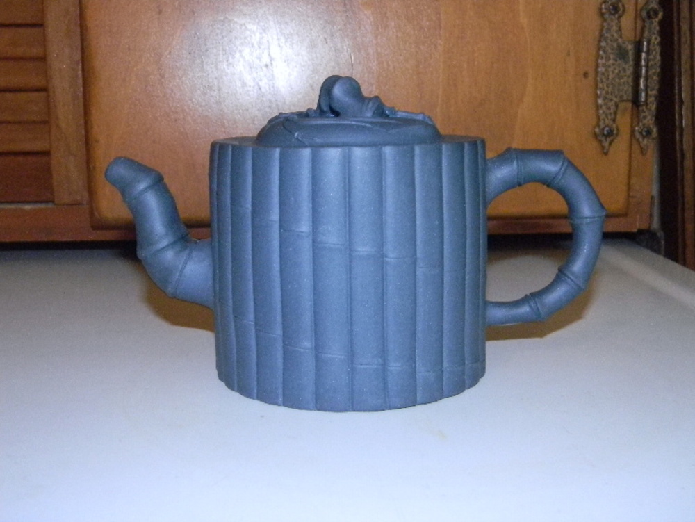 Blue oriental design tea pot with bamboo design handle on spout, pot and top cover. approximately 3 inches tall, approximately 3.5 inches diameter bottom of pot, blue inside and out, Mark in middle of bottom of pot. I think it is clay or pottery. no chips, or cracks, some age wear around bottom rim. Can you tell me what the mark means and possible value, please.