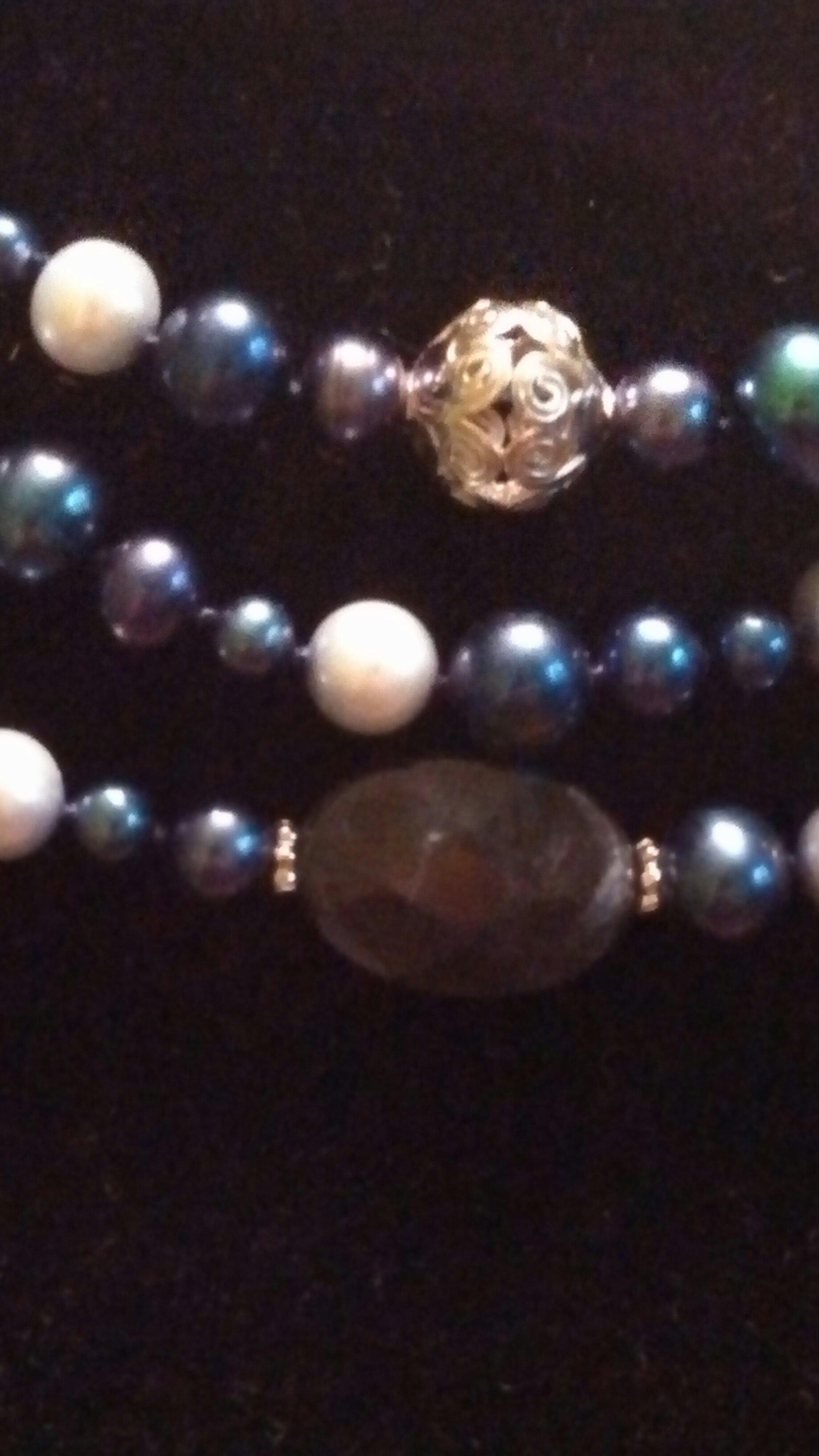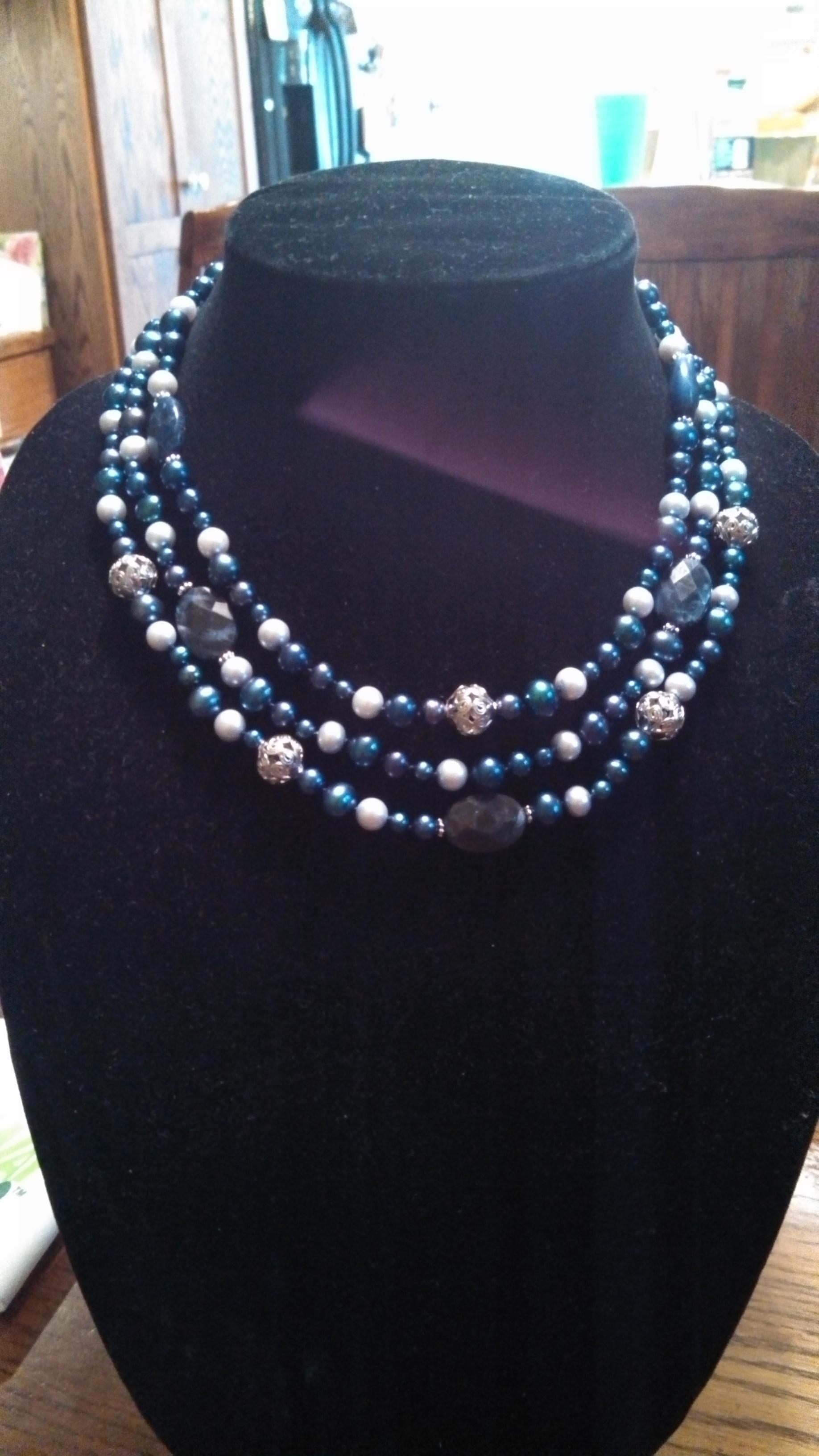 This is a real pearl necklace with 3 stands of shades of blue pearls in different shapes and sizes. There are also 5 1/2 " open scrollwork sterling beads, and what seem to be 5 5/8" faceted opaque oval sapphires. The findings are sterling with a lobster clasp. Markings on a tiny tag include LUC 925 and also ON or NO on the back. The 3 starnds measure between 15 and 17 inches. it is hand knotted. It is in pristine condtion. It is an estate find from ebay, I paid 40.00 and am hoping it is worth much more