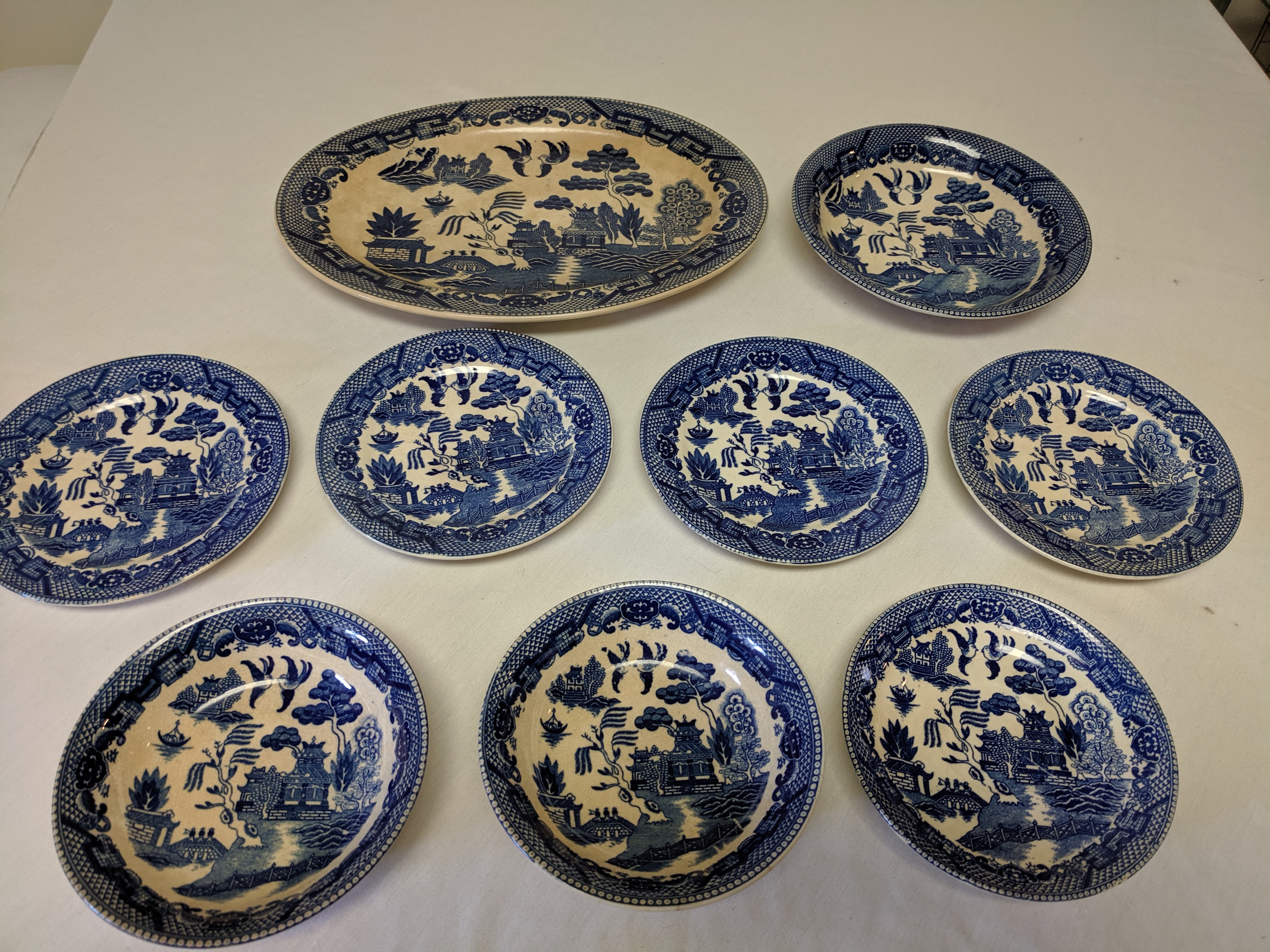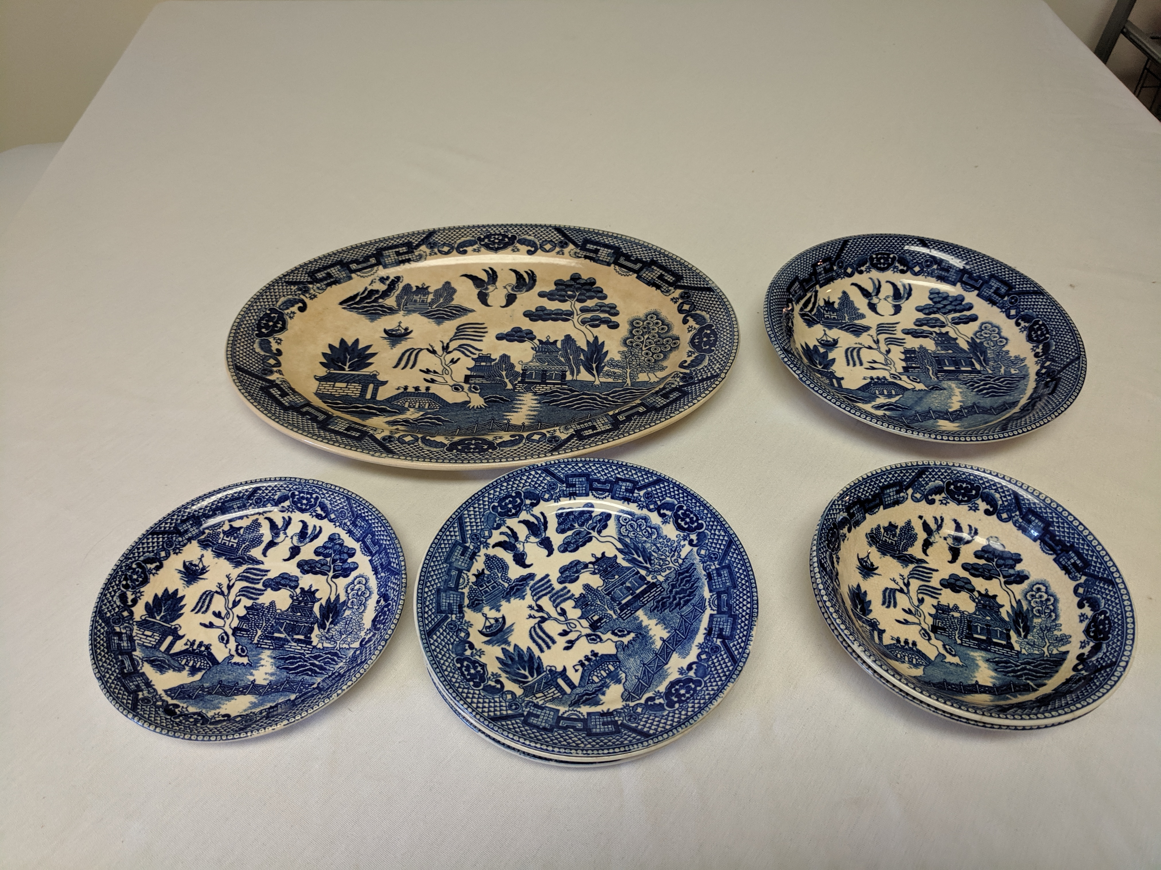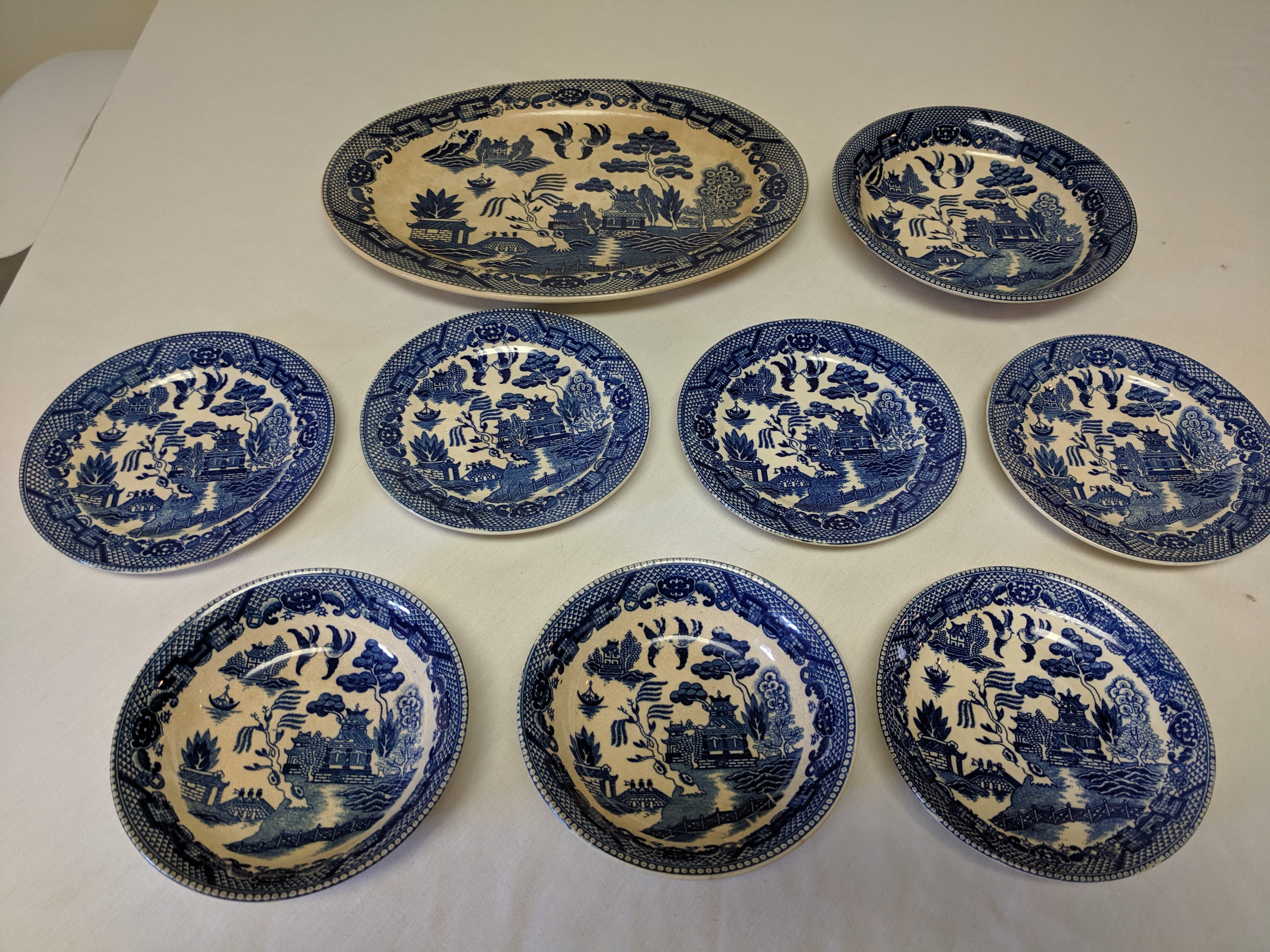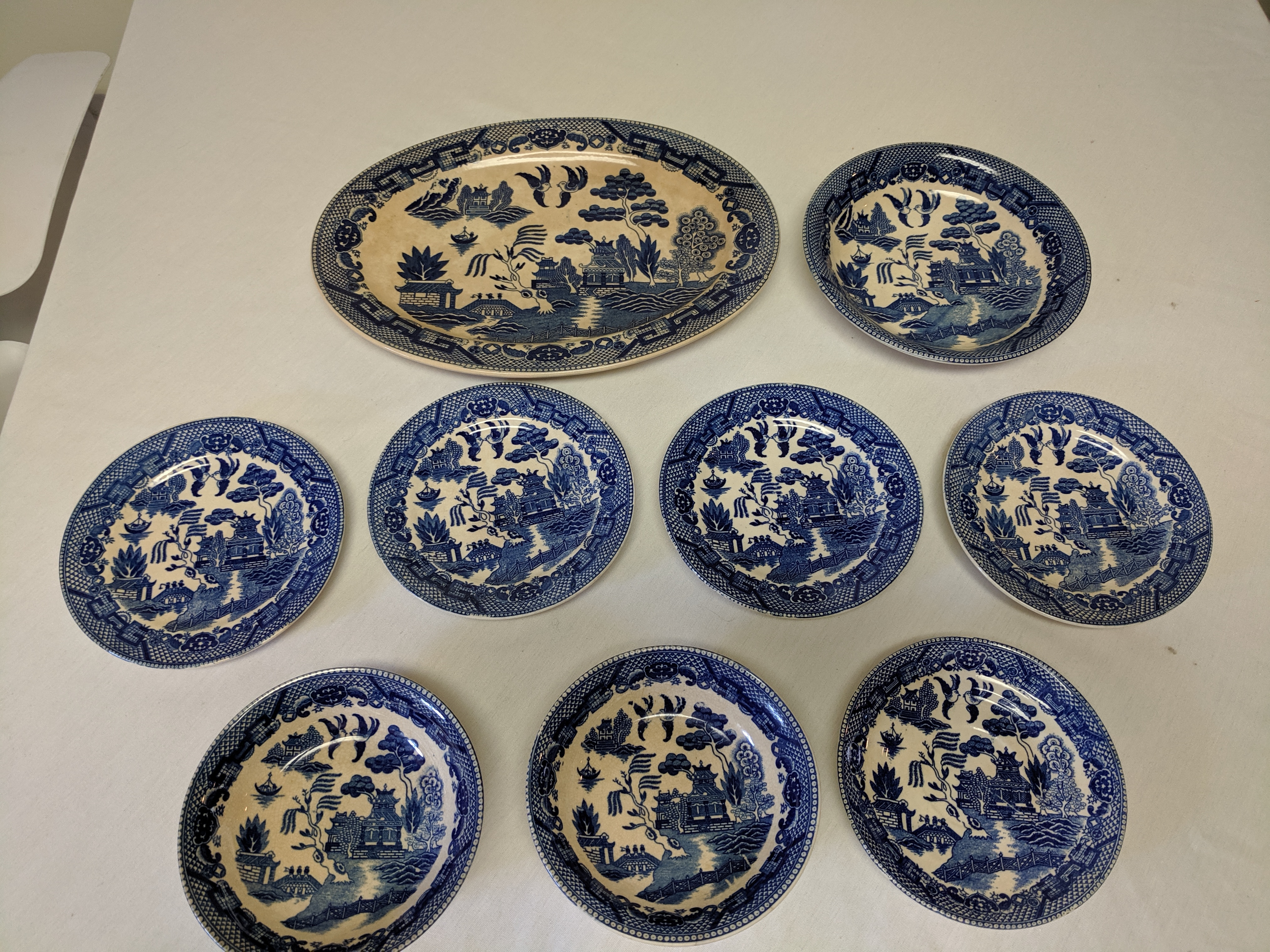The China pieces were given. The set is not complete. There's a large oval plate, 4 saucer plates, 2 small bowls, one plate, and 1 medium plate. So, 9 pieces altogether. The pictures are painted in blue with clear crackle glaze. They all say Japan on the back assuming that they were made in Japan. There are signs of the paint fading. I'm not sure when the China were produced.