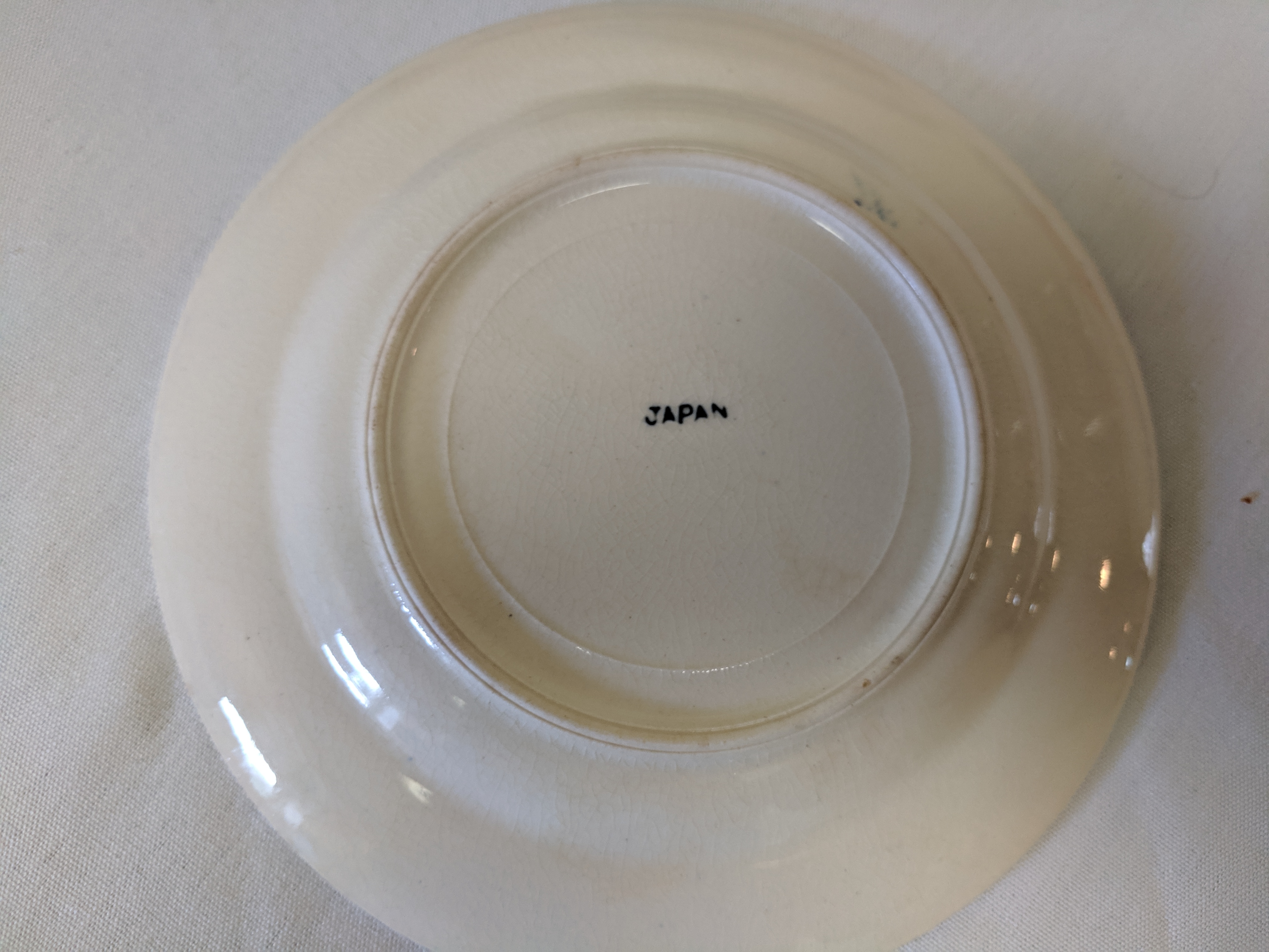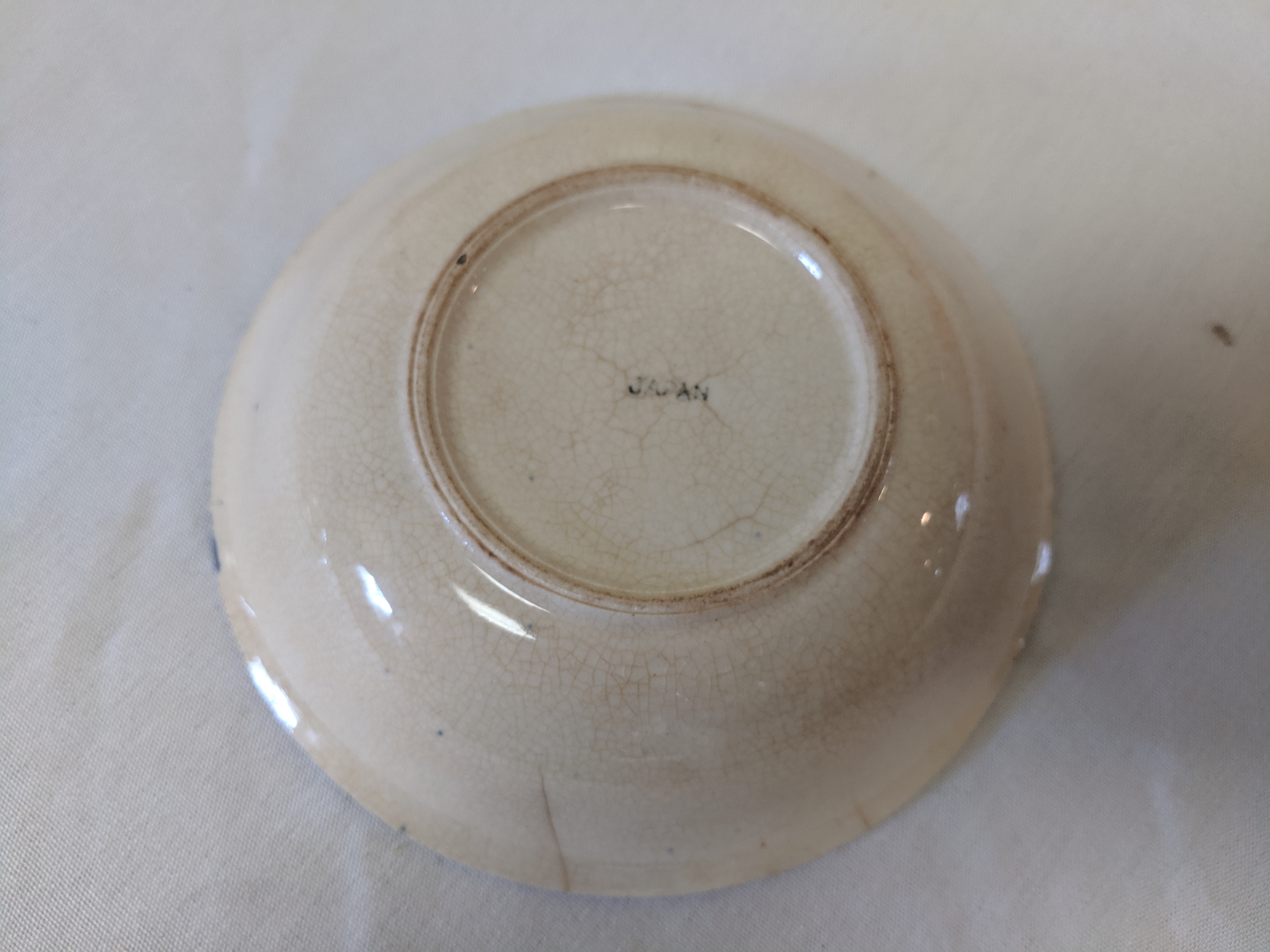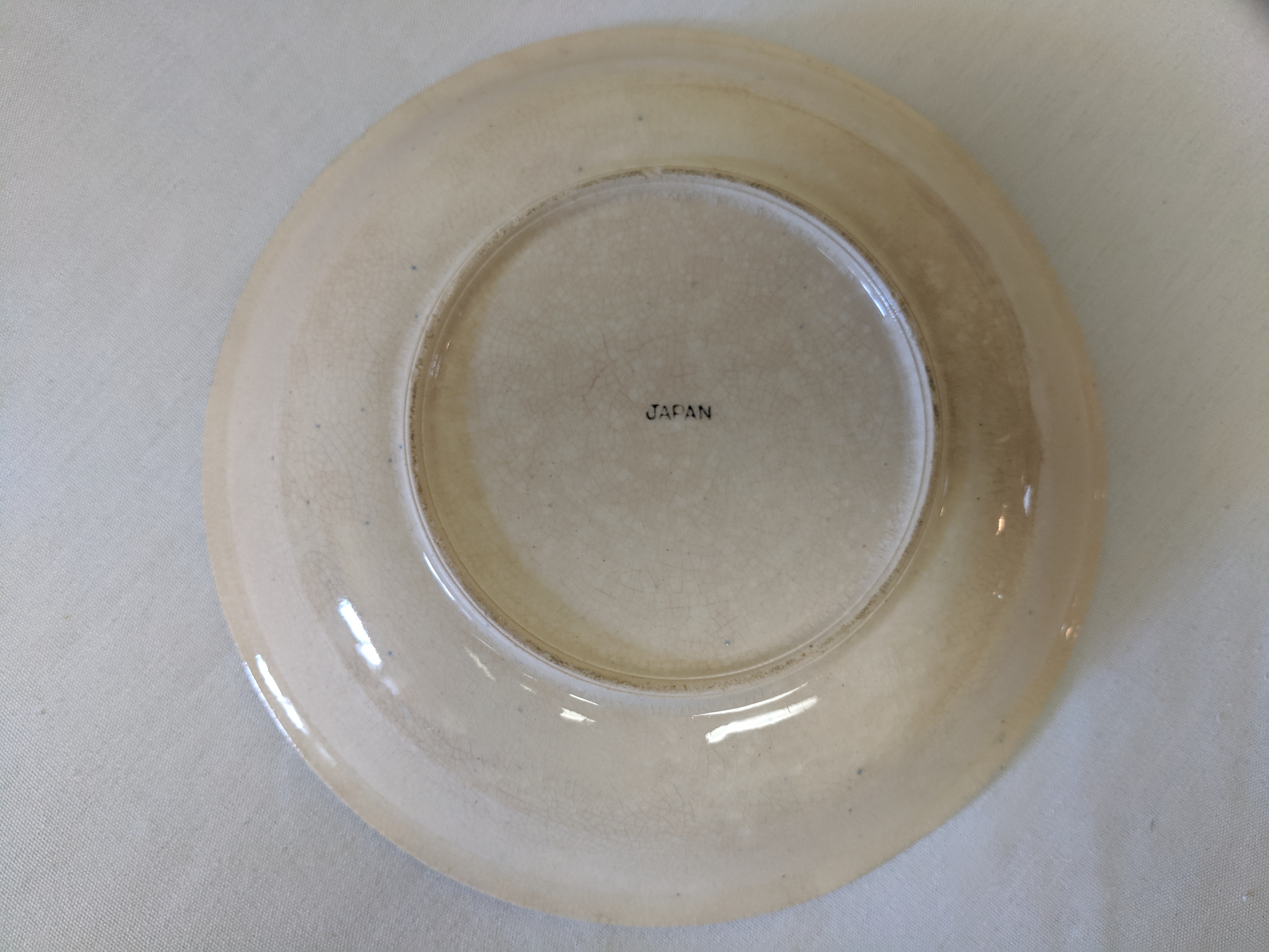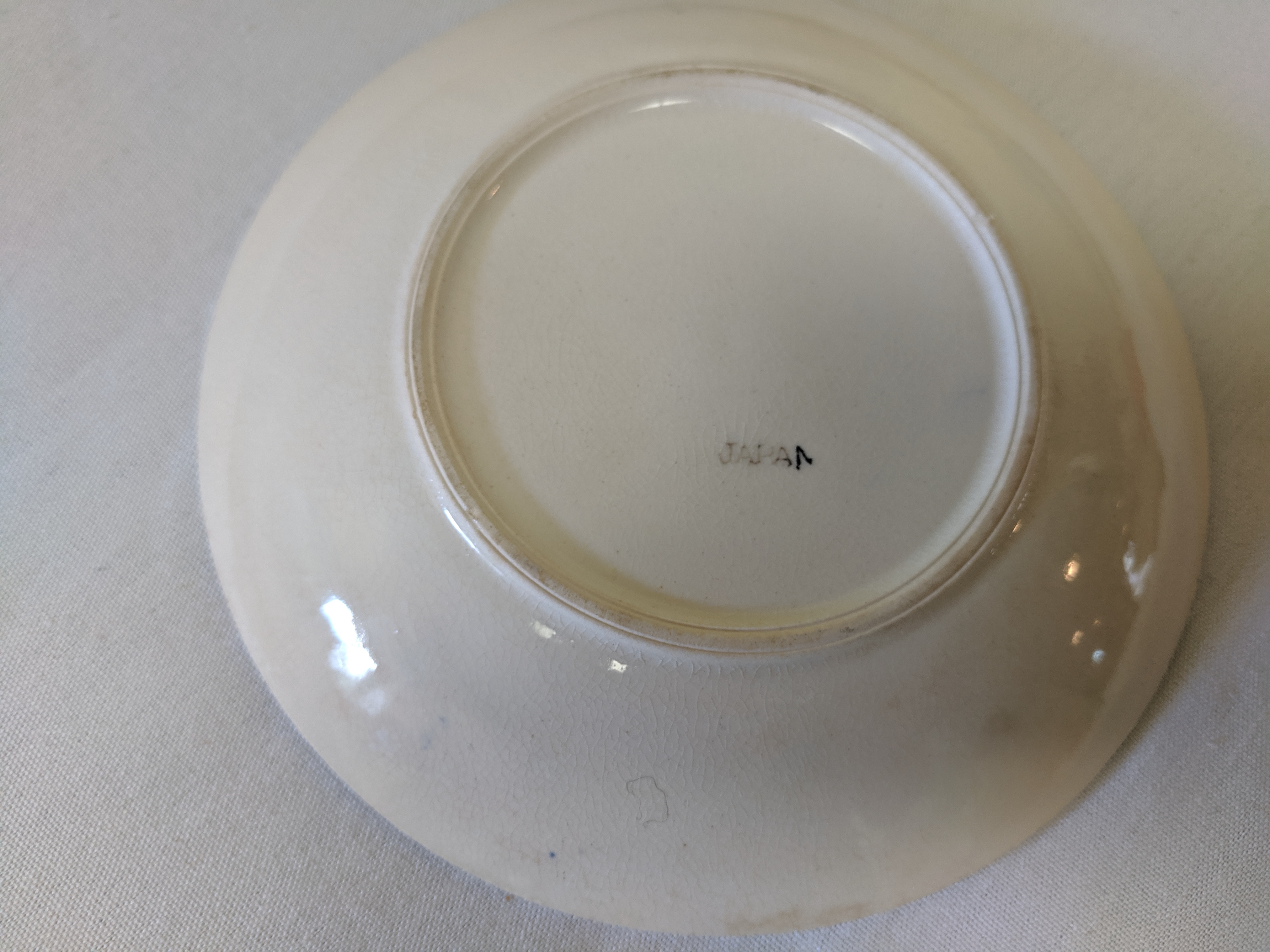 The China pieces were given. The set is not complete. There's a large oval plate, 4 saucer plates, 2 small bowls, one plate, and 1 medium plate. So, 9 pieces altogether. The pictures are painted in blue with clear crackle glaze. They all say Japan on the back assuming that they were made in Japan. There are signs of the paint fading. I'm not sure when the China were produced.