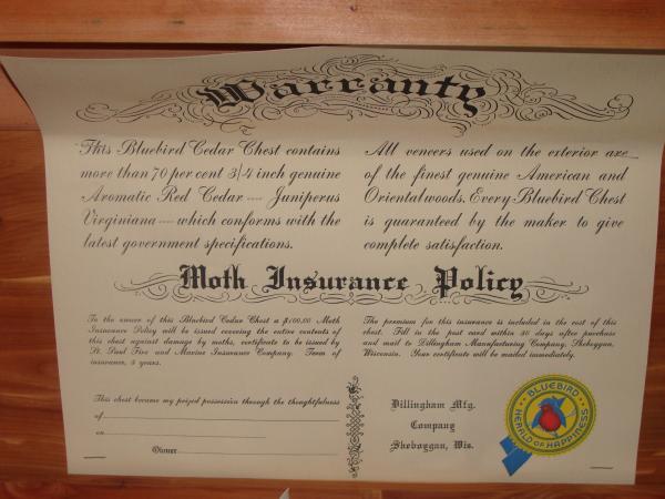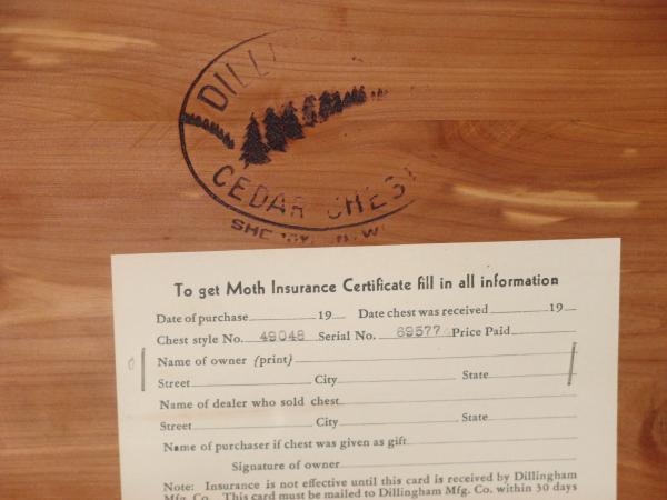 Sorry I don't have an answer for you. I also have a Blue Bird Cedar Chest that I am looking for more information on. I have not been able to find out much more than it was made by the Dillingham Manufacturing Co. in Sheboygan WI. I have not been able to find out how long that company was in business. Started sometime in the 1920's I think but don't know when it closed. I also know they made a lot of other products such as medicine cabinets and folding chairs but don't know when they started and when they quit making cedard chests. Good luck with your search. They really are beautiful.