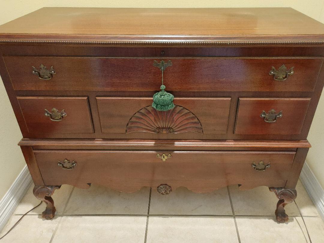 Mahogany carved and beaded cedar chest.