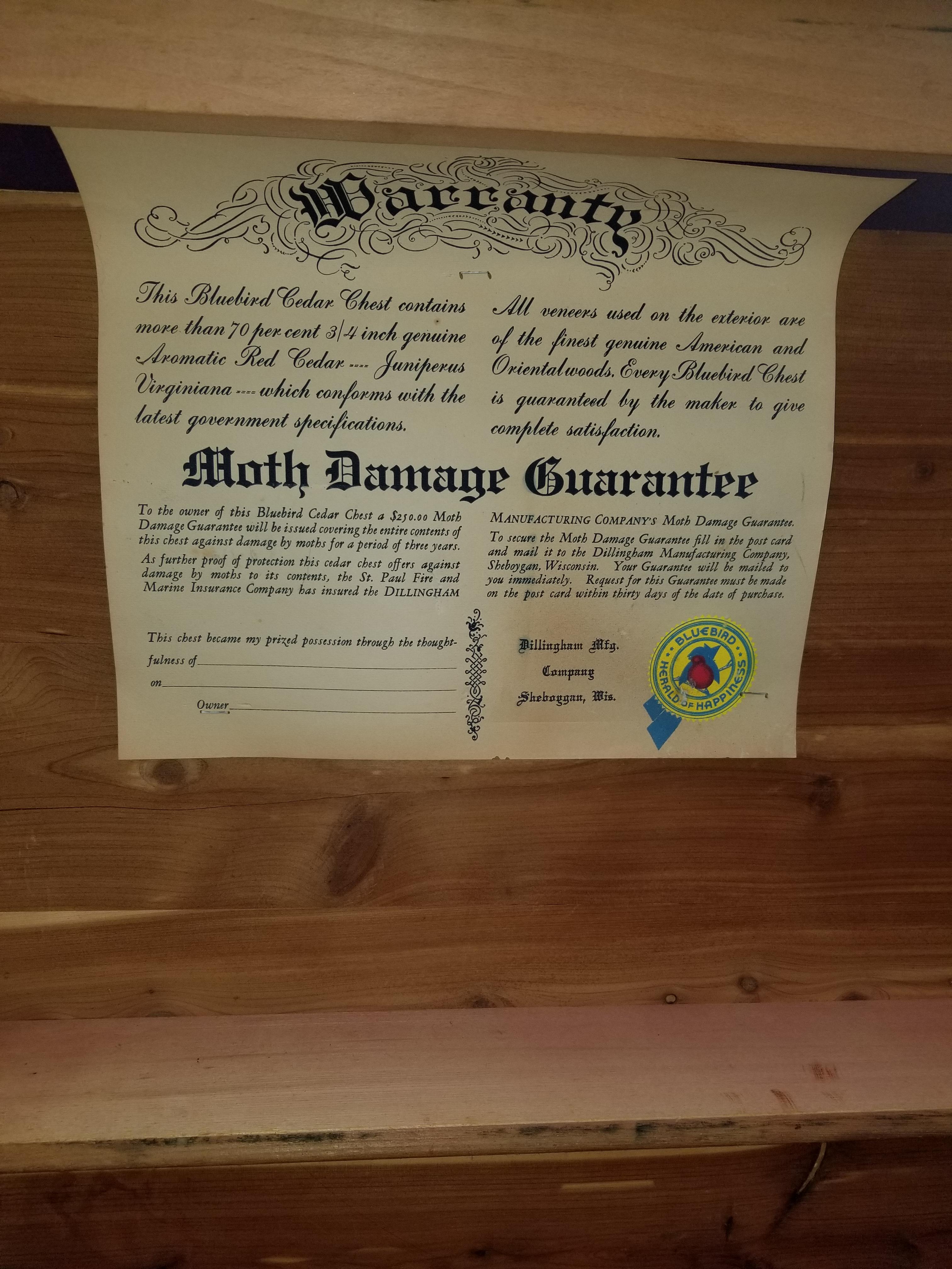 I have a bluebird cedar chest that contains more than 70% 3/4 inch genuine aromatic red cedar-juniperus virginiana. Made by Dillingham Manufacturing Company in Sheboygan WI.