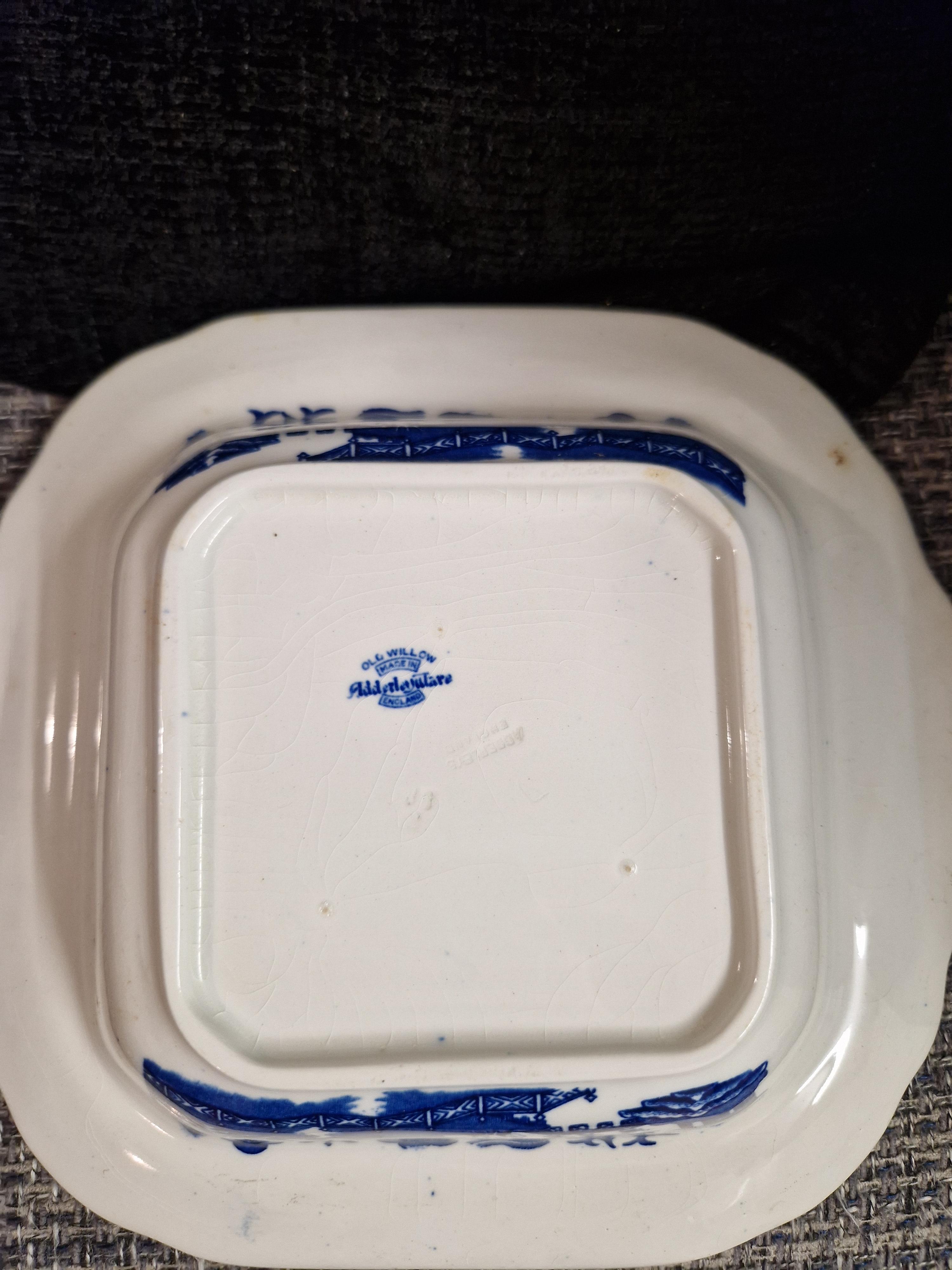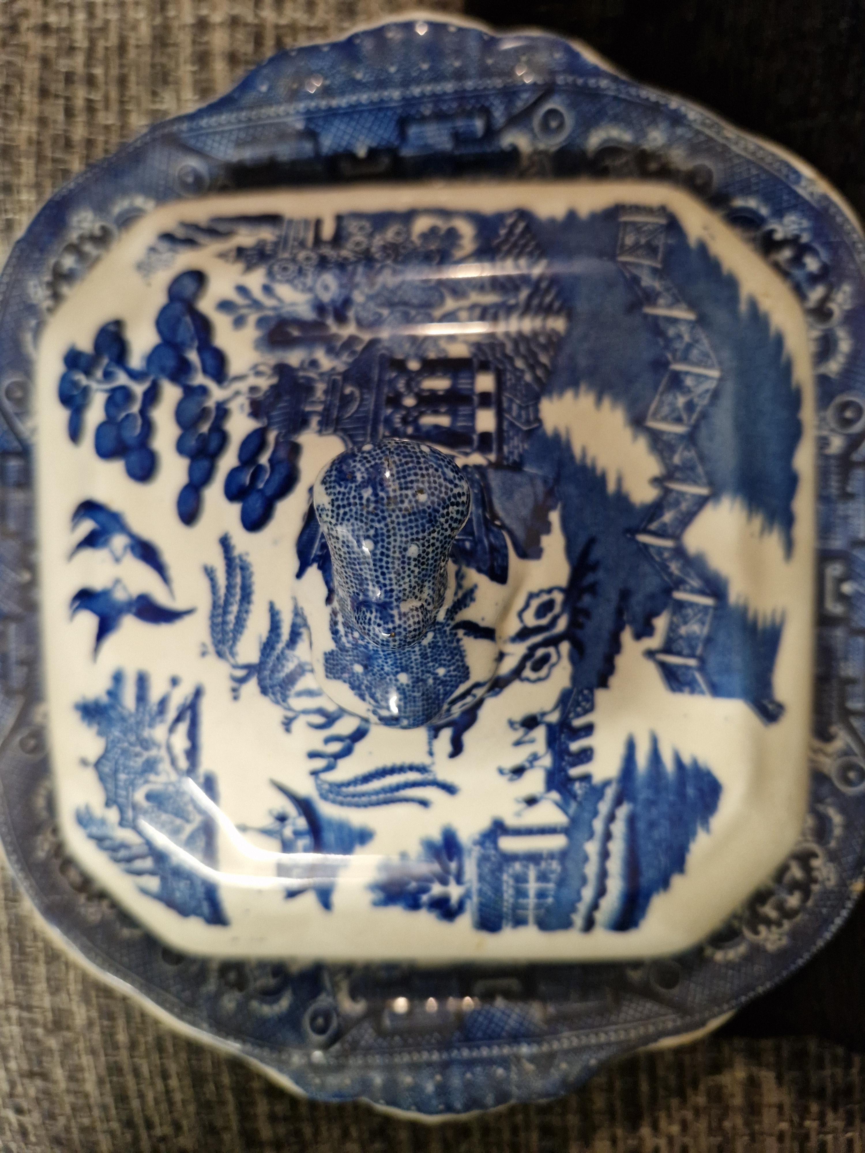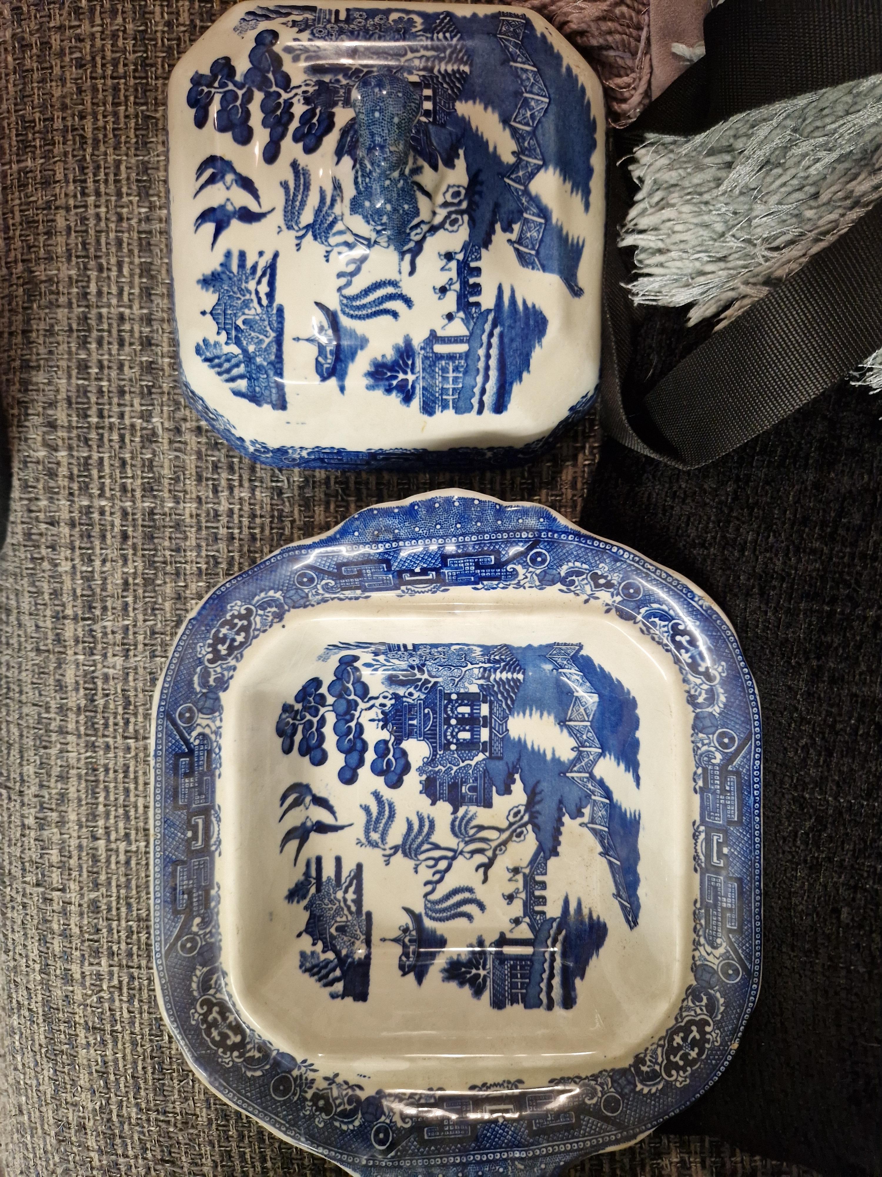 Antique 1860s to 1920s Blue/White Willow Crown/Bell/Wreath Mark England Covered Vegetable Dish Square Dinnerware Asian Inspired Home Decor