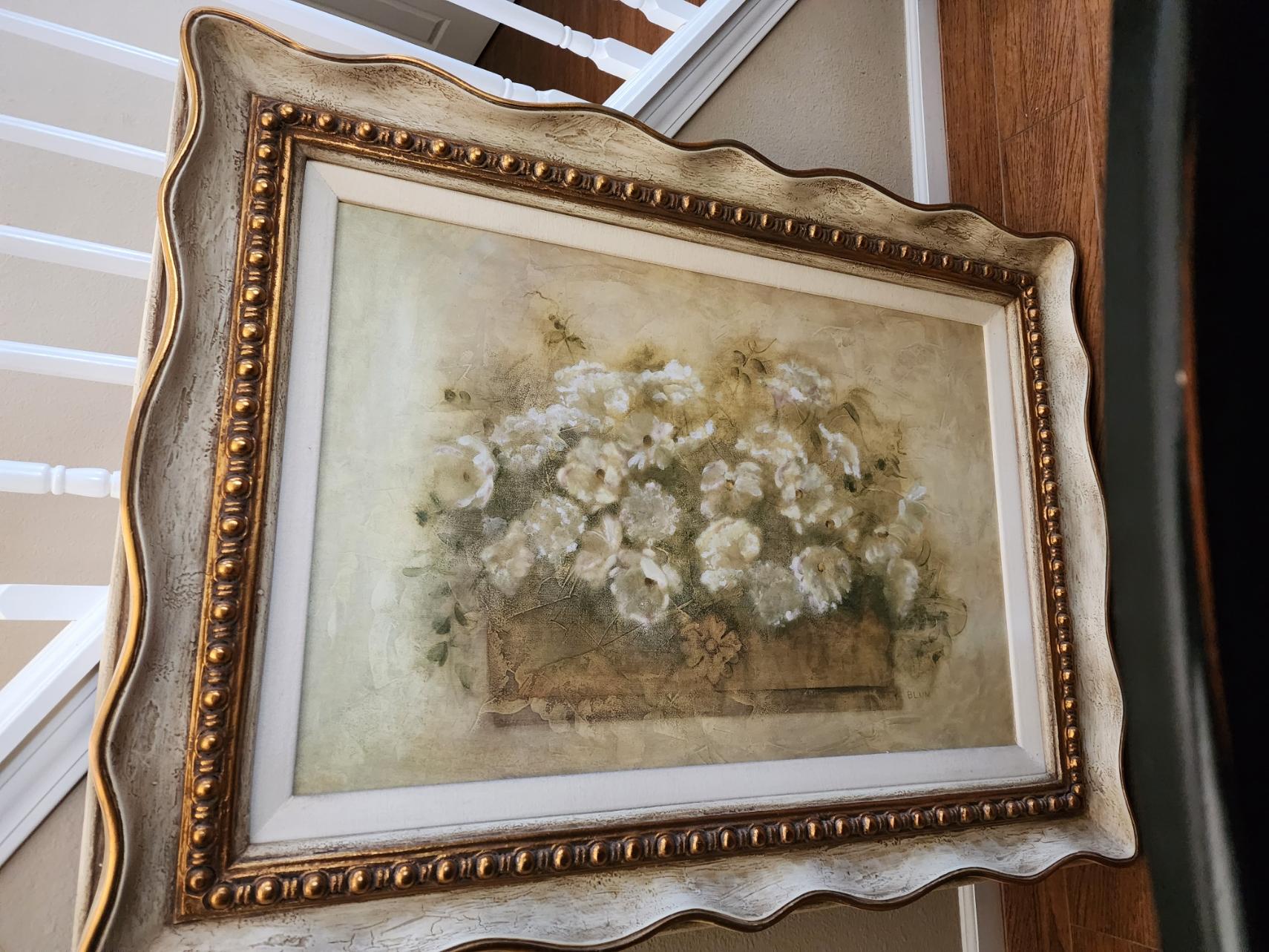 I don't know much about this item, it was in my mother-in-laws house. My wife is conducting an estate sale. I found one of the exact same ones for sale online for $695 with this description: Vintage Framed Giclee on Textured Board White Floral Bouquet by Blum. It is 3 feet by 4 feet including the frame.