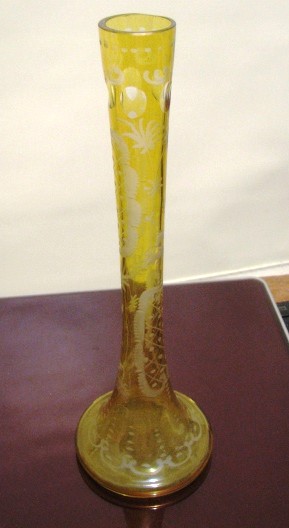 There are two of these bases. No pontil, blown glass, etched and engraved. But one is slightly larger at base, and slightly taller than the other. The decorations are transposed on the vases. There are two animals on each. One with tall ears and one w/no ears. One vase has the animal with ears at the top and the one w/o at the bottom. The other vase the animal w/o ears is at the top and the other one at the bottom. No damage. They look a little like Egermann from the research I've done.