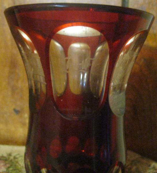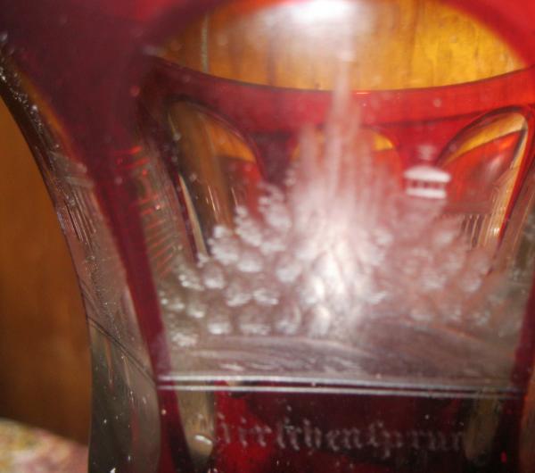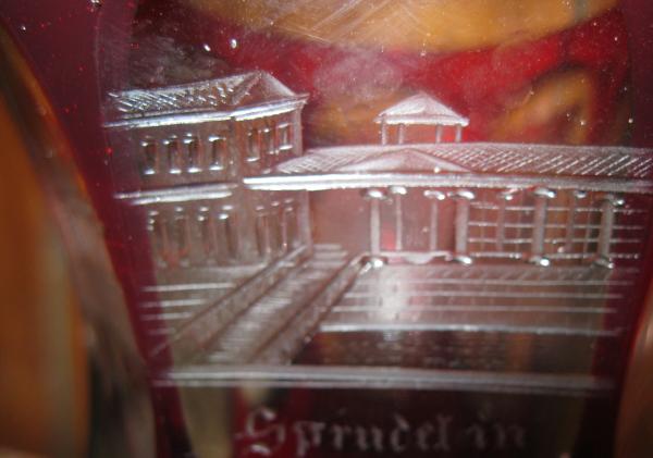 I know that this is an old Bohemian spa glass. I am not sure of its origin or manufacturer or how much it cost. The base is heavy which I am told is a symbol of its age. 1860's? The design on this piece is unique as I have not seen to many like it. The other ones I have seen do not have as much ruby coloring as this one. This one only has a few clears spots and it for the majority almost all ruby glass. There are 5 etching in the piece, which I dont know if you can read in the pictures but I have a hard time reading it in person because its obviously German. There is a very small chip on the rim, and a scratch on one of the clear spots of glass but otherwise this piece is in near mint condition. Any help or information on this piece would be greatly appreciated. Price? History? What do the initials J.F. mean? Manufacturer? Owner? Thanks.