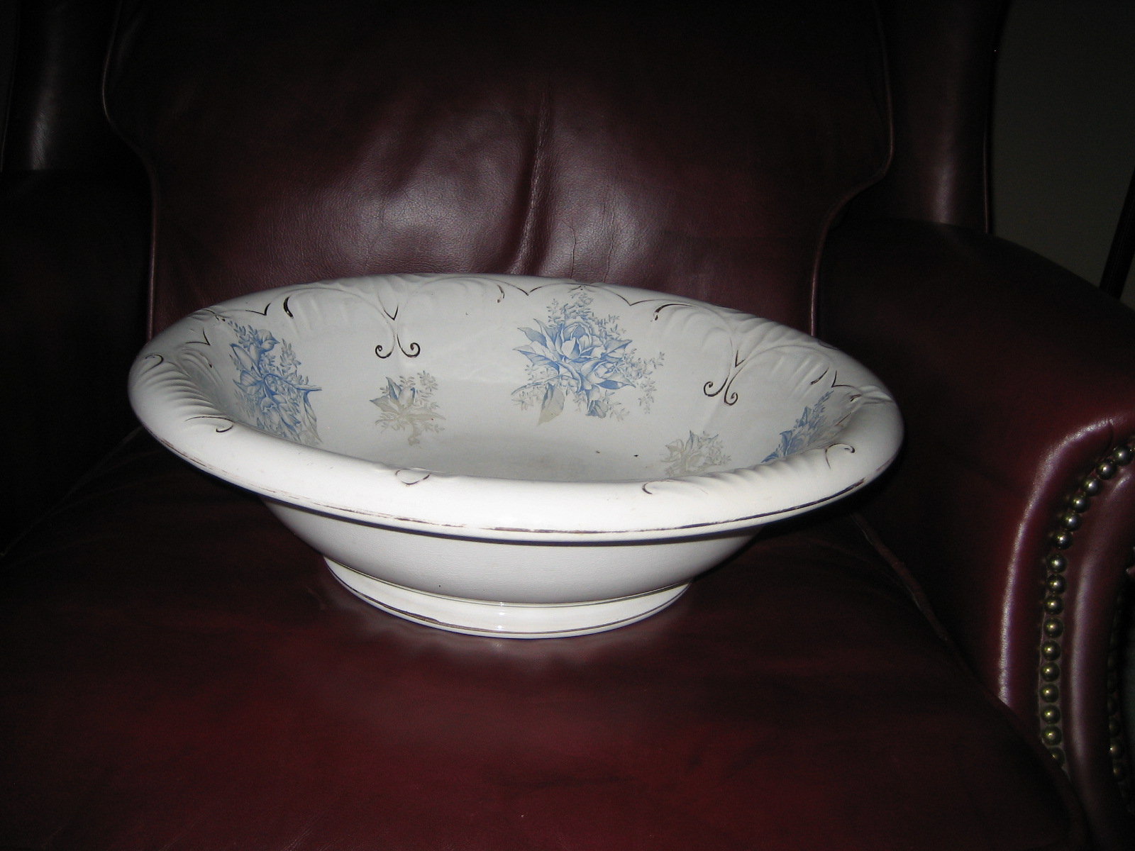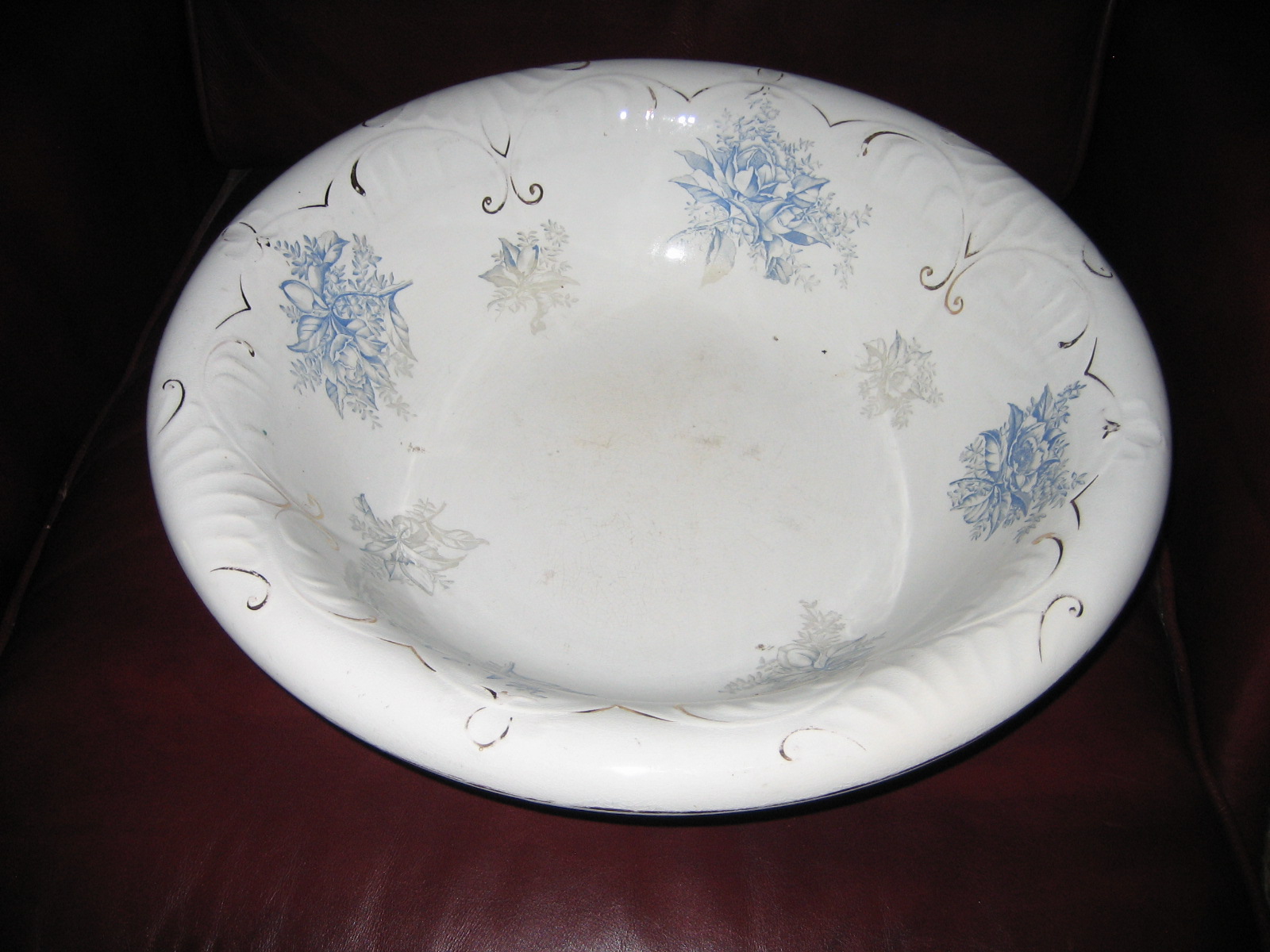 The bowl has blue flowers with gray leaves. It also has gold accents, some of which are wearing off.