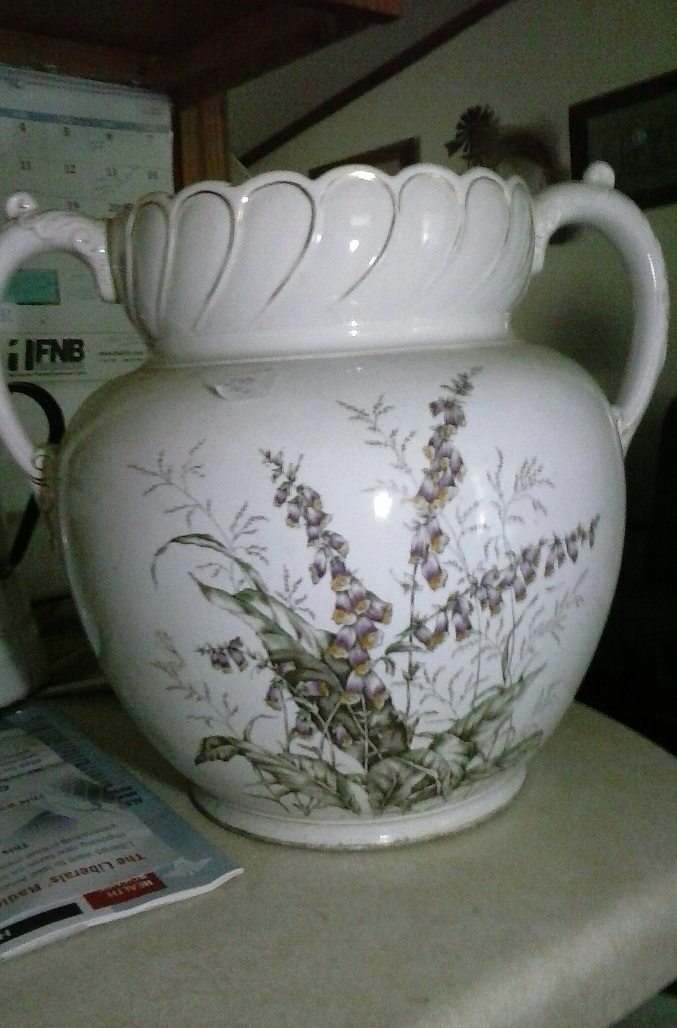 Two handled vase with gold number 4 and bona fama melior zona . Purple flowers possible fox glove, blue bell