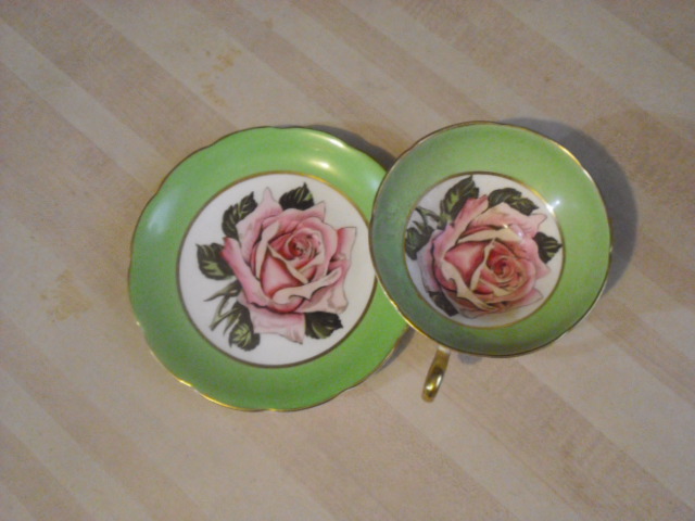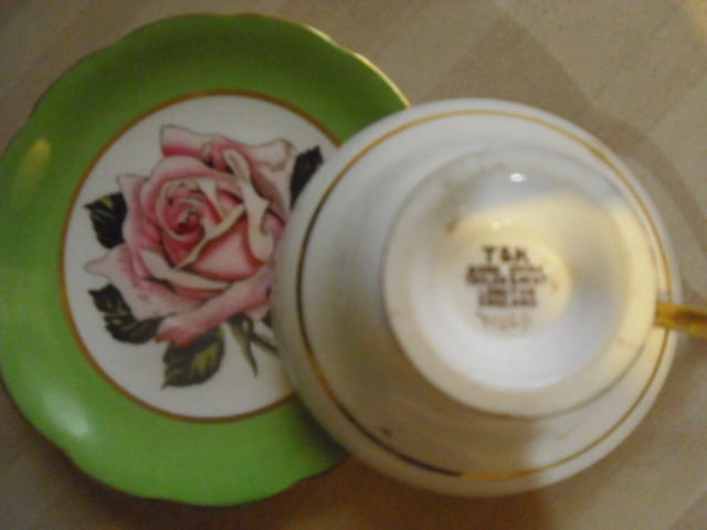Cup and Saucer matching decor. Saucer: 5 1/2" gold rim with bright green color 1/2 way down saucer to a nother gold rim that brings you to bottom of dish that has a very large pink semi budded rose with green leaves. stamp on back of plate readsT & K bone china Taylor & Kent Longton England . Cup is a 4 " wide 2" tall wide slightly scalloped brim tappering to bottom same exact design inside cup. Handle is gold in color outside is white with gold rim around middle and gold footed bottom. Same stamp on bottom of cup.
