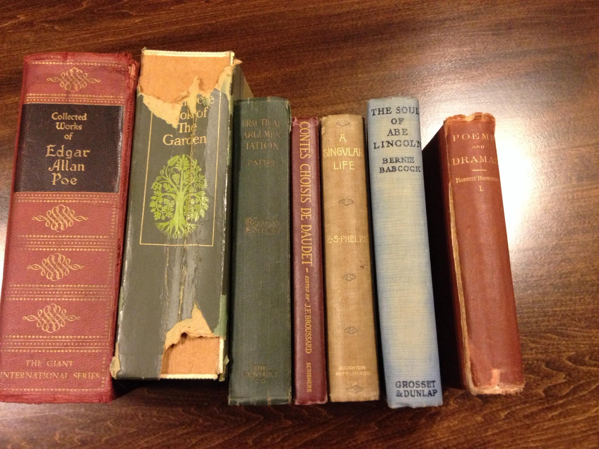 Poems and Drama by Robert Browning a new edition book Boston: James R. Is good and Company late Ticknor & Fields,and Feilds,Osgood & Co. 1875.. The soul of Abe Lincoln author Bernie Babcock copyright 1923 by JB Lippincott Company Grosset&Dunlap..A singular life by Elizabeth Stuart Phelps Houghton Mifflin Co copyright 1894 (2200 also printed on it) contes Choisis De Daudet edited by J.F Broussand Charles Scribners Sons copyright 1919 ..Practical Argumentation Revised Edition Patlee the century co. Copyright 1909 1915..collected Works of Edgar Allen Poe 1927 copyright by Walter Black