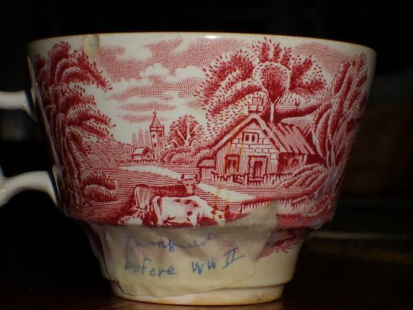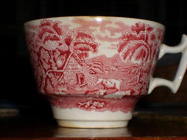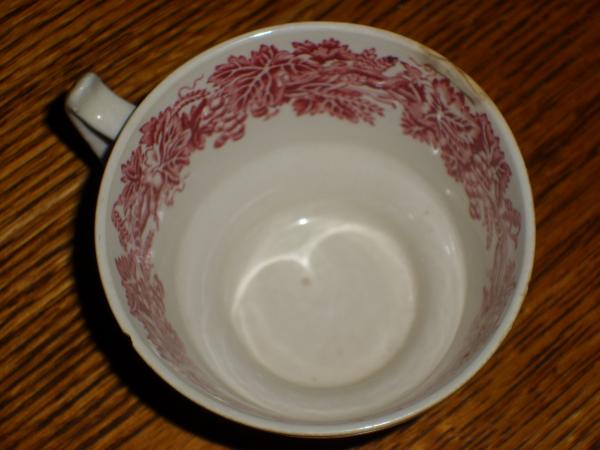 cup portrays scenes similar to Booth's "British Scenery" pattern A8024. Two different scenes on outside of cup. Pink on white. Inside white with grape vines around upper 1 1/2" at top of cup. Color same as Crown Pink in Booths.
