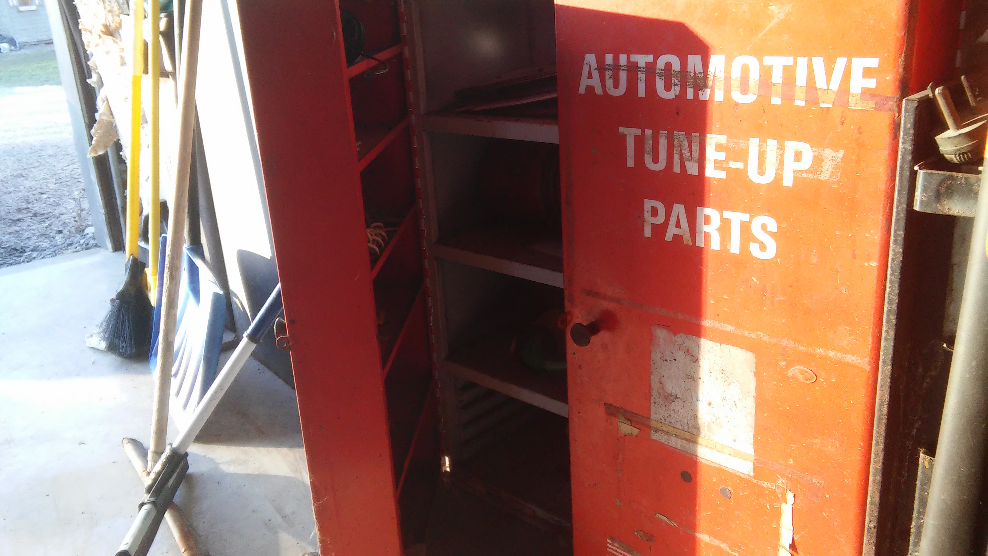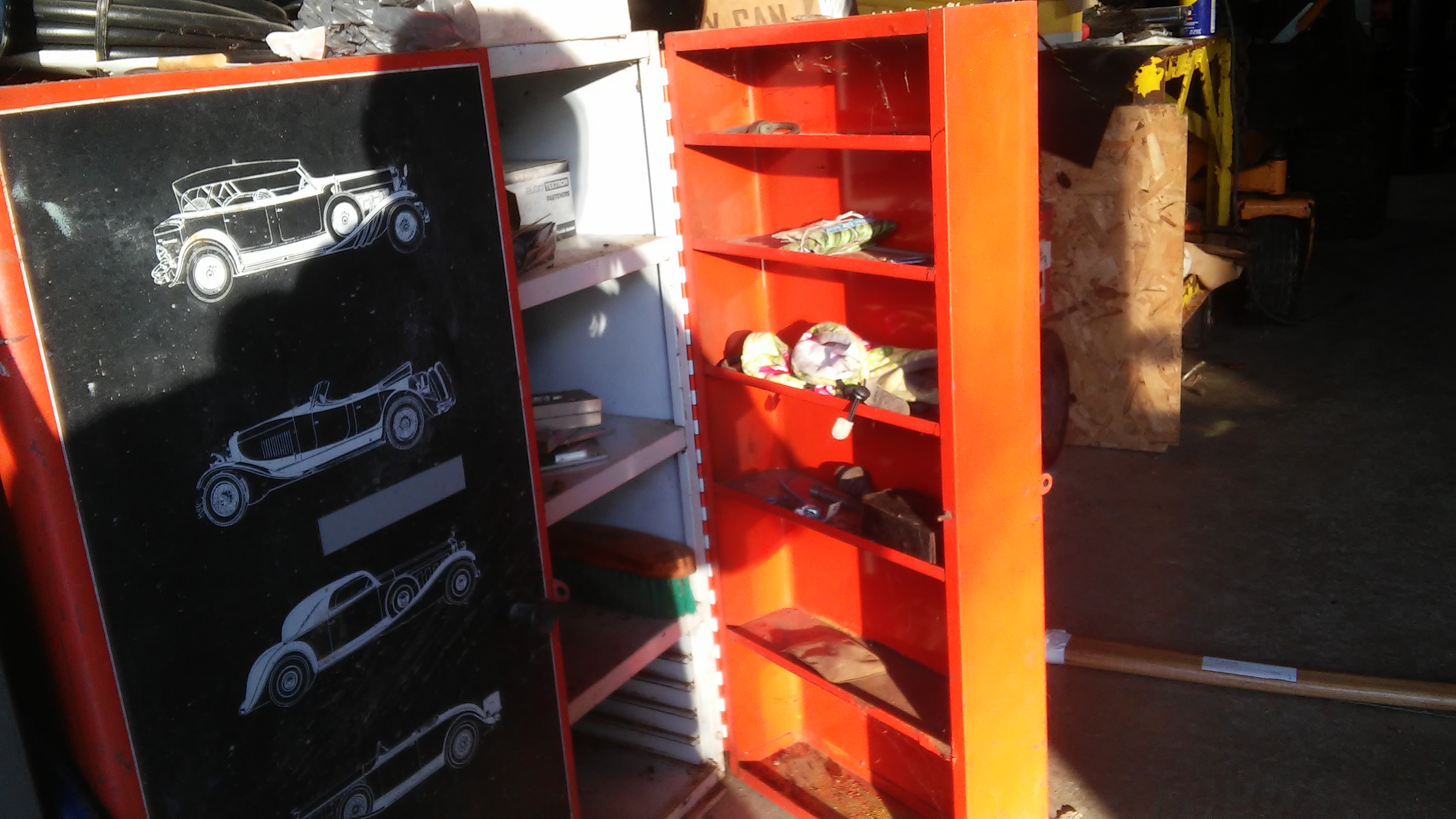 Painted orange white and black with pictures of old cars down left door.very clean inside with lots of storage room, lightly used in past and always been in garage or basement