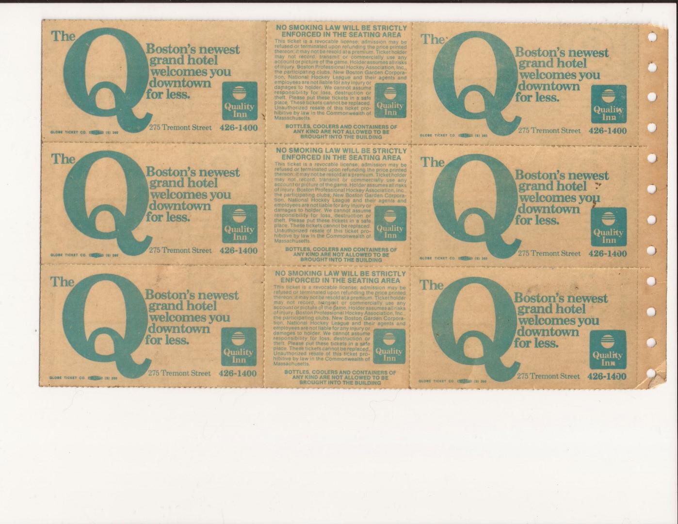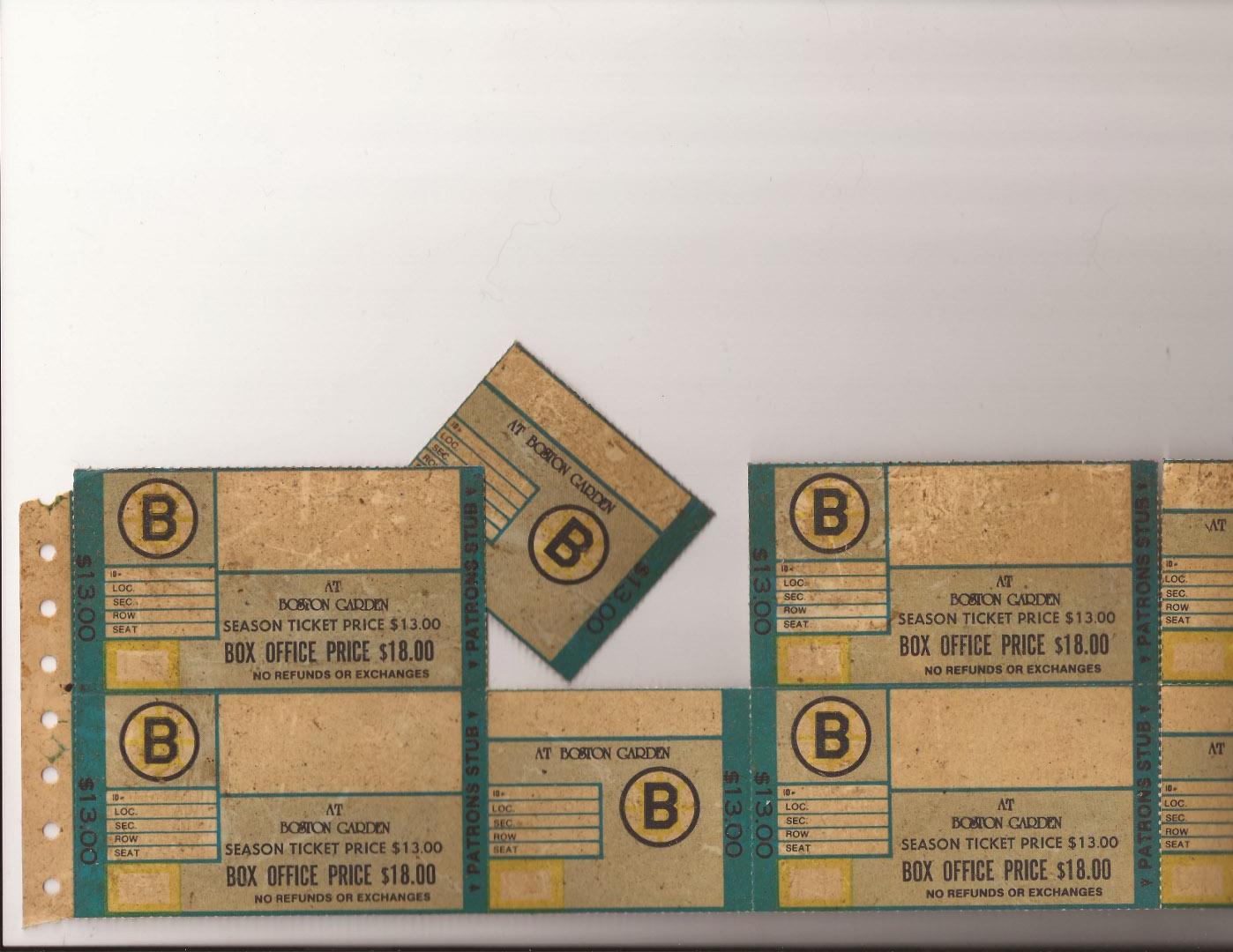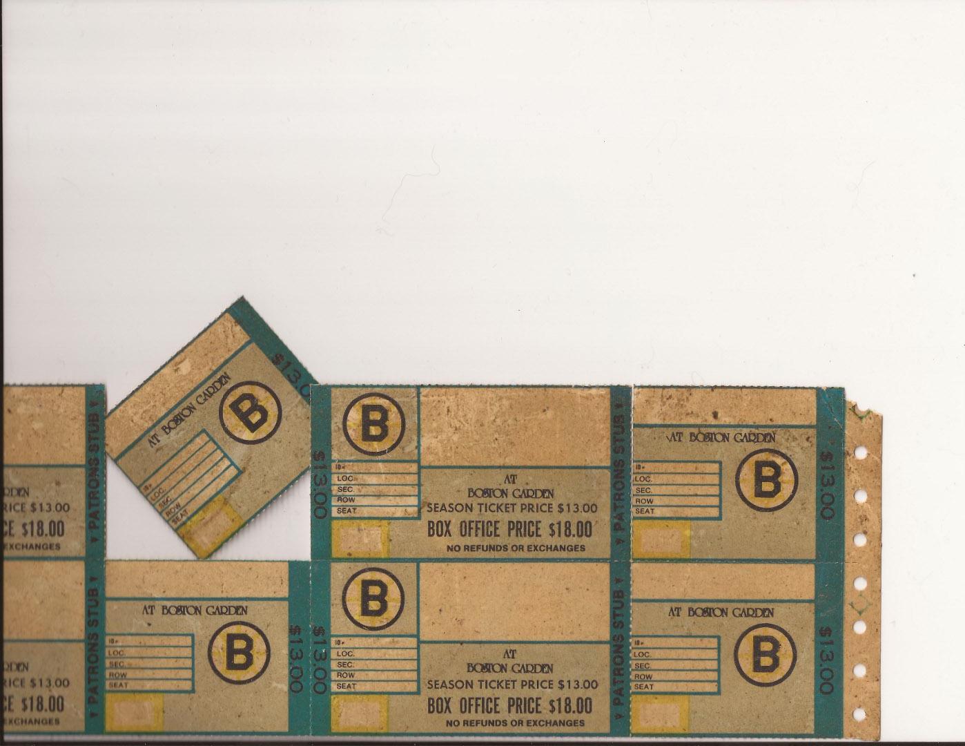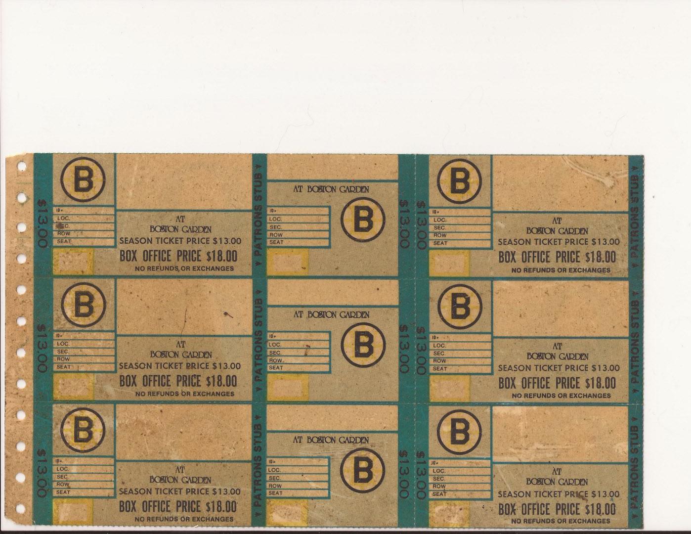I found these sheet of blank Boston Bruins tickets with some printer holder tabs for like a dot matrix printer. My guess is they could have been from the office where tickets where printed as needed. No sure. By the price alrady on them they most likely come from the old boston garden. I have yet to see them this style in stub, full, or sheet on ebay or web so might be hard to track down and may be rare. on back it says globe ticket co. you can see all the writings front and back to figure out how old and appraisal. thanks fot the help.