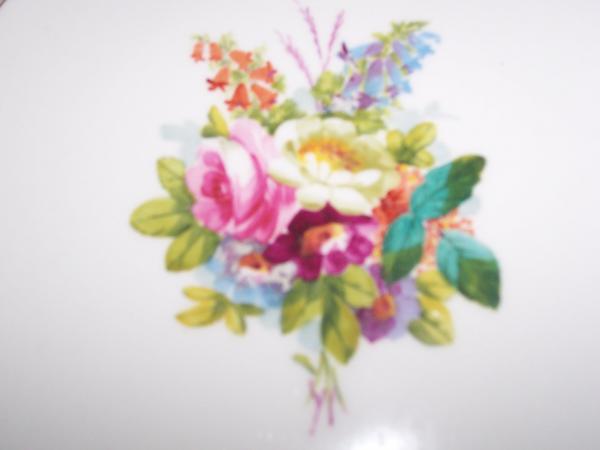 Made in England; 6 fruit plates, each bearing a different central motif. 2 stands as in photo, and 1 stand with taller pedestal. Turquoise rim with gold overlaid design. Possibly hand-painted. I would like to know what they are worth.