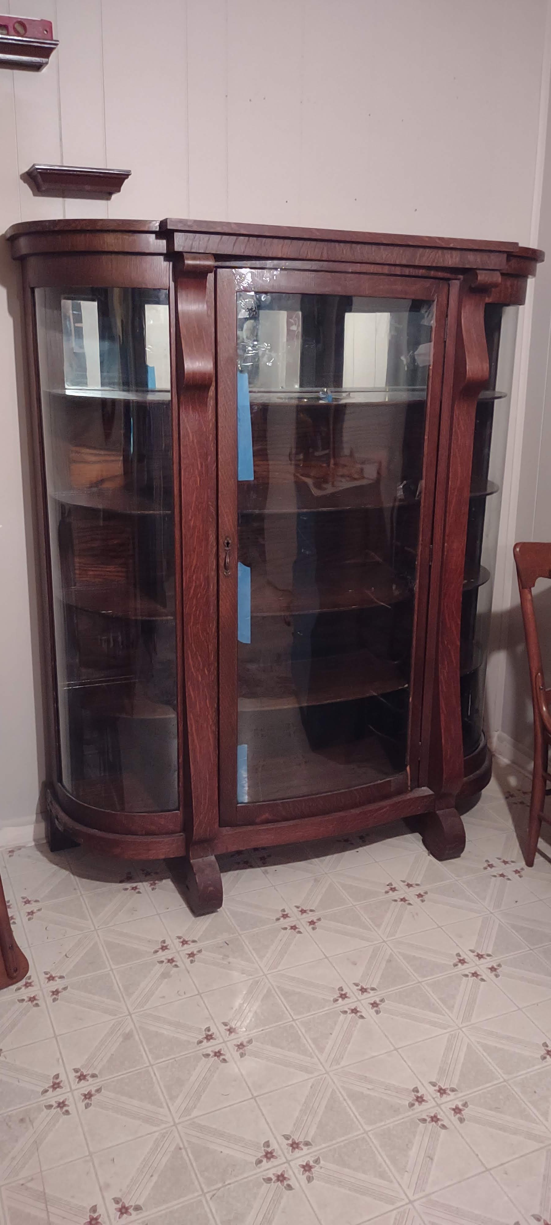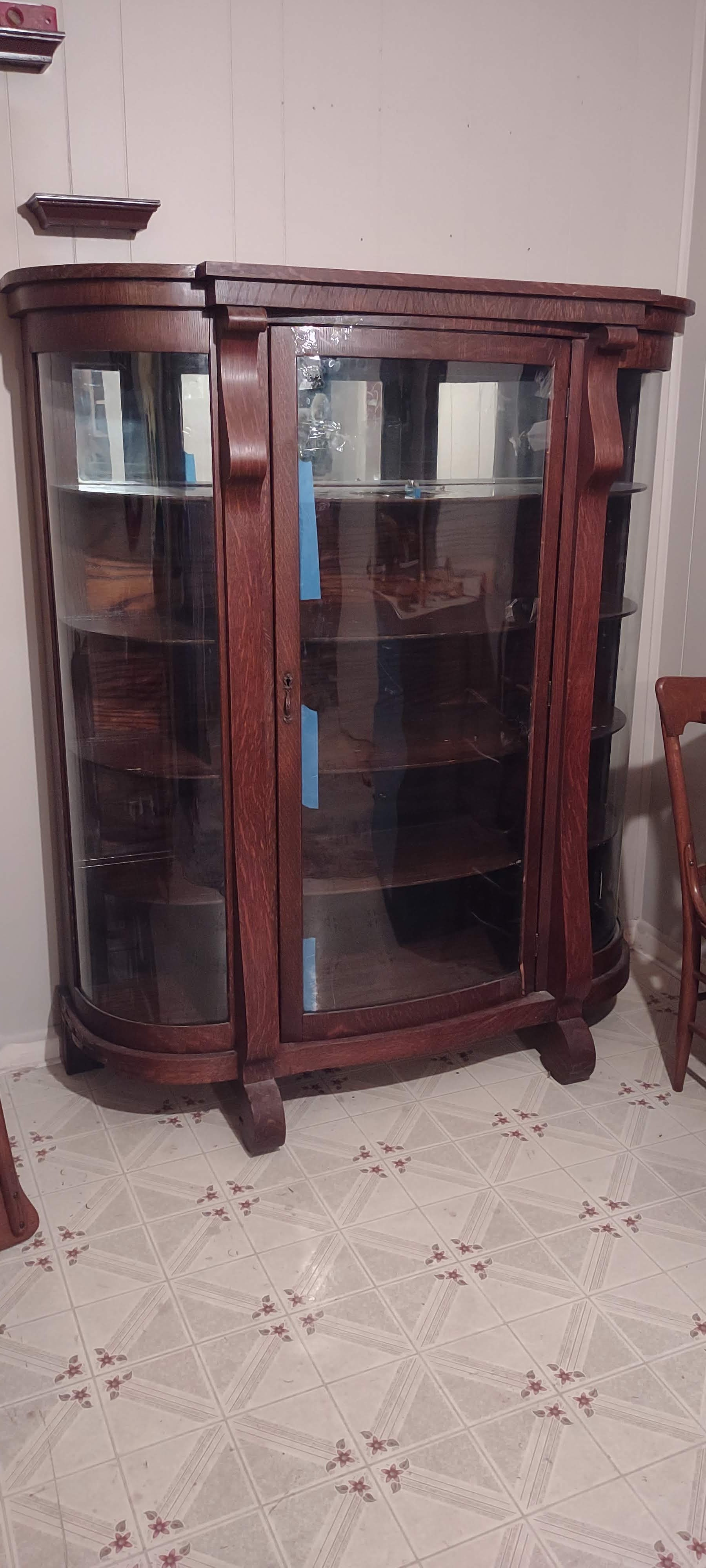 This is a bowed glass display cabinet. It has 4 wooden shelves inside and a mirror inside the back. It's 1/4 sawn Tiger Oak. It has the #13 carved on the inside bottom shelf