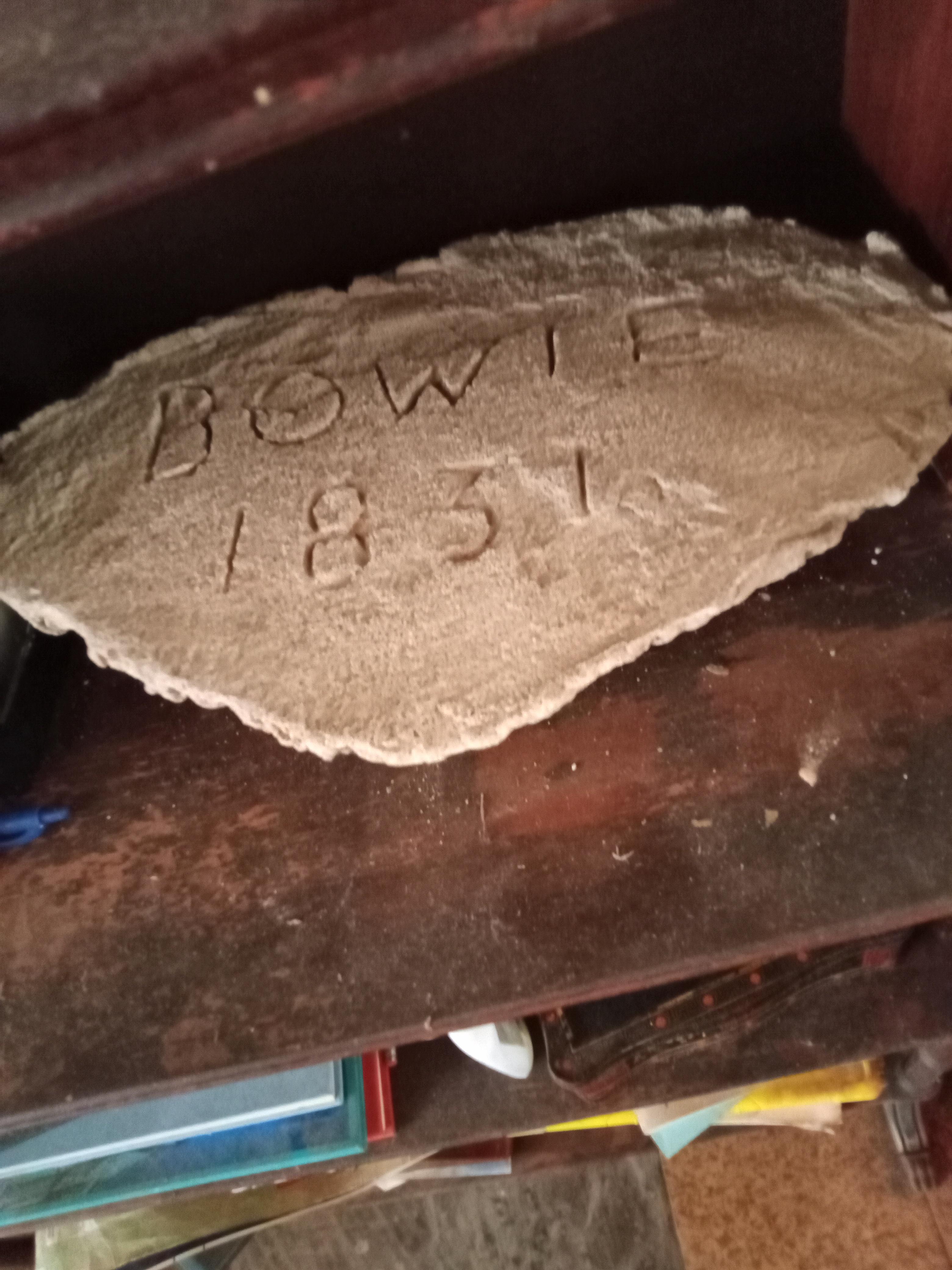 I dug up a limestone foot long 20lb rock that has an engraving. BOWIE 1831. I live in Bexar County San Antonio and I did research. I believe it's Alamo Hero James Bowie's personal carving