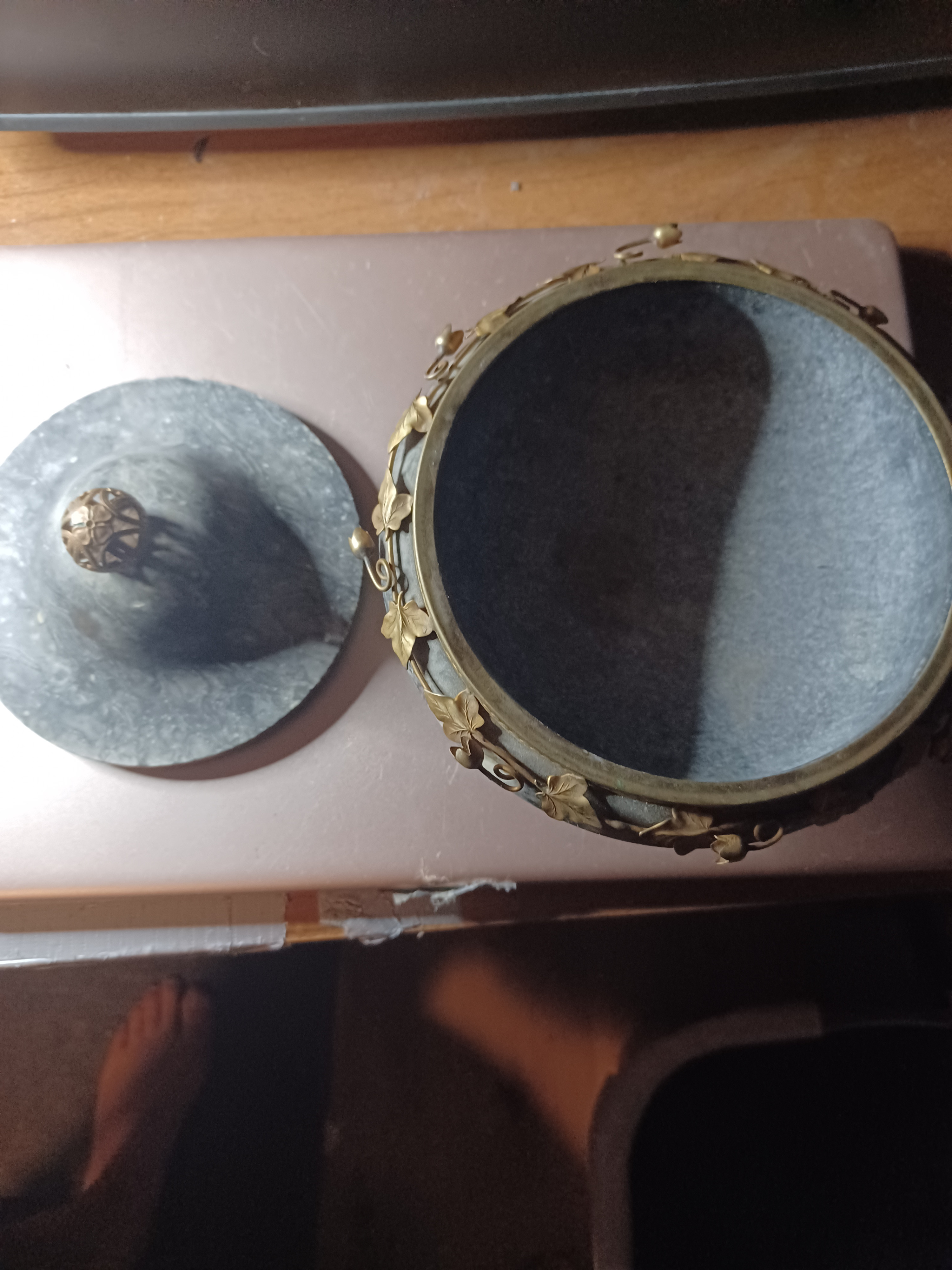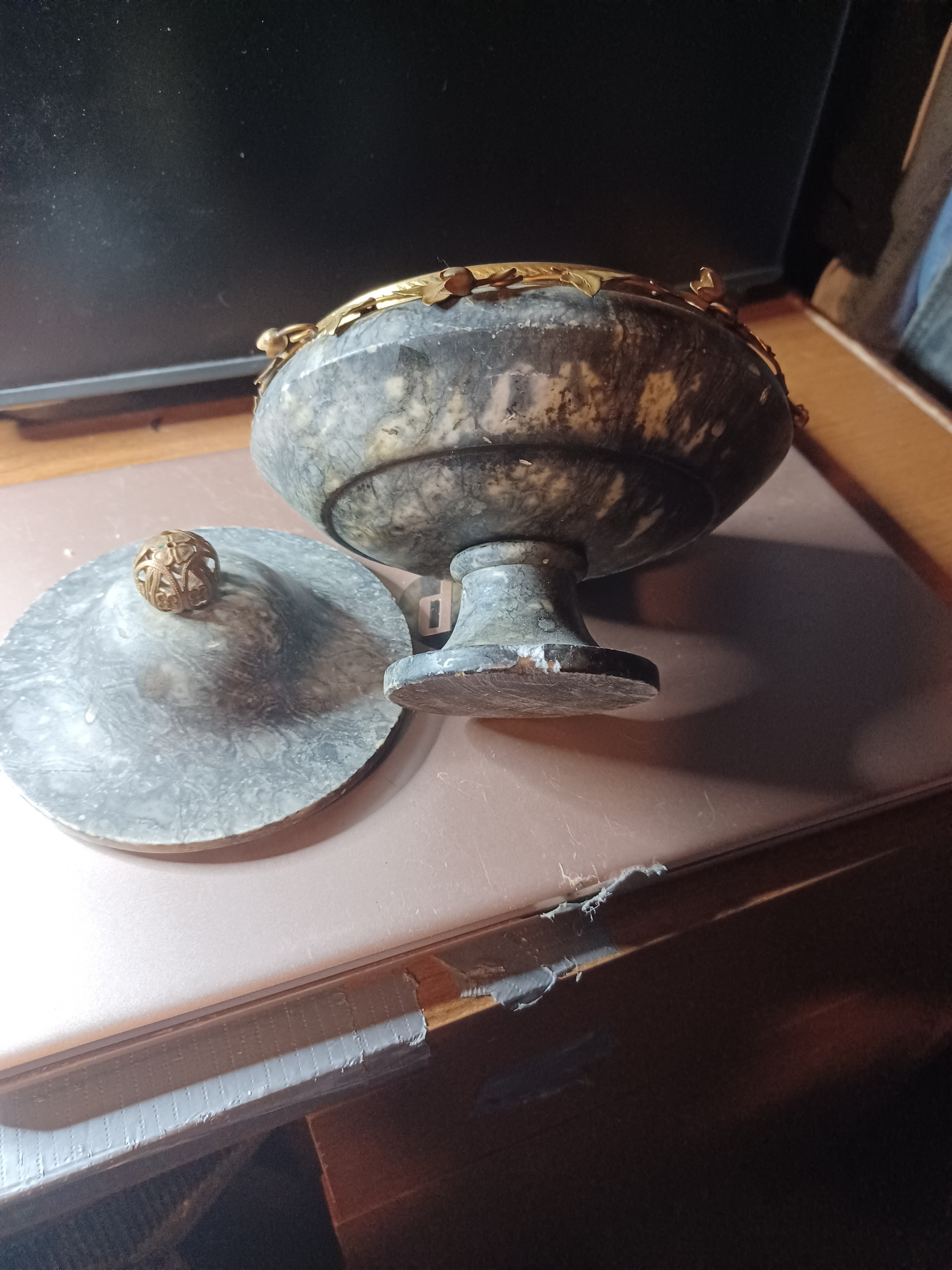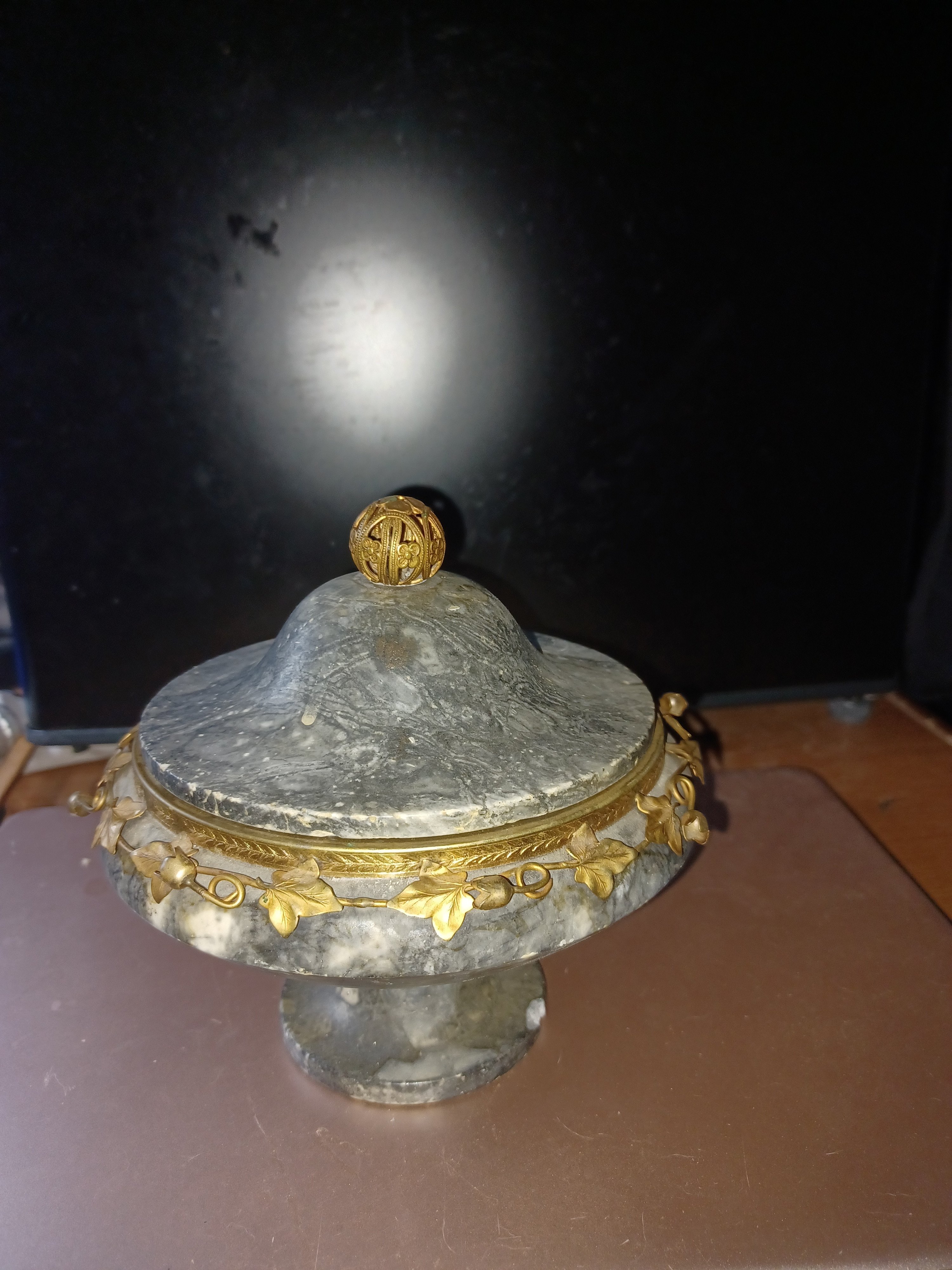 Item Description: The object presented is a decorative lidded bowl made of what appears to be a type of dark gray or black marble, with gilt bronze (ormolu) embellishments, featuring a garland motif. The lid is adorned with an intricately designed spherical handle, also in gilt bronze. The craftsmanship suggests it was made as a decorative centerpiece or a small storage vessel for items like jewelry or potpourri.